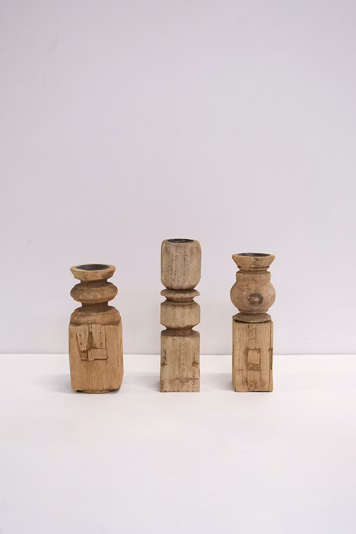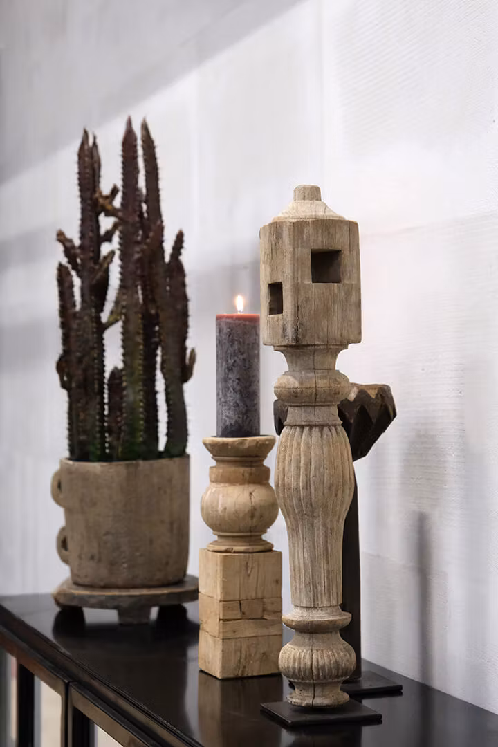 Ljusstake i trä, där toppen härstammar från ett gammalt bordsben. Ljusstaken blir snygg med ett blockljus på ditt bord eller på fönsterbrädan tillsammans med krukor och växter. Stativet ger en rustik och personlig touch till din inredning.