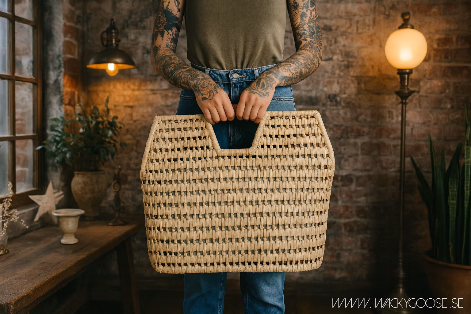 Varje exemplar är unikt och flätat för hand av hantverkare på den afrikanska landsbygden. Storlek, färg och form varierar.