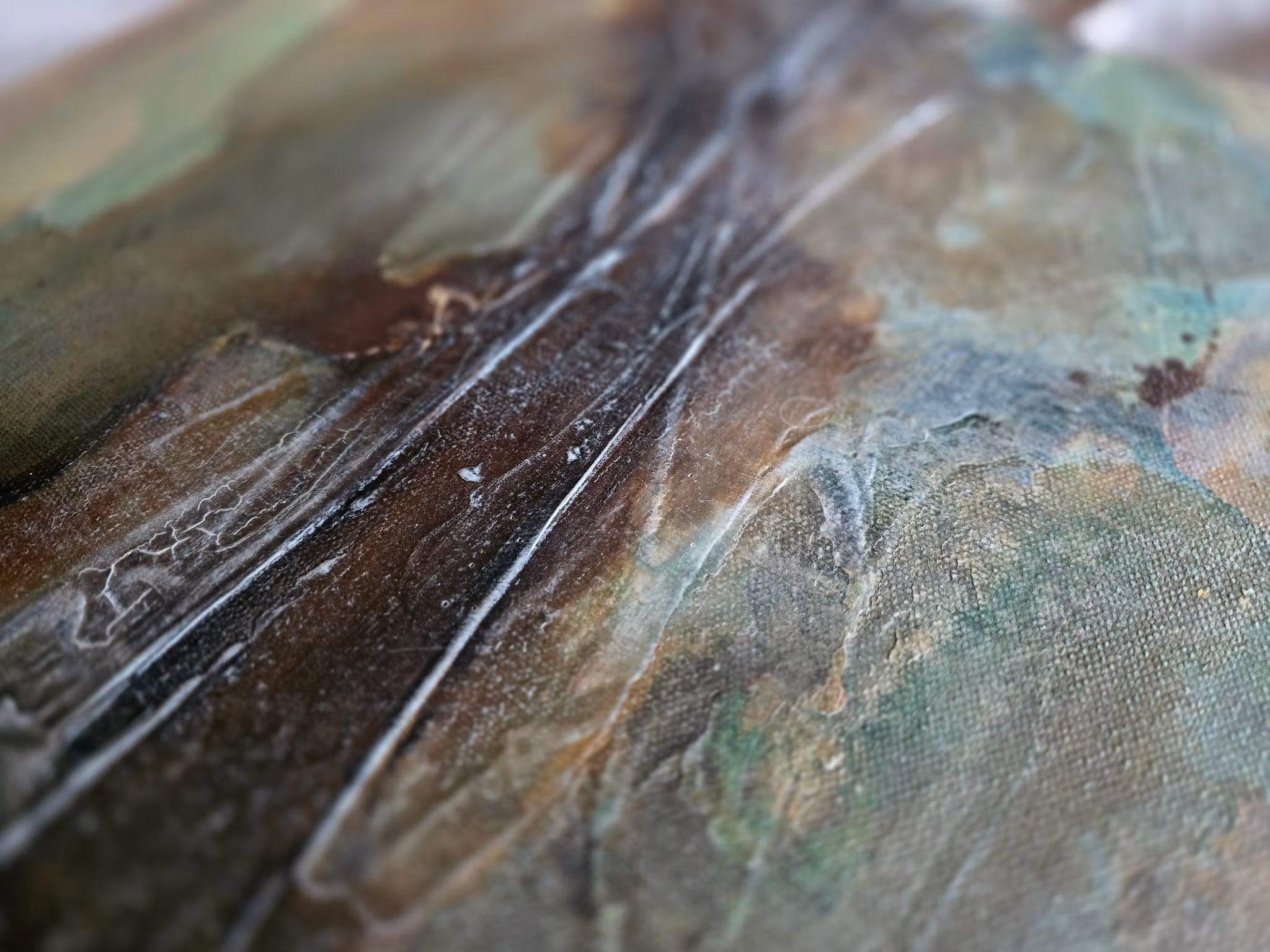 "Forgotten Terrain" från kollektionen 'Veins of Earth' är en abstrakt målning som framkallar känslan av väderbiten jord och tidsförbrukade texturer, likt ett dolt landskap som långsamt avslöjas under lager av damm, sten och dimma. Nyanser av mossgrönt, dämpat brunt och mjukt grått smälter samman och skapar en jordnära men ändå eterisk atmosfär. De subtila sprickorna och upphöjda texturerna antyder tidens gång, erosion och minne, som om naturen själv har målat berättelsen.