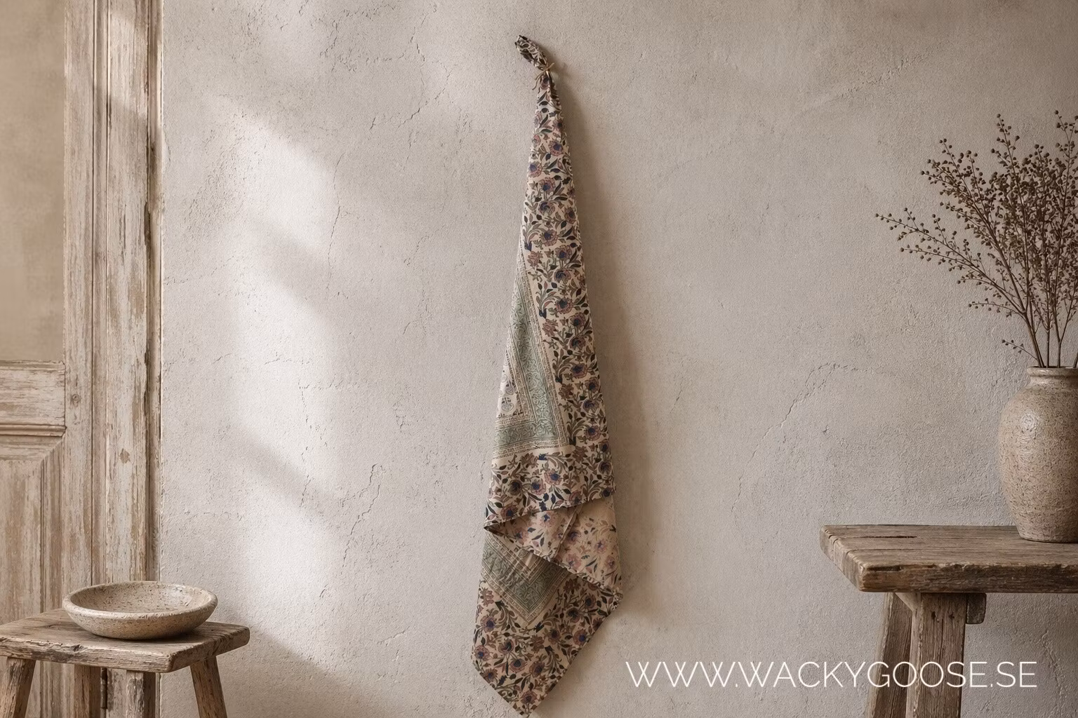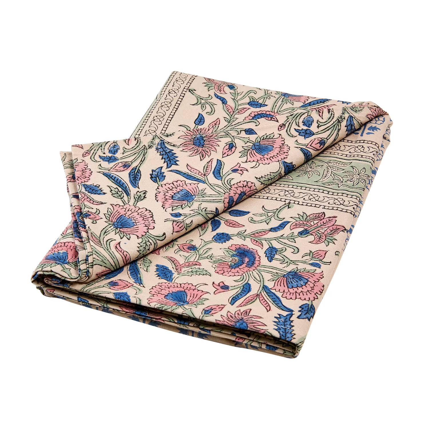 Vacker bordsduk med handtryckta blocktrycksmönster.