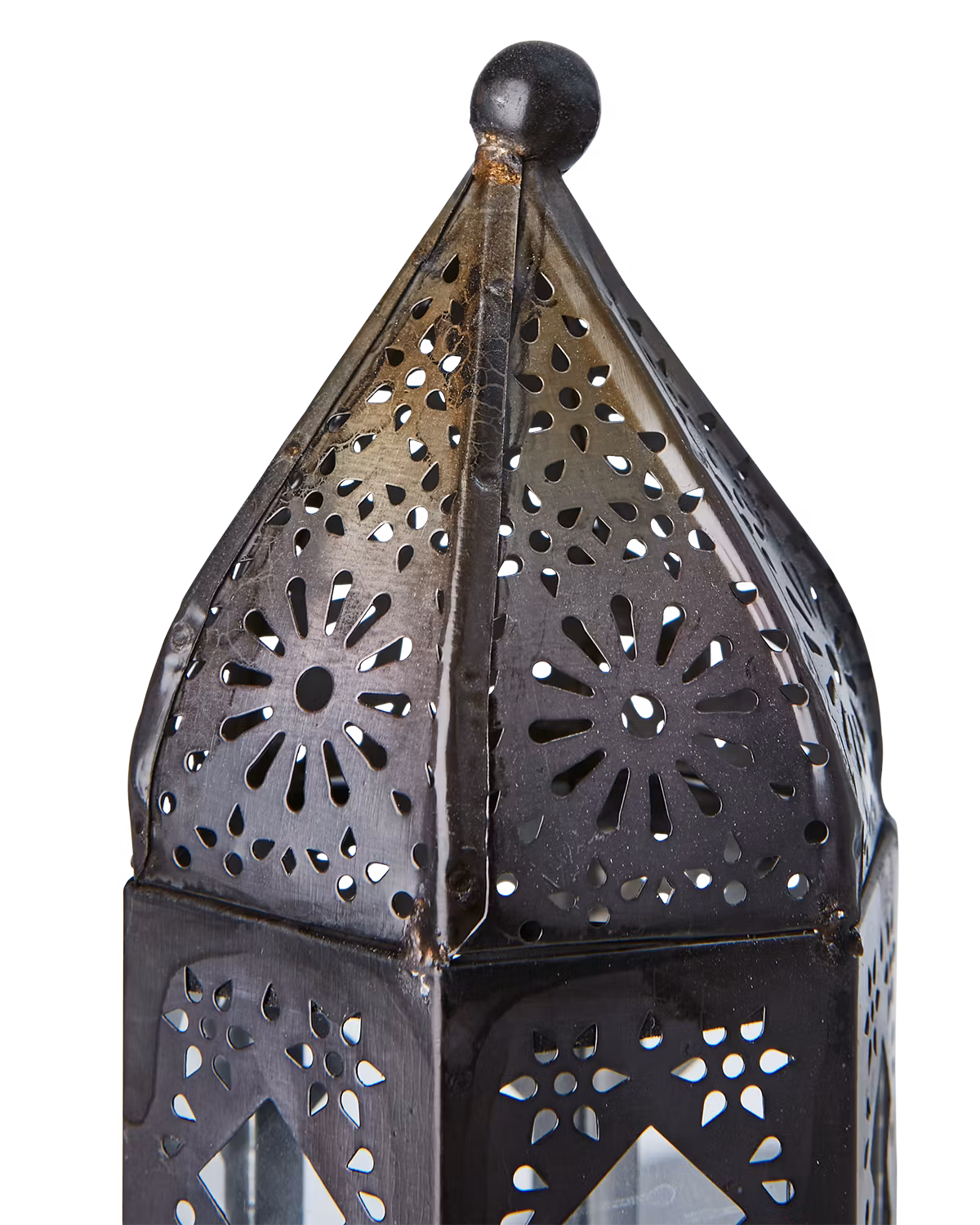 En vacker och bohemisk värmeljuslykta tillverkad i järn och glas med stansat mönster som sprider ett stämningsfullt ljusspel. Den rustika designen kombinerar råa metallinslag med glaspartier, vilket ger en varm och inbjudande atmosfär. Perfekt som dekorativ detalj på fönsterbrädan, soffbordet eller hängande i en krok.