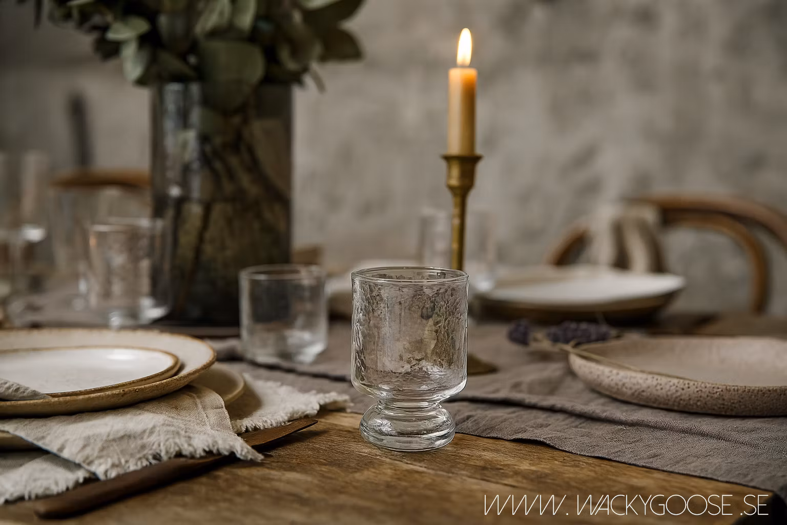 Vattenglas i klart glas bjuder på en harmonisk balans mellan funktionalitet och skönhet. Det munblåsta glaset har en subtil struktur som gör varje exemplar unikt, samtidigt som den minimalistiska designen gör det till ett tidlöst val. Perfekt för såväl vardagsbruk som stilfulla dukningar.