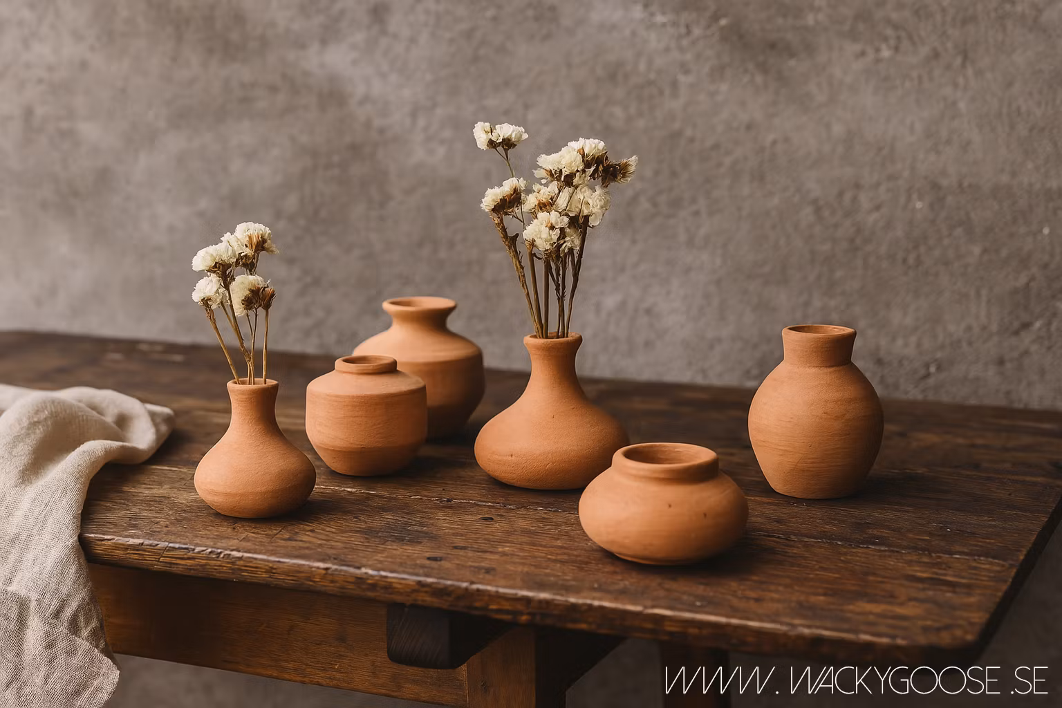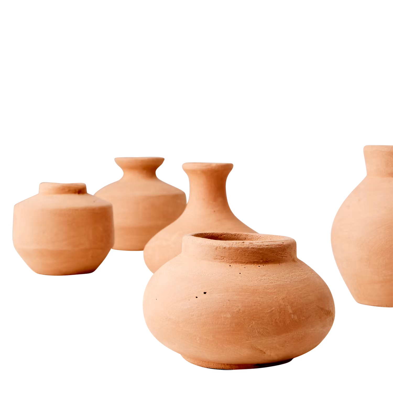 Set med 6 handgjorda urnor i terrakotta, små vaser i naturton