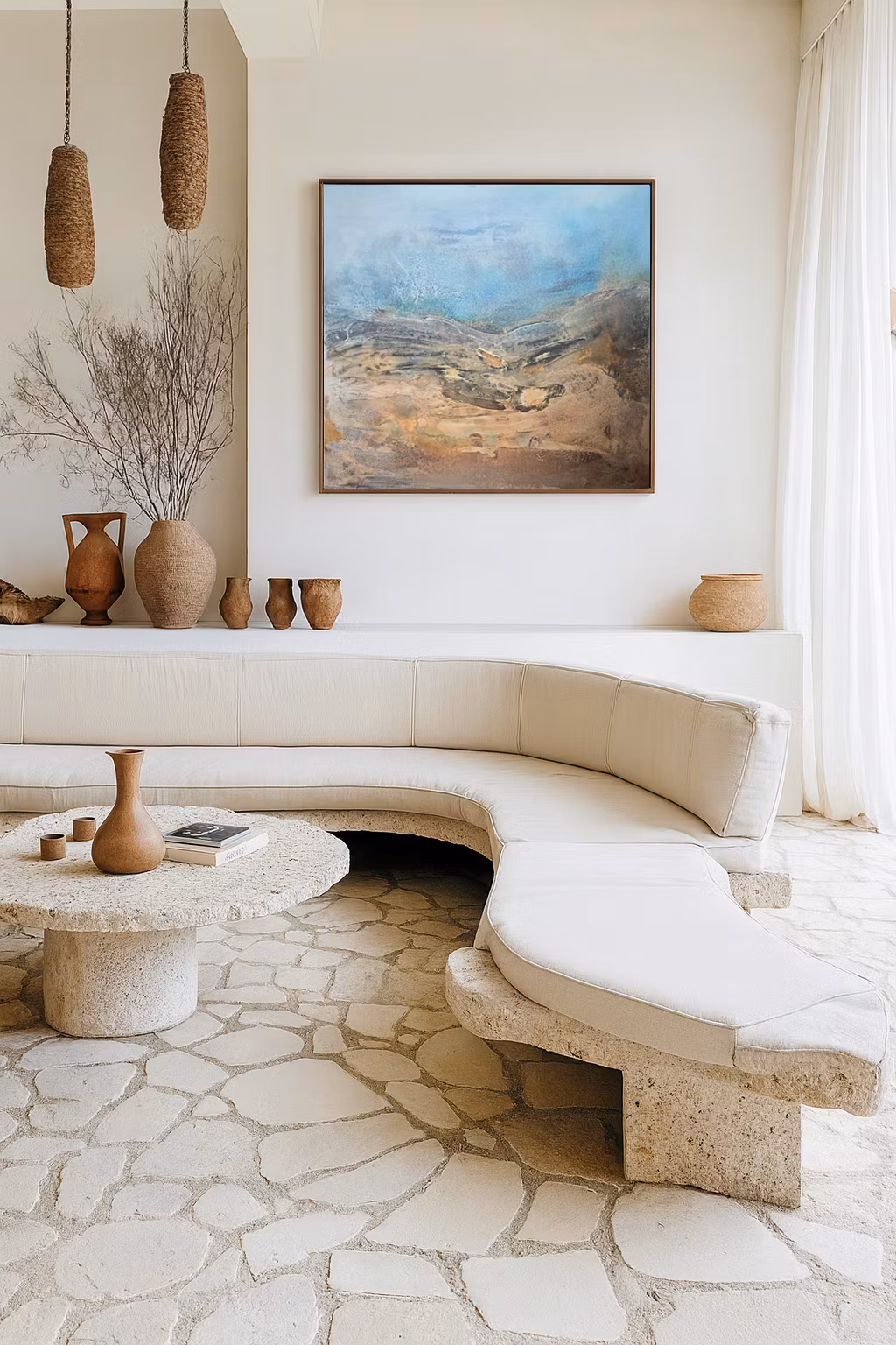 "Whispering Dunes" från kollektionen 'Veins of Earth' är en abstrakt målning inspirerad av ökenlandskapets skiftande skönhet. Varma och sandiga bruna och gyllene jordtoner flyter över i mjuka blå nyanser och skapar intrycket av oändliga sanddyner under öppen himmel.