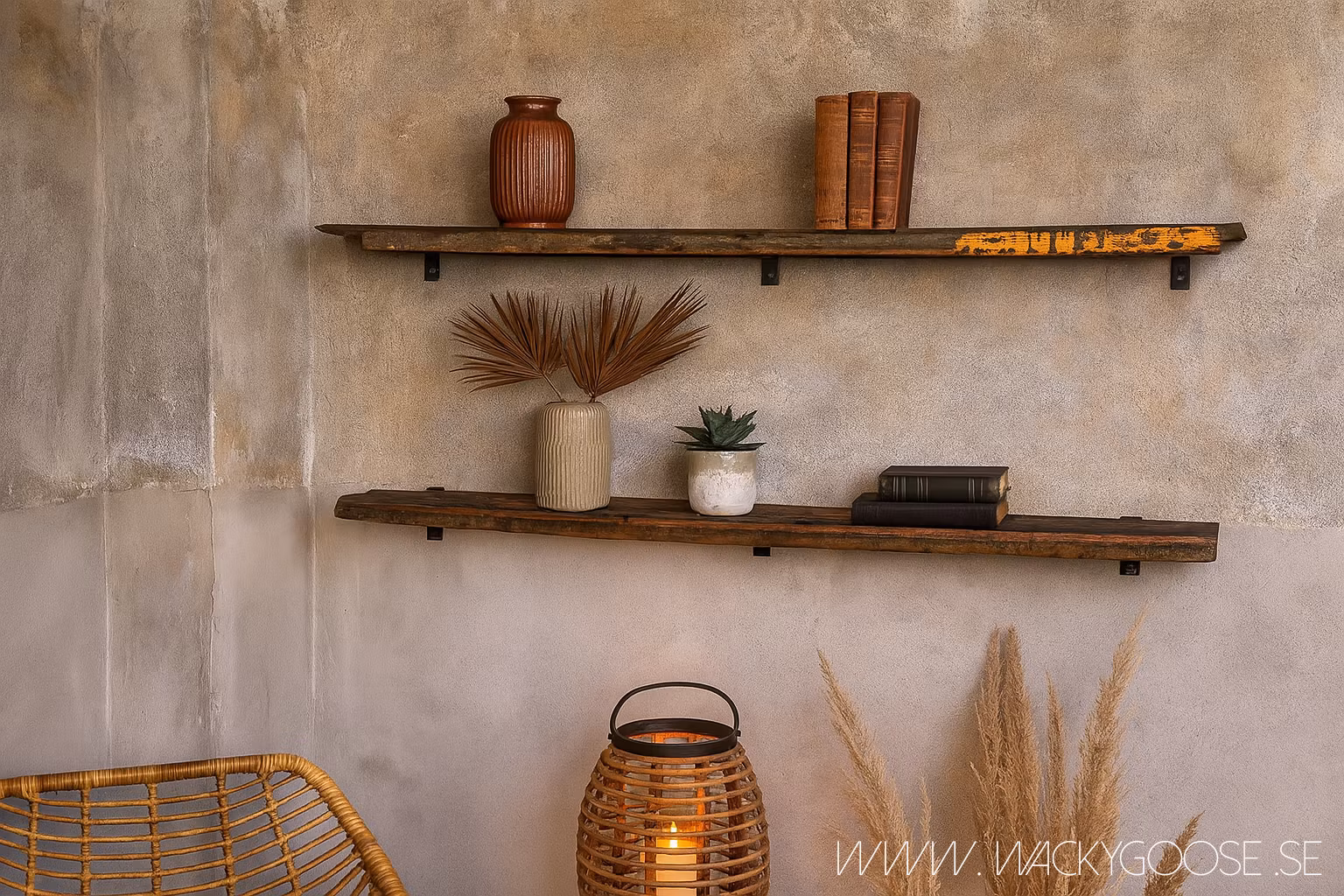 Denna rustika hylla är gjord av återvunnet trä, vilket ger den massor av patina och charm. Hyllan är cirka 2 meter lång och har ett robust och industriellt utseende, vilket gör den perfekt för att ge ett rum karaktär och autenticitet. Träytan framstår som rå och obehandlad och bär tydliga tecken på slitage och historia.