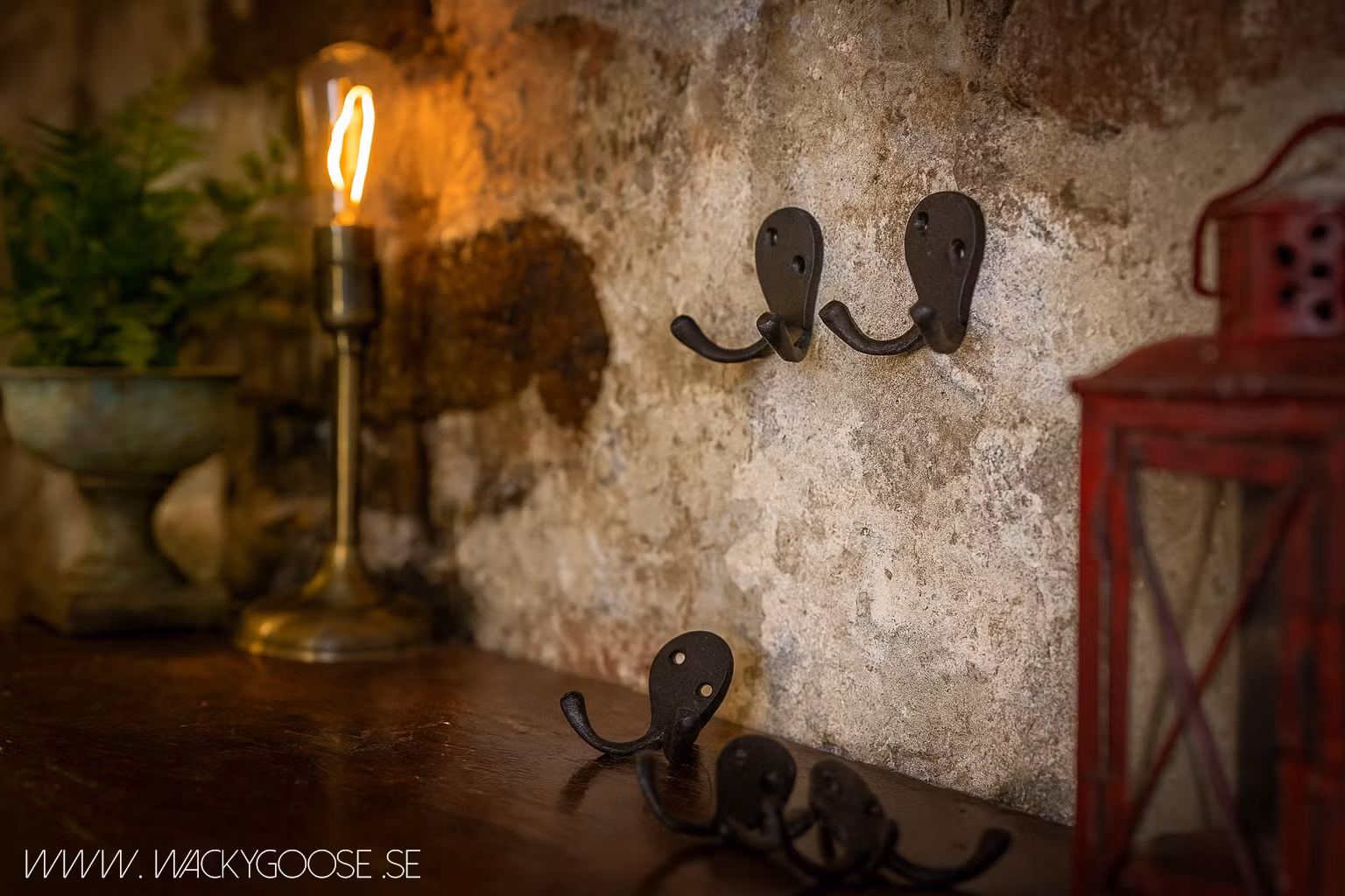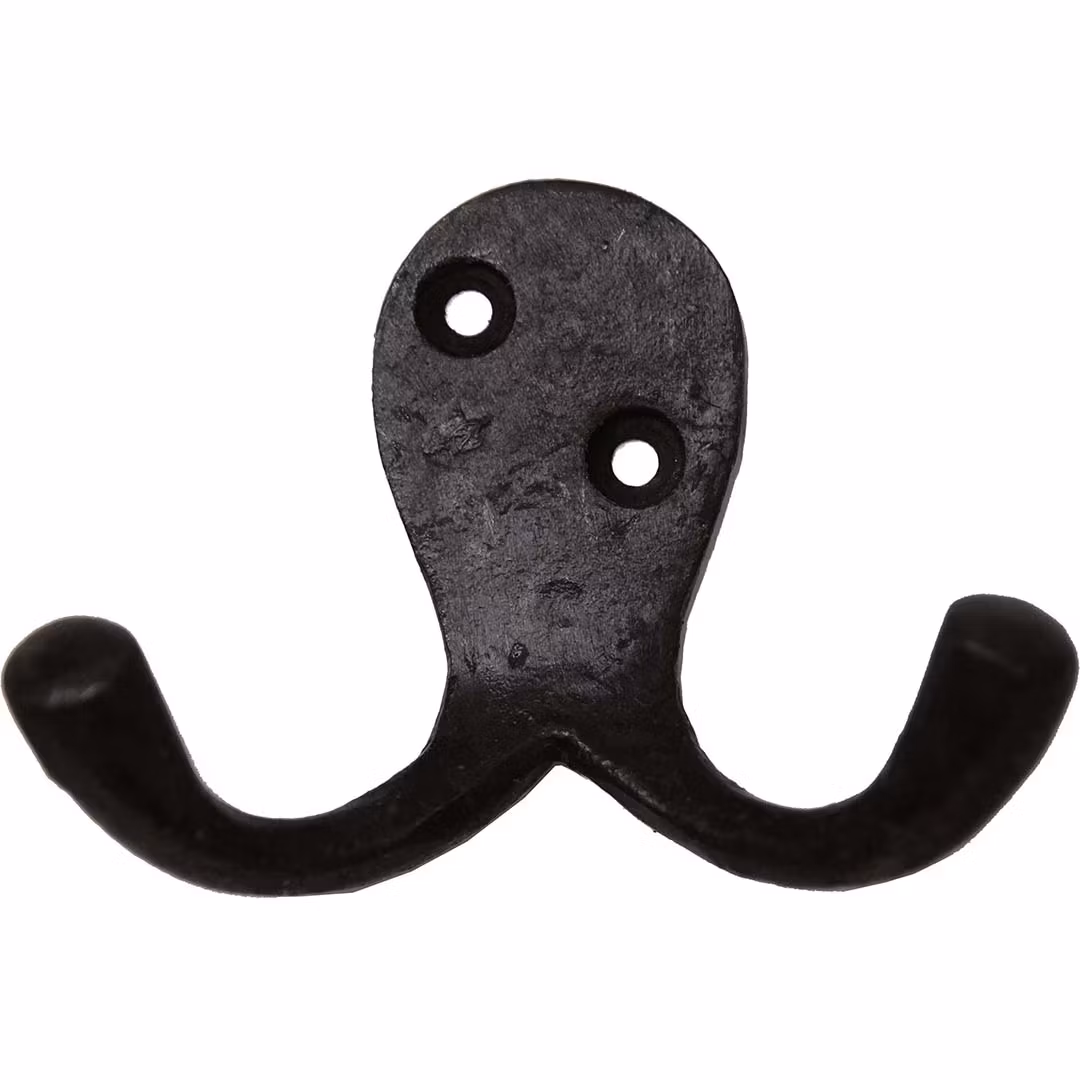 Rå och enkel dubbelkrok i järn. Använd den till exempel till dina kökshanddukar eller häng flera bredvid varandra i din garderob för jackor. Kroken har två hål så att den kan monteras säkert på väggen.