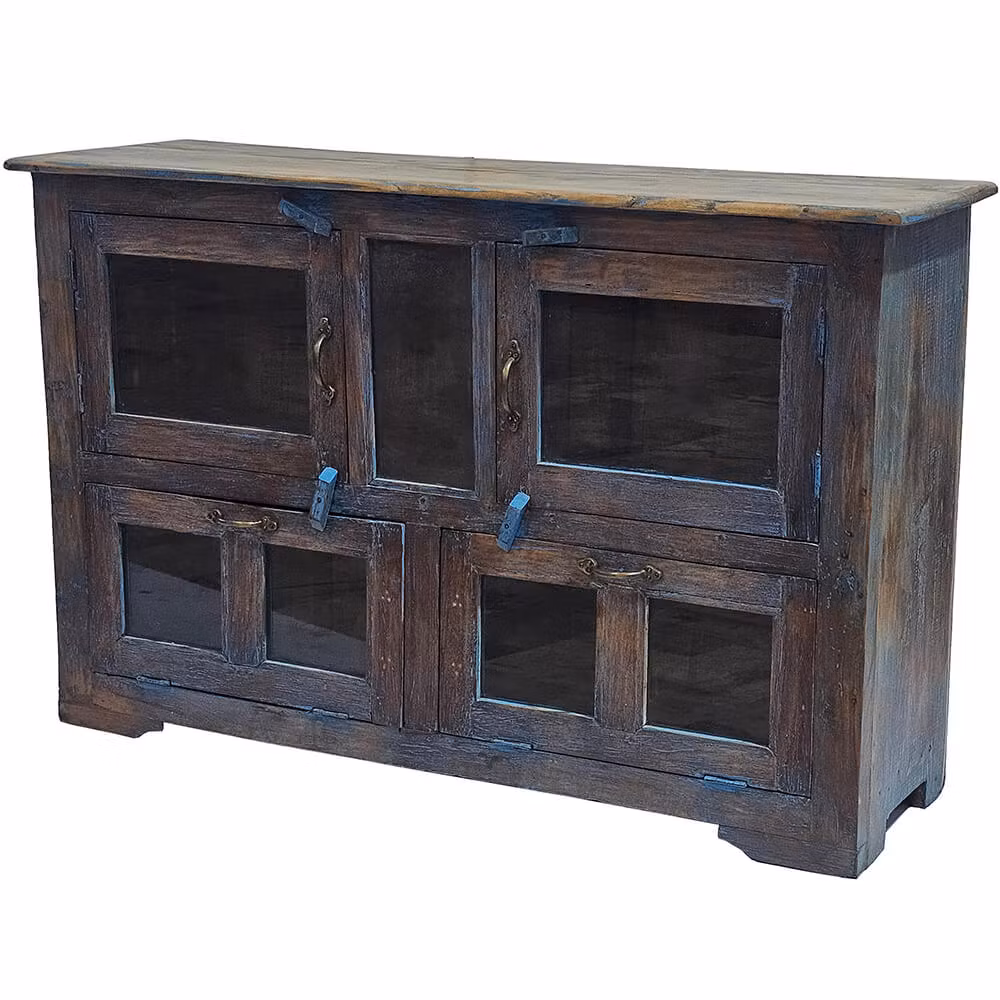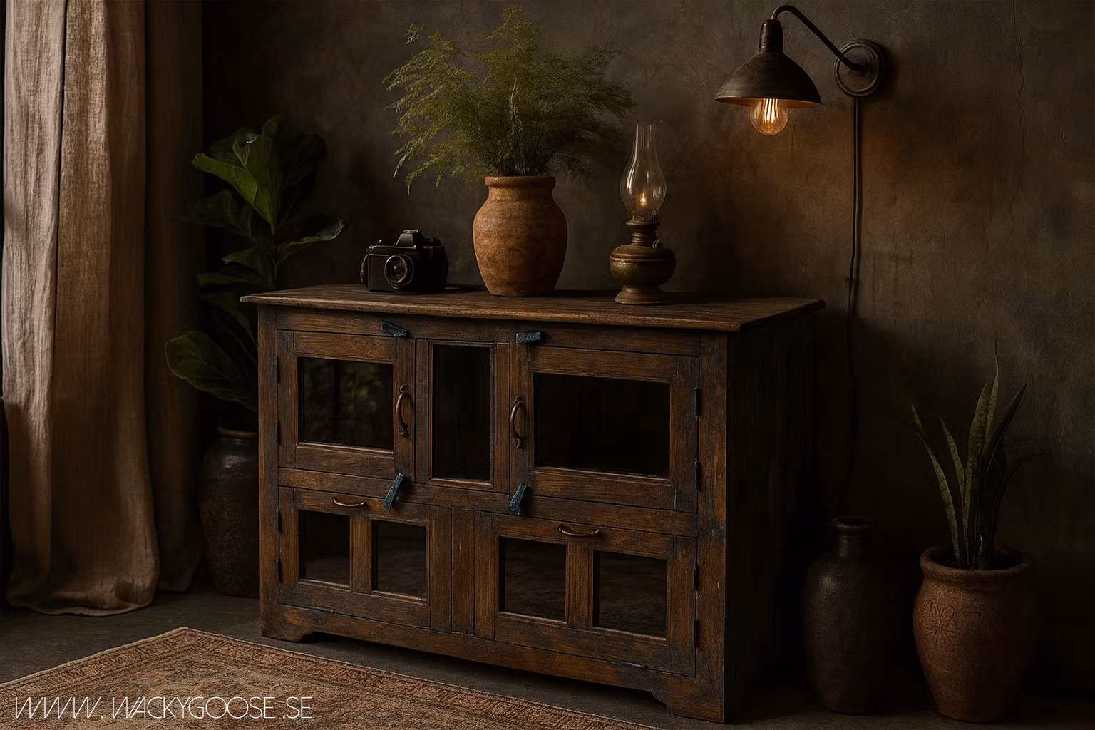 Denna skänk är allt en ny möbel aldrig kan vara. Sliten på precis rätt sätt. Full av historia. Och helt oemotståndlig. Det är tillverkat av massivt trä och har fyra dörrar med glas som låter dig visa upp dina favoriter utan att gömma undan dem. De rustika beslagen och handtagen sätter pricken över i:et och ger en industriell twist till den annars klassiska designen.