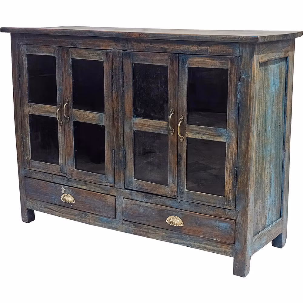 Denna gamla skänk är allt annat än ordinär. Med sina fyra glasdörrar, två lådor och en djupt patinerad yta i mörka trätoner med blåaktiga inslag, utstrålar det historia och hantverk. Skänken är tillverkad av trä och bär stolt sina ålderstecken, såsom färgspel och ojämnheter. Precis det som gör den helt oemotståndlig. De fina järnhandtagen ger en fin kontrast till det råa yttre. Här möter vintage funktionalitet, och resultatet är ett skänk som både kan användas och beundras. Använd skänken i köket för att visa upp keramik, i restaurangen som en del av en rå monter eller hemma för vaser, böcker eller favoriter med själ. Den är perfekt för dig som älskar möbler med kant, patina och historia.