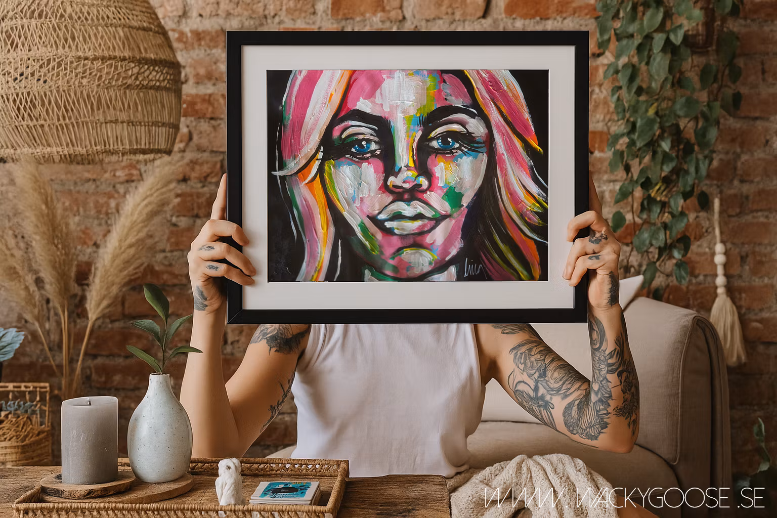 Perfekt att placera i hall, vardagsrum, ateljé eller kontor - den här porträttavlan i starka färger blir garanterat rummets mittpunkt.
