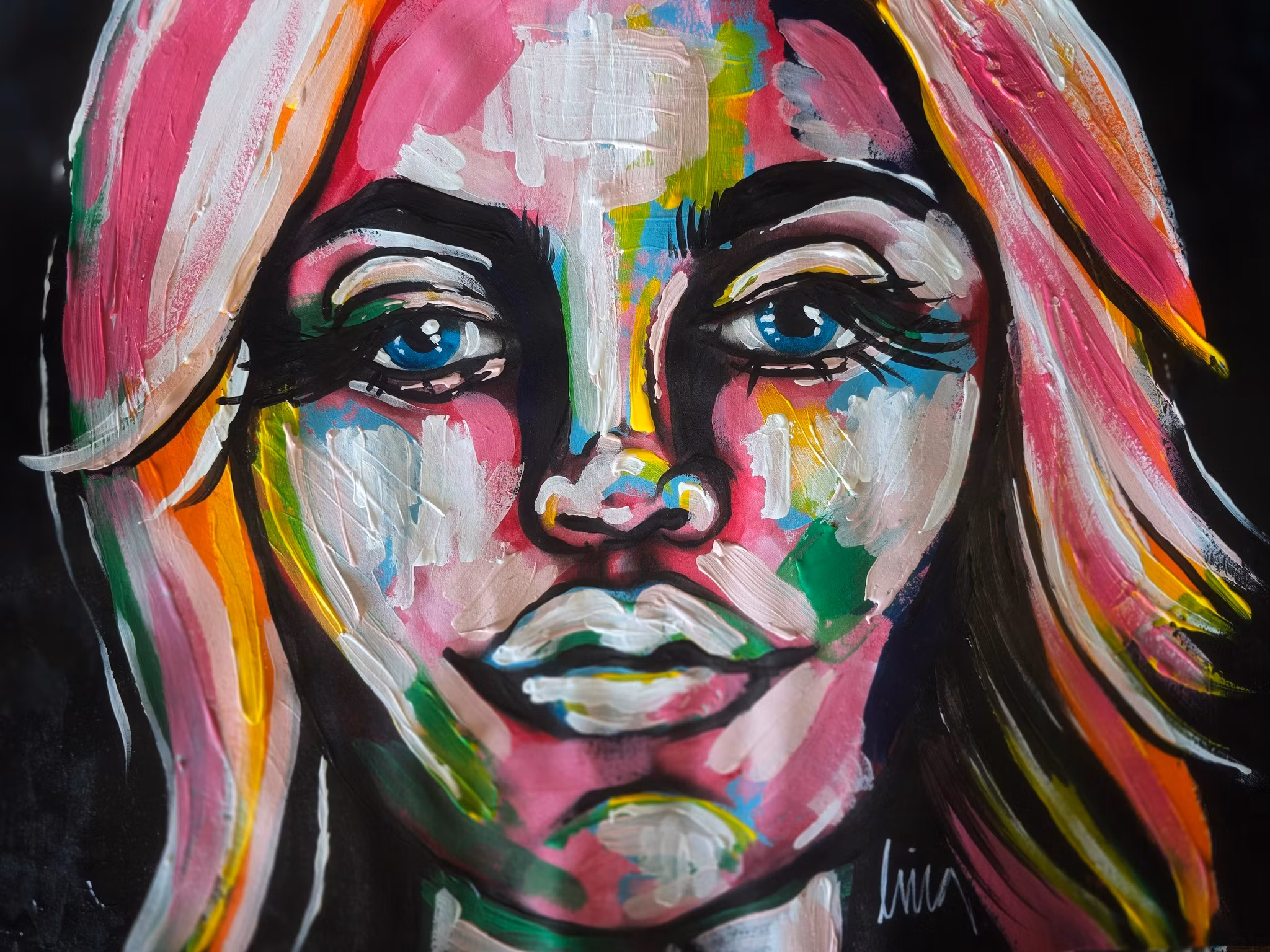 Låt ditt hem få nytt liv med denna expressiva färgstarka tavla föreställande ett konstnärligt kvinnoporträtt mot djup svart bakgrund. Denna målning är ett unikt konstverk där starka penseldrag och livfulla färger samspelar i en kraftig tolkning av känsla och styrka.