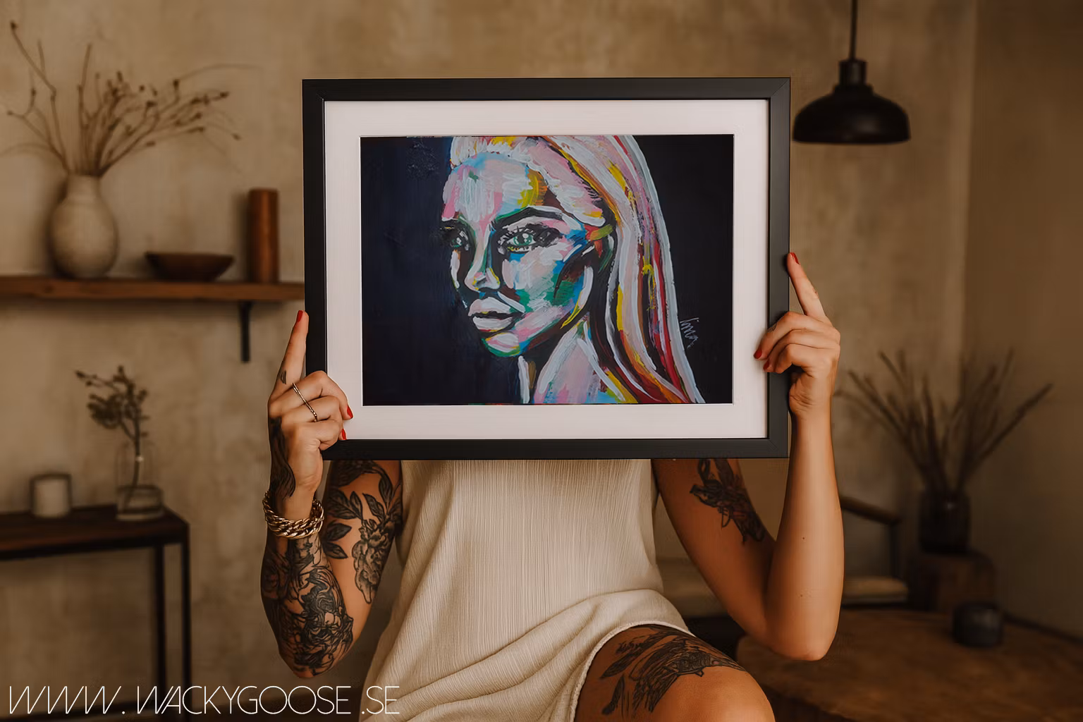 Perfekt att placera i hall, vardagsrum, ateljé eller kontor - den här porträttavlan i starka färger blir garanterat rummets mittpunkt.