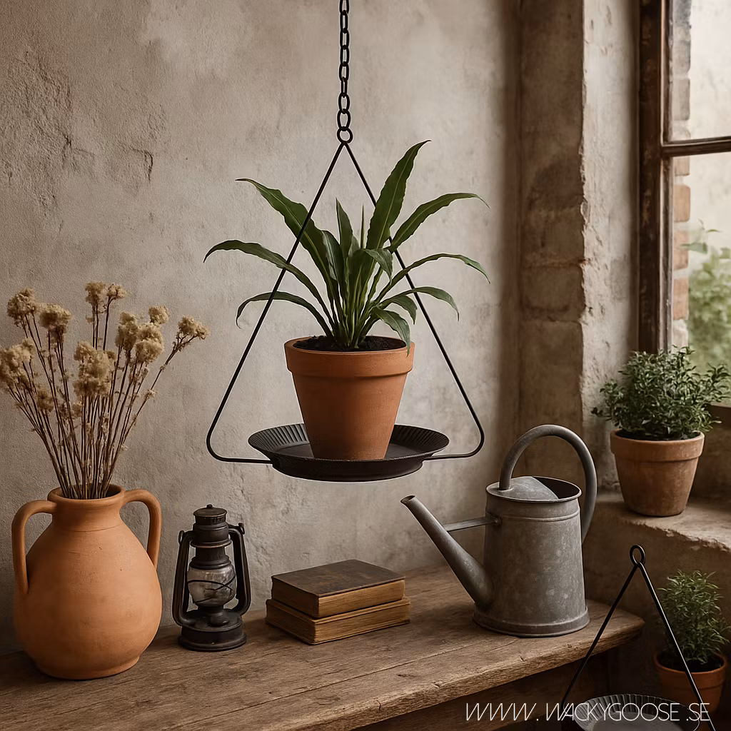 Terrakottakruka, rustik kruka, handgjord, återbruk, fat till kruka, järn, metall, hängkruka.