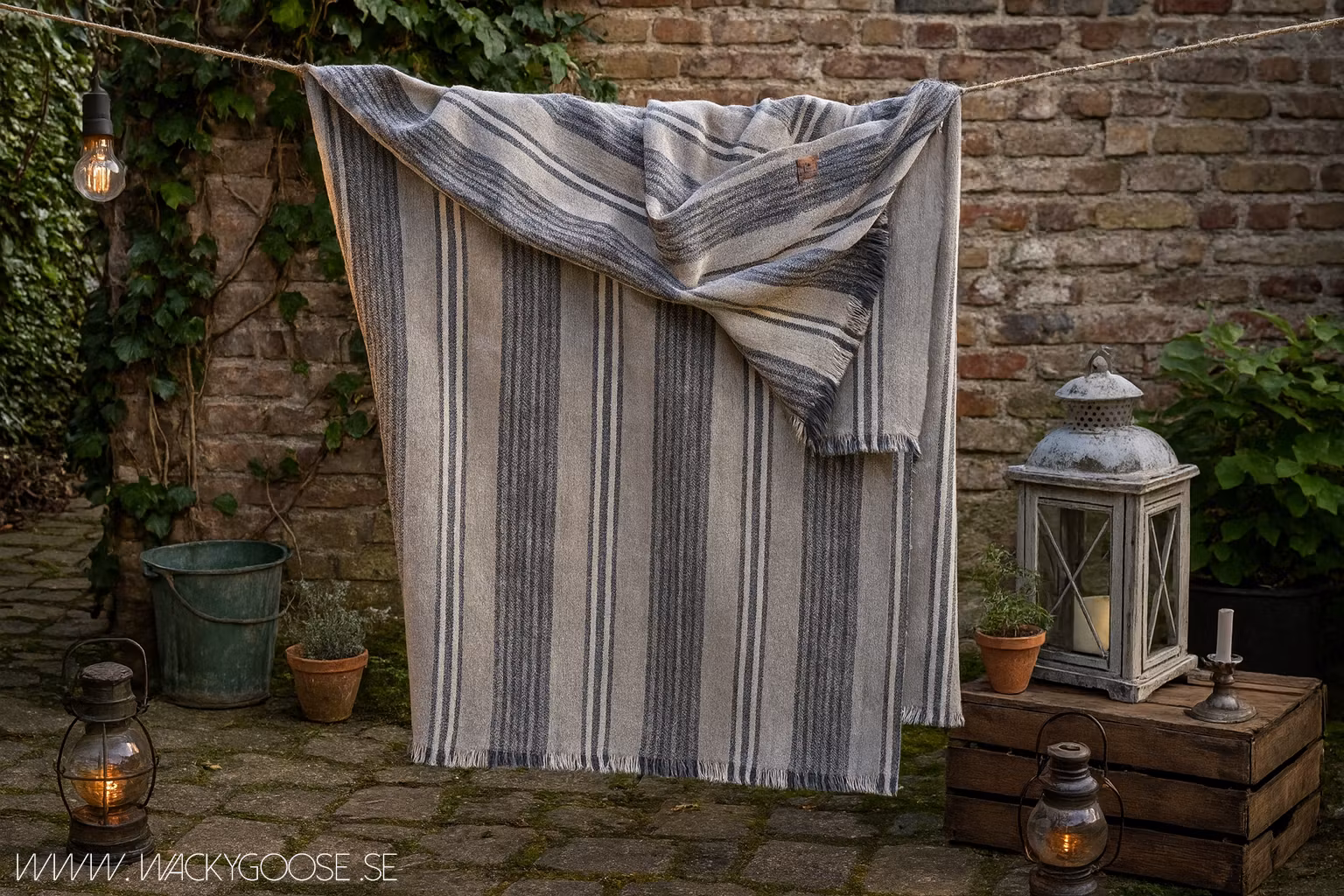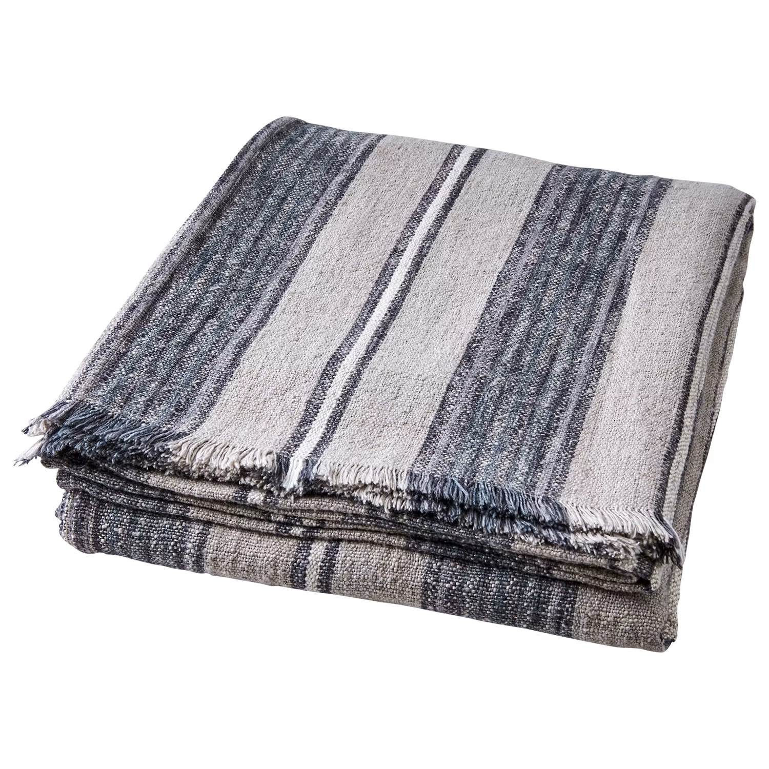 En exklusiv filt/duk i generös storlek tillverkad i en mjuk och hållbar blandning av bomull, linne, akryl och lyocell. Den naturfärgade basen bryts av med ett klassiskt randigt mönster i dova toner, vilket gör den till ett mångsidigt textilval som passar lika bra som duk på ett stort matbord som dekorativ pläd i soffan eller på sängen.