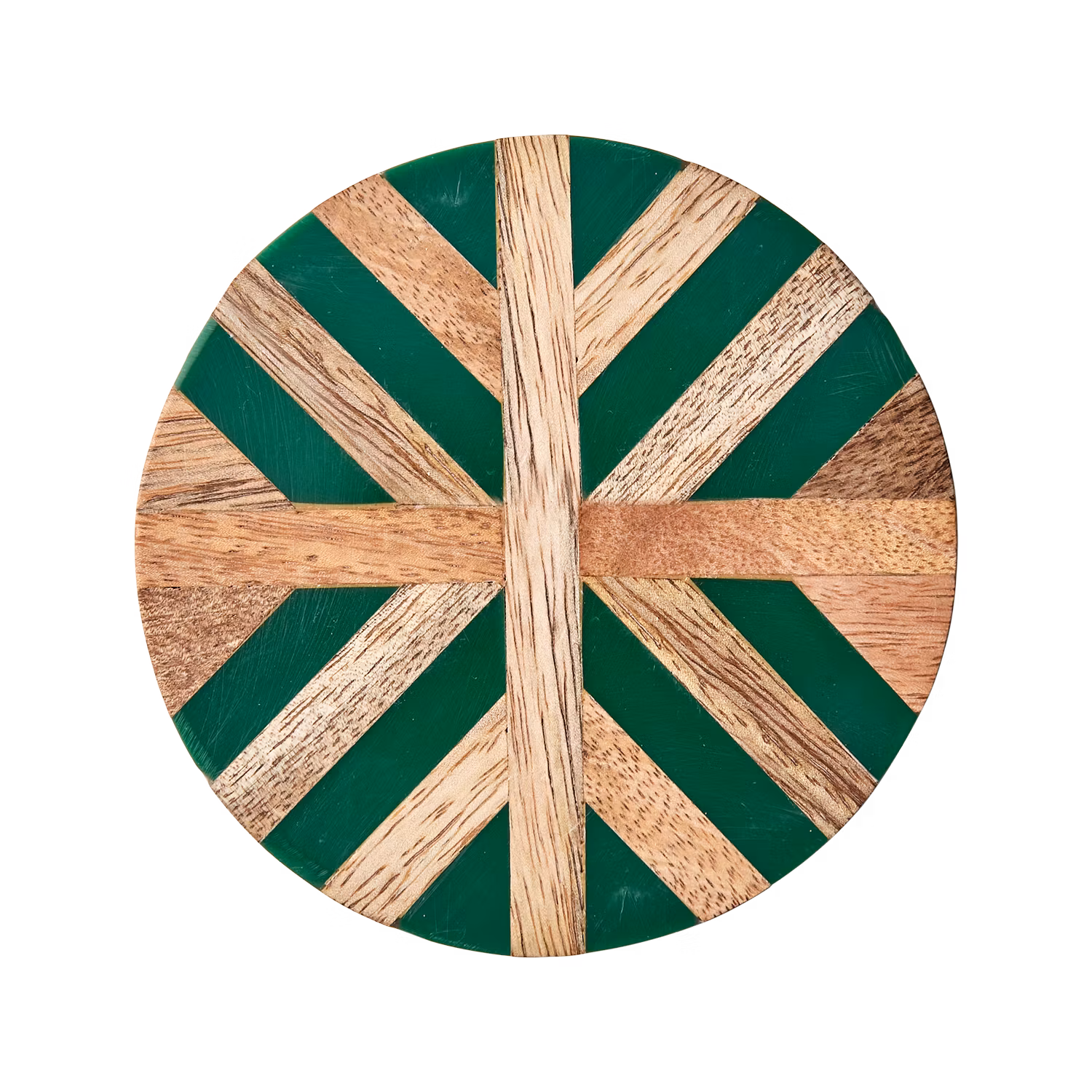 Ett stilrent tillskott till dukningen. Det är tillverkat i trä och resin, där det naturliga materialet kombineras med en mjuk färgton som skapar en harmonisk kontrast. Med sin runda form och släta yta skyddar det effektivt underlaget från ringar och fläckar, samtidigt som det adderar en dekorativ detalj till bordet. Perfekt för både vardag och fest, där varje detalj räknas.