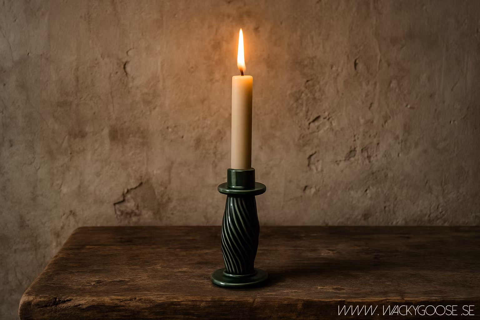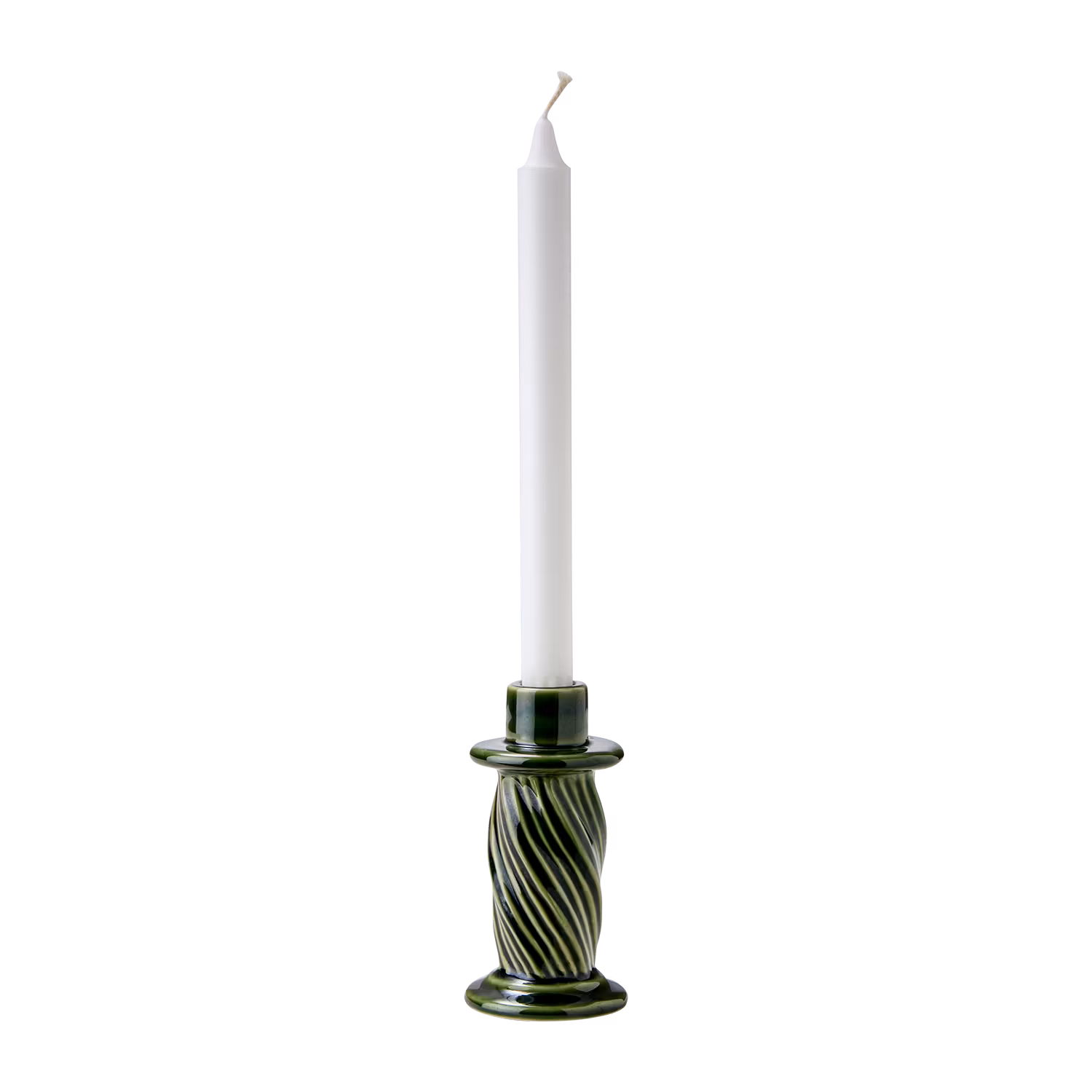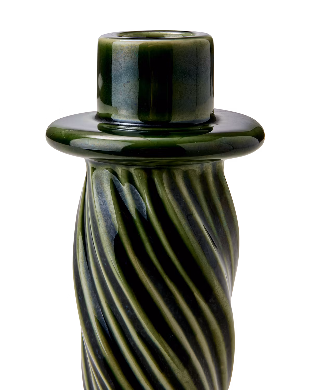 Den här ljusstaken i grön stengods förenar värme, hemtrevnad och naturlig enkelhet. Den stilrena formen och de jordnära tonerna gör den till en vacker inredningsdetalj som skapar en stämningsfull och mysig atmosfär – perfekt för höstens och vinterns dukningar.