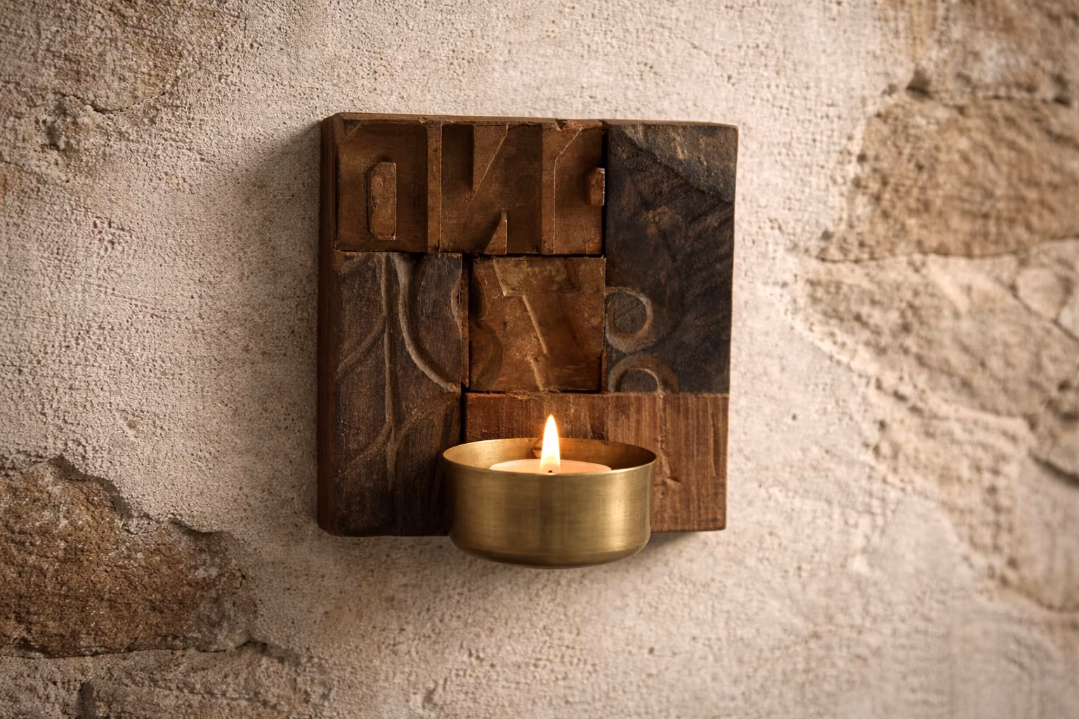 Handgjord ljuslykta för väggen, helt unik i trä och mässing.