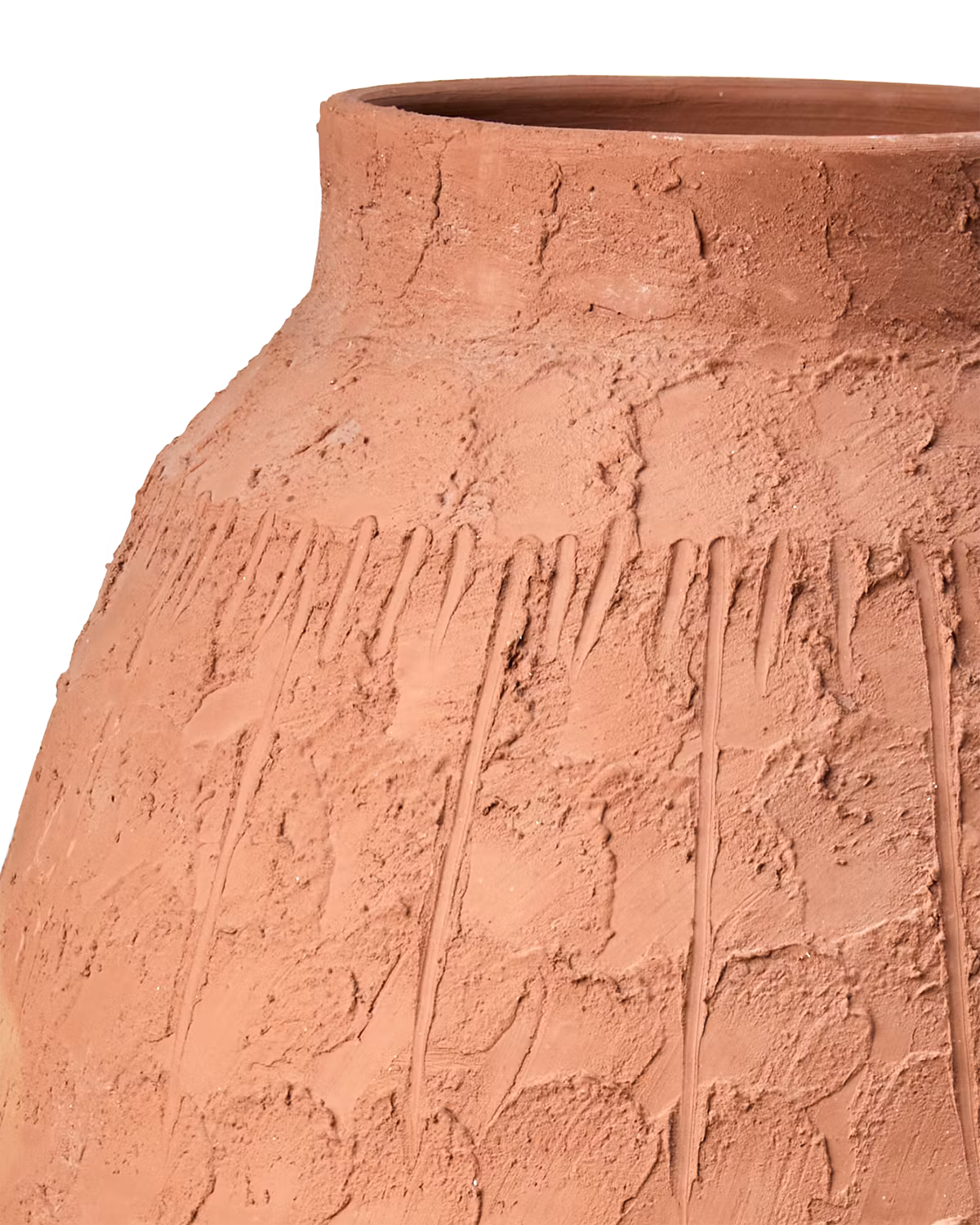 En storslagen urna i äkta terrakotta med en vackert skulpterad yta som för tankarna till traditionellt hantverk och sydländsk värme. Med sin generösa höjd på 46cm blir den en självklar statement-pjäs i ditt hem - lika vacker med pampagräs, torkade kvistar eller som ett konstnärligt objekt i sig.