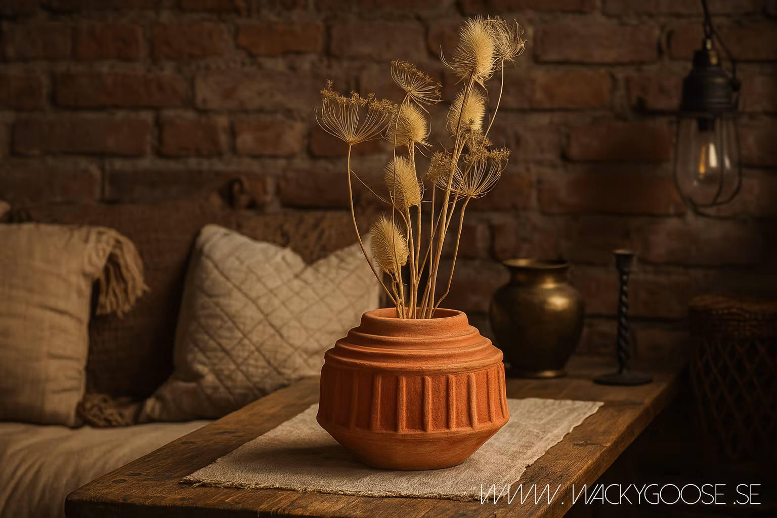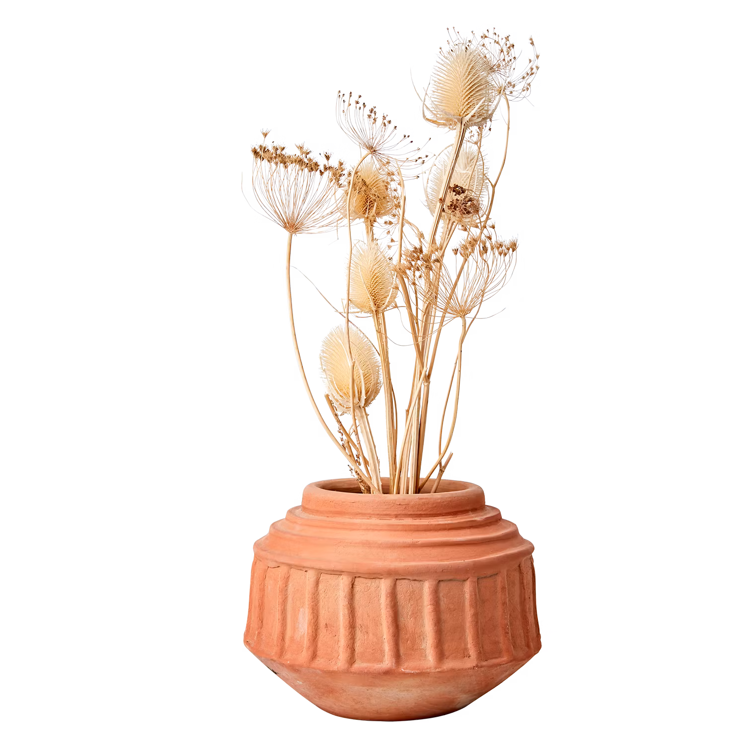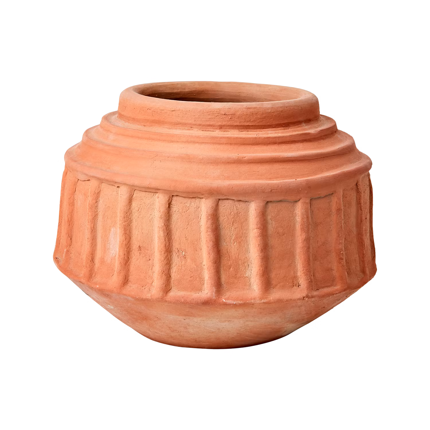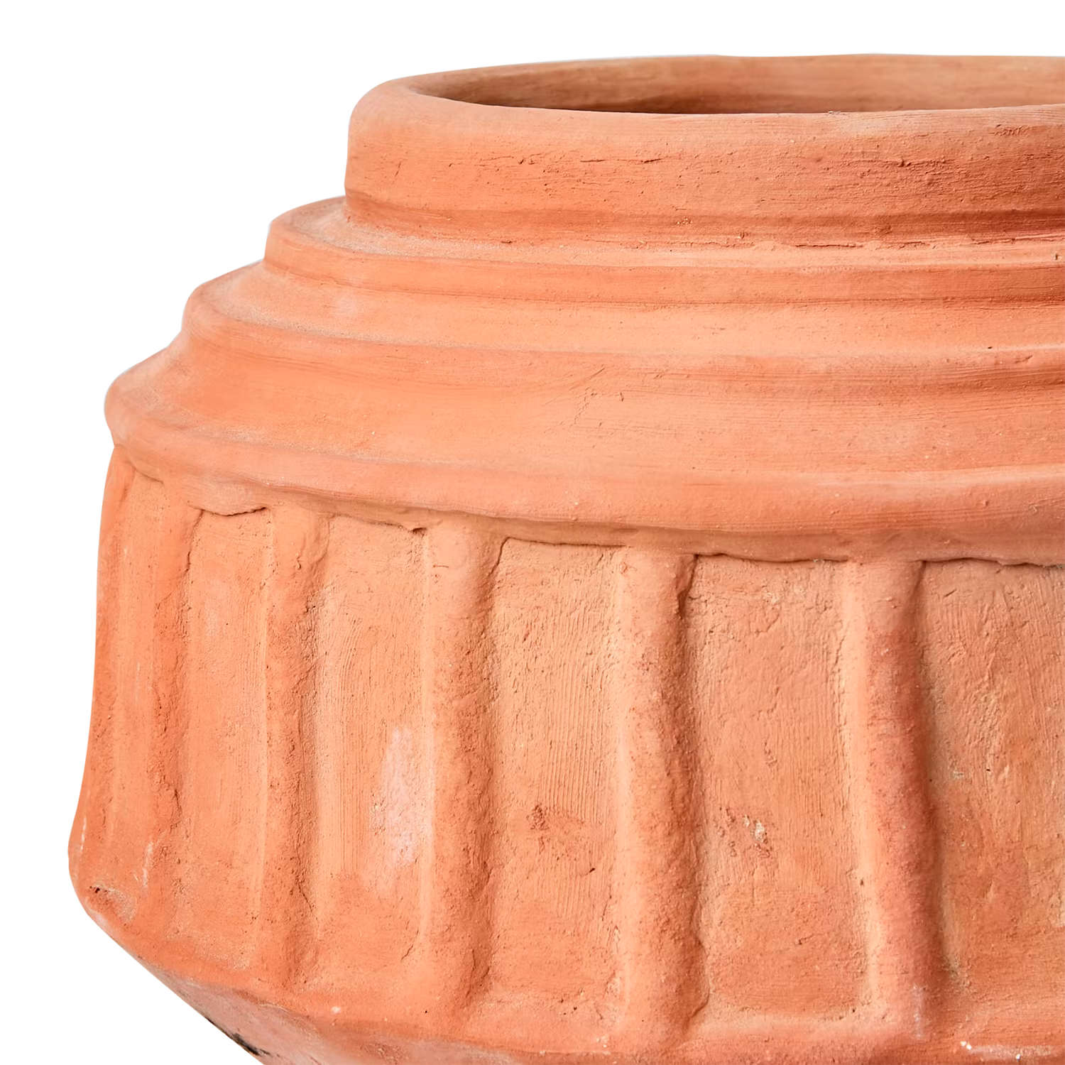 En karaktärsfull handgjord urna i naturfärgad terrakotta med vacker, skulpterad struktur. Den grova ytan och geometriska formen skapar ett kraftfullt intryck - perfekt för dig som vill ge hemmet en personlig och rustik touch.