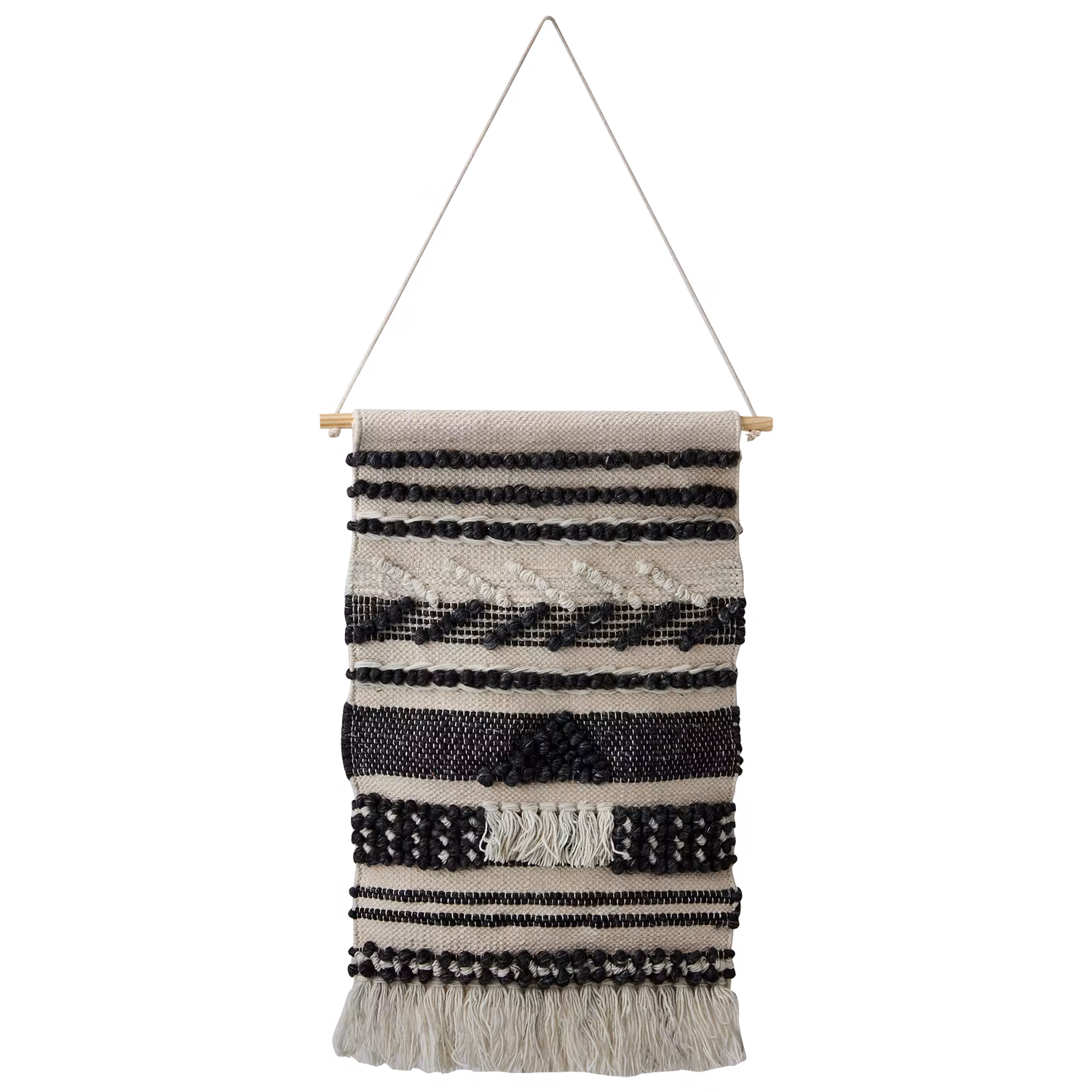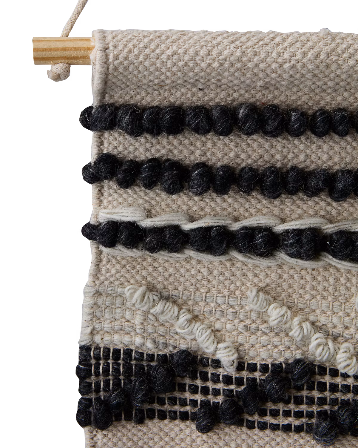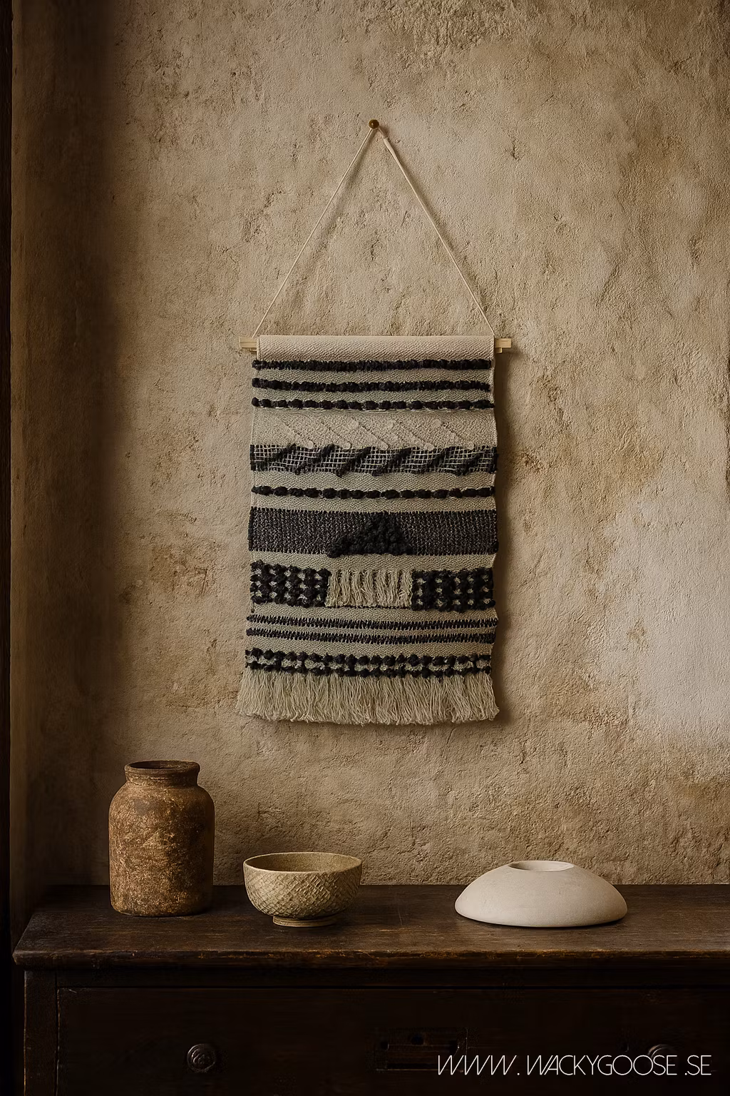 Vacker väggdekoration, handgjord med omsorg och bär spår av genuint hantverk. Det grafiska mönstret i svart och vitt skapar en tidlös kontrast som ger rummet liv och karaktär. De naturliga materialen och den textila strukturen tillför en varm känsla och en vacker balans mellan det mjuka och det uttrycksfulla.