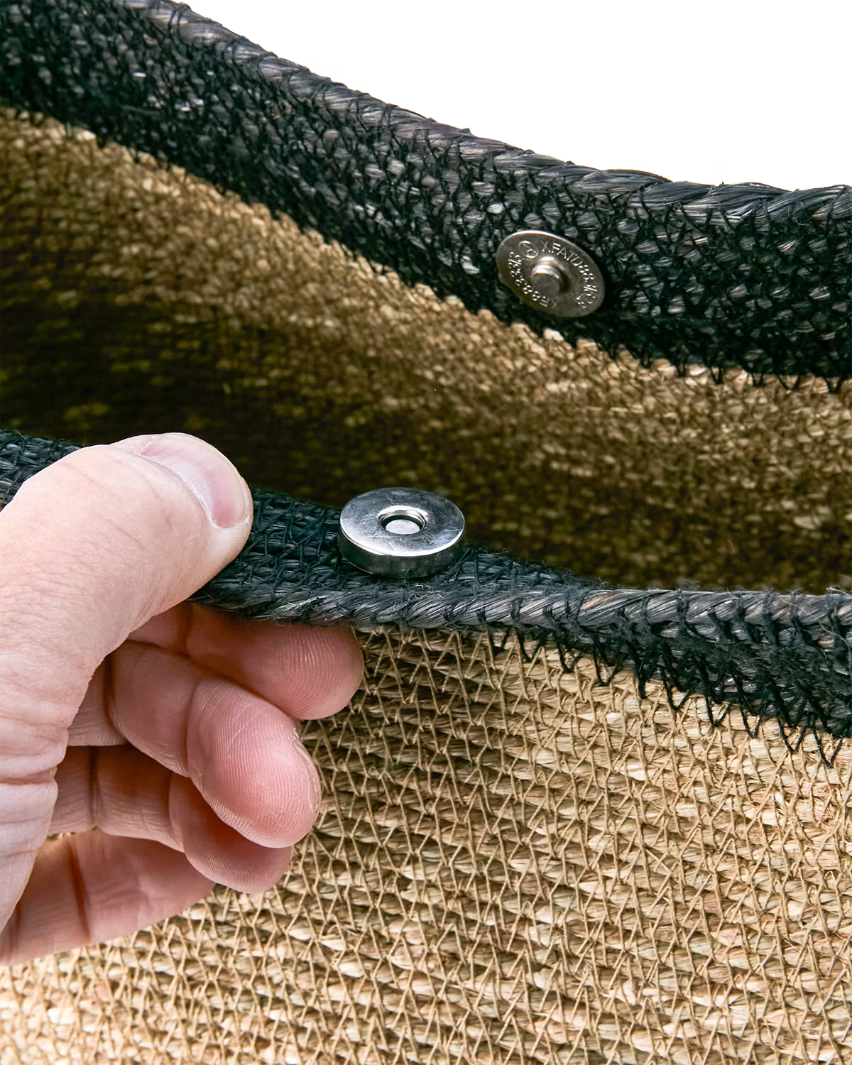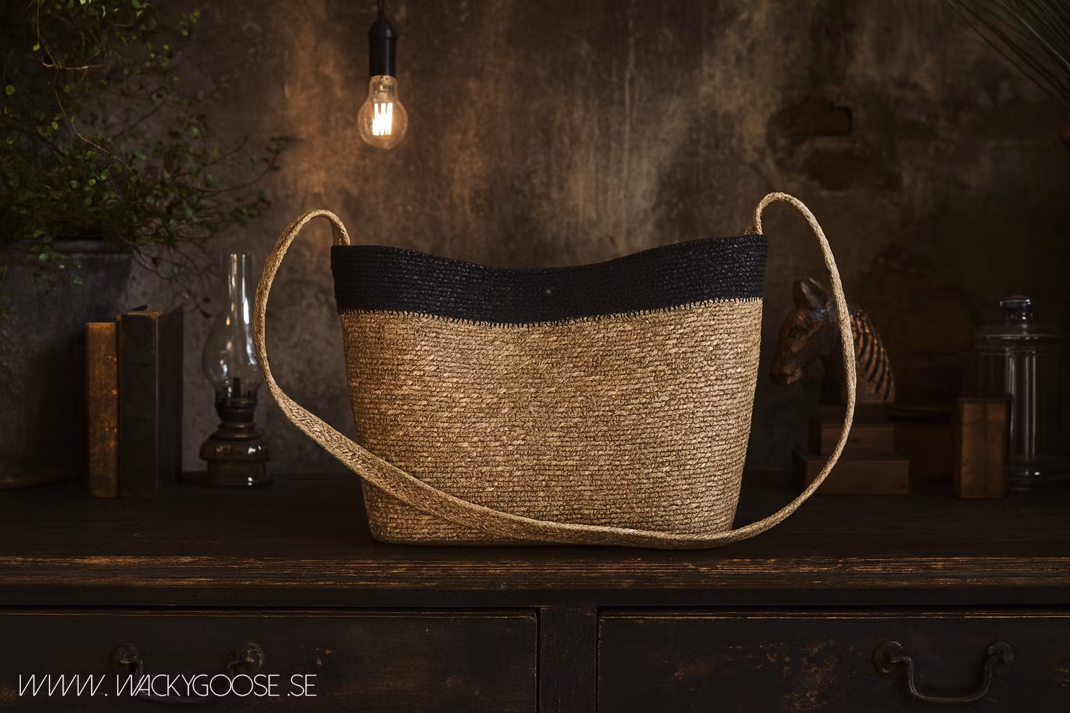 Storlek och färg kan variera något. Väskan har en tryckknapp.