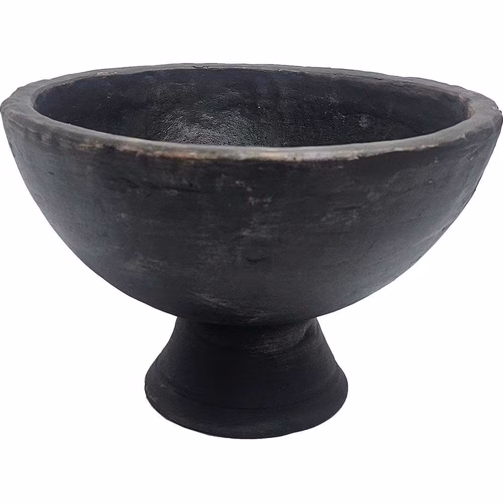 Denna handgjorda lerskål utstrålar enkelhet och rå charm. Med sin mörka yta och robusta form är skålen både dekorativ och funktionell. Den höga foten ger lerskålen ett klassiskt och nästan skulpturalt utseende, vilket gör den till ett blickfång i din inredning.