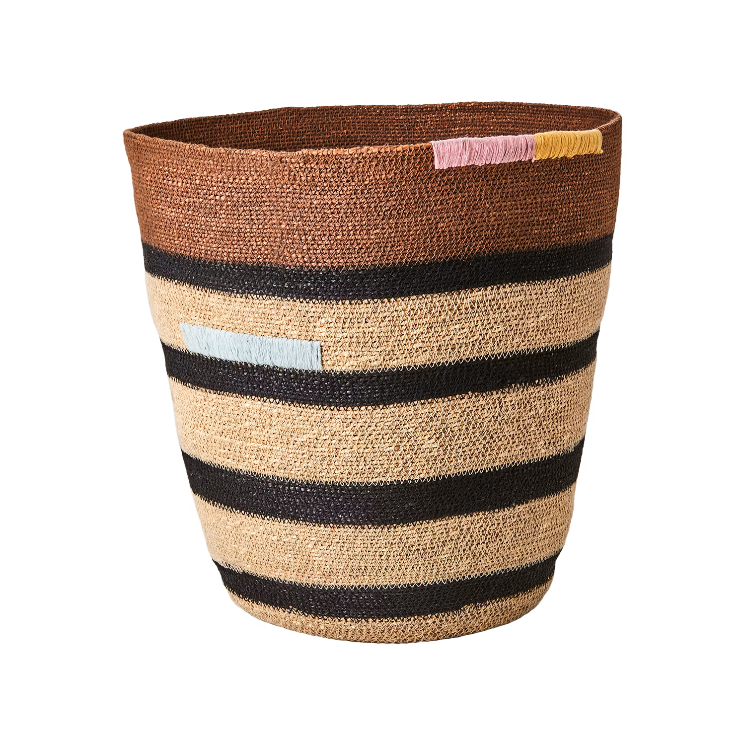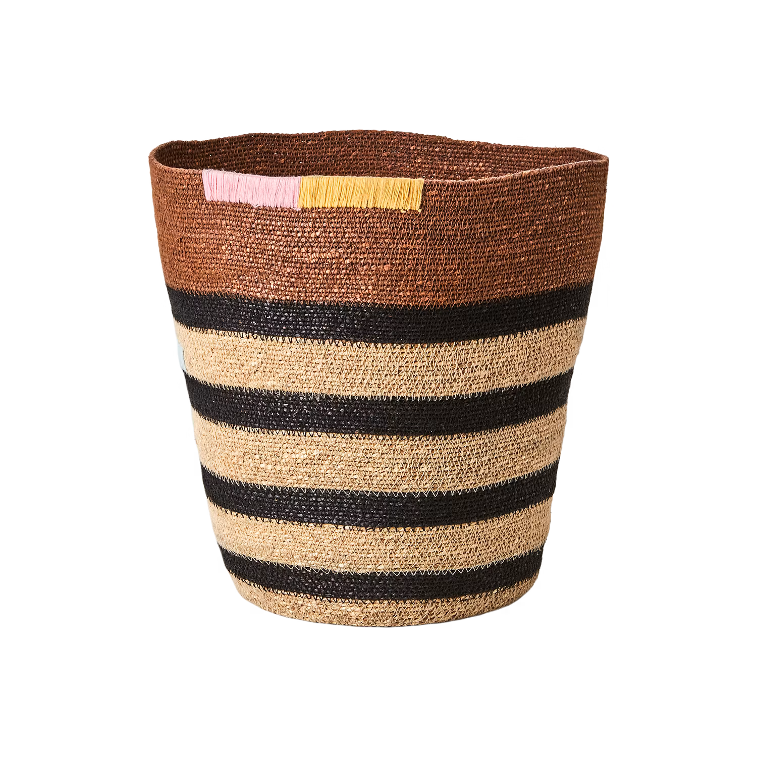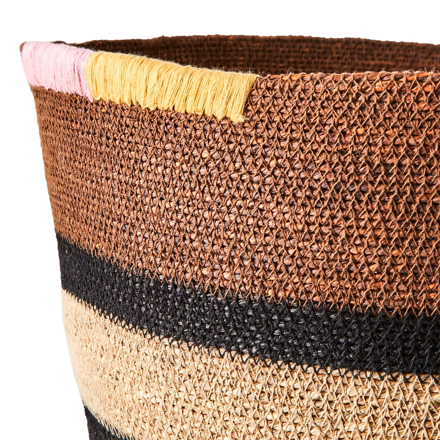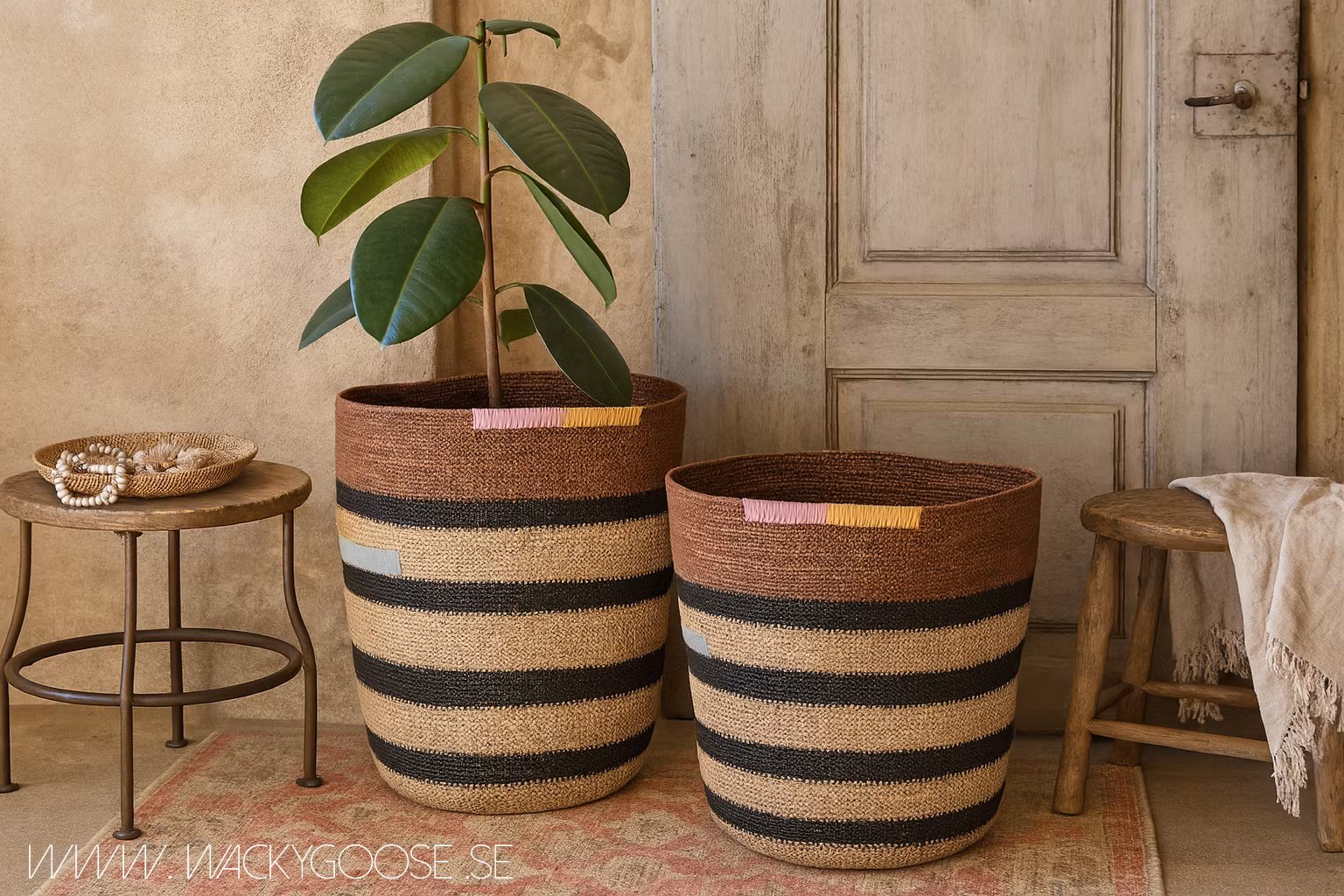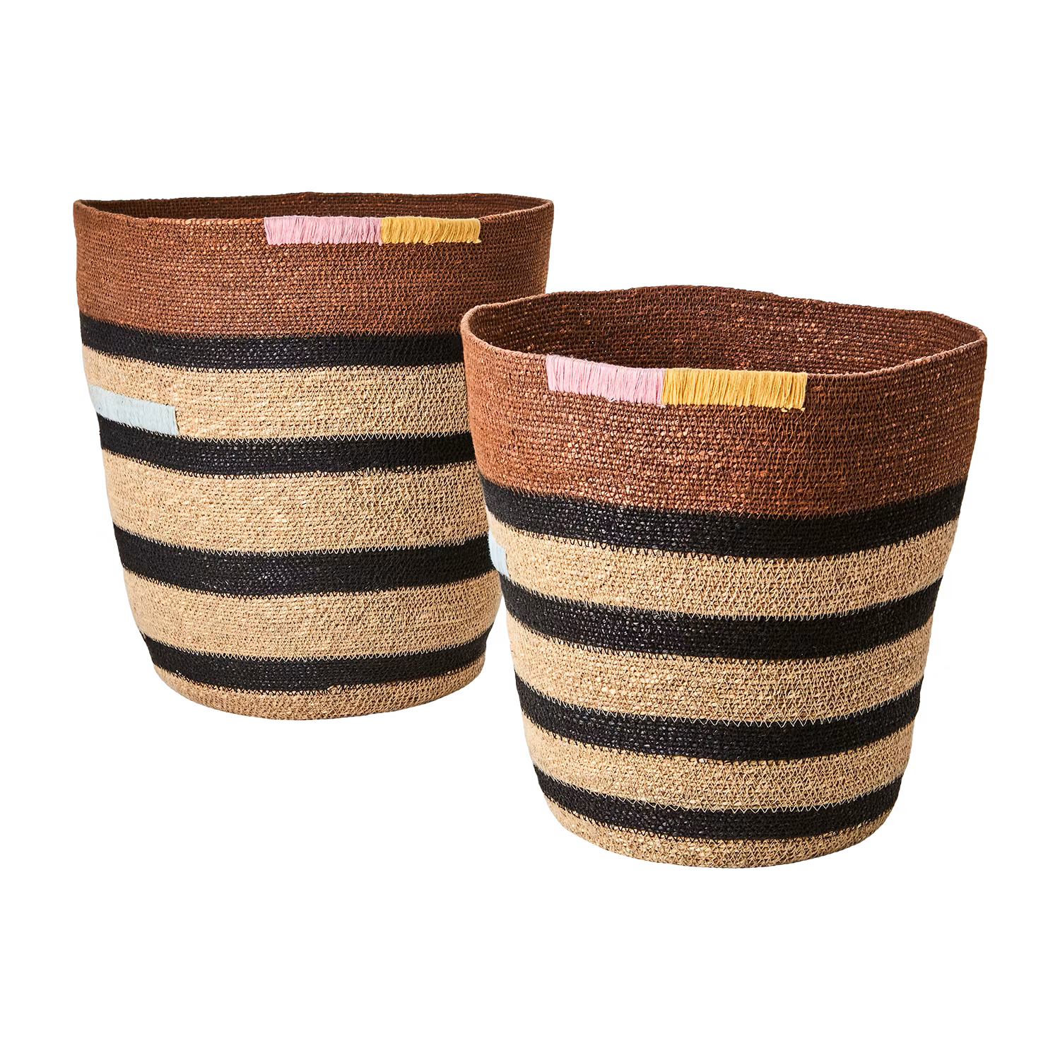 Handgjorda korgar i set om två erbjuder både stil och praktisk förvaring i hemmet. Handgjorda av sjögräs med en flätad design i svart, brunt, beige och färgglada detaljer, skapar de en varm och inbjudande känsla i rummet. De två korgarna är både dekorativa och funktionella, perfekta för att organisera använda som förvaring. Med sitt hantverksmässiga uttryck och naturliga material blir de en vacker del av inredningen, där varje korg är unik i sitt utförande.