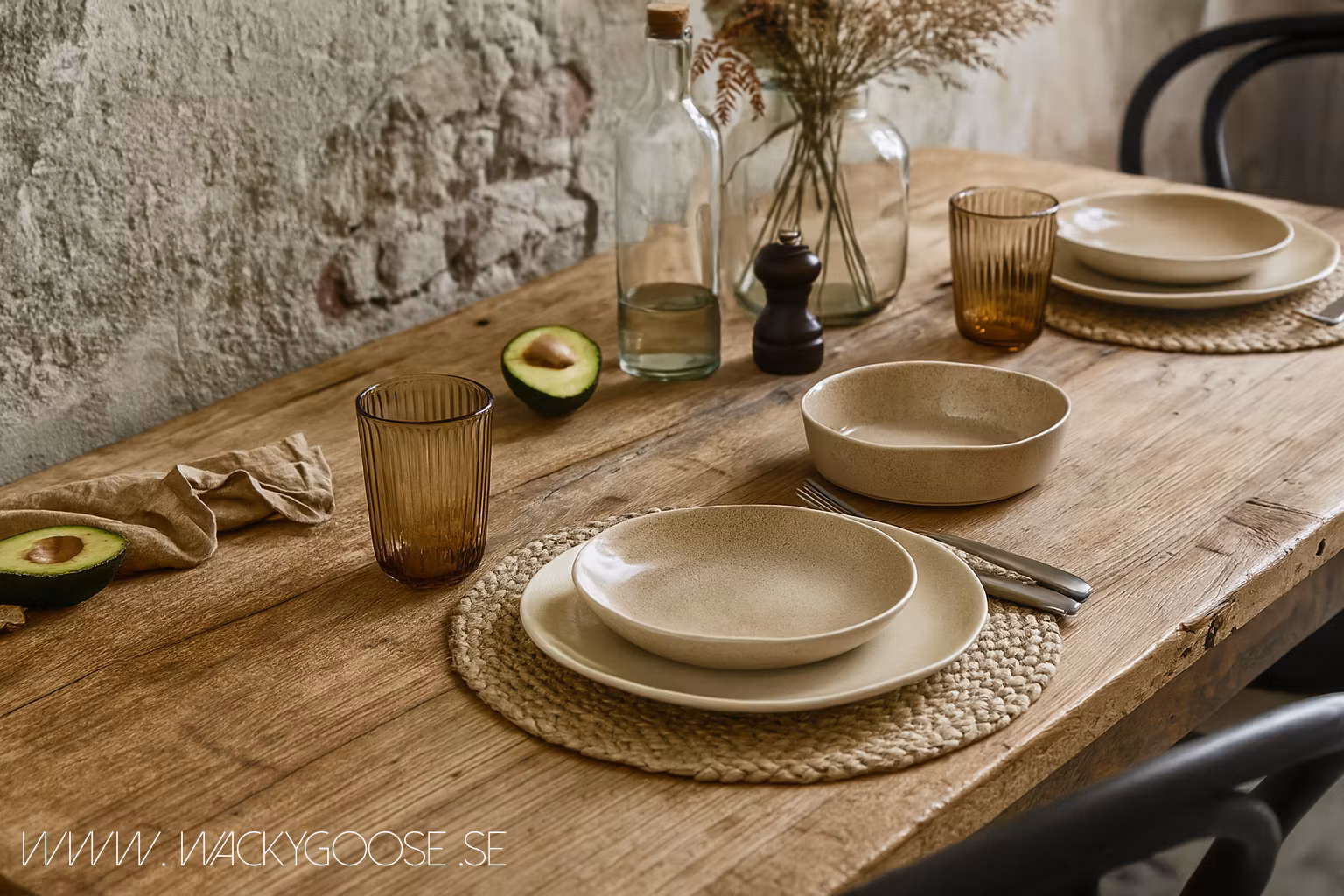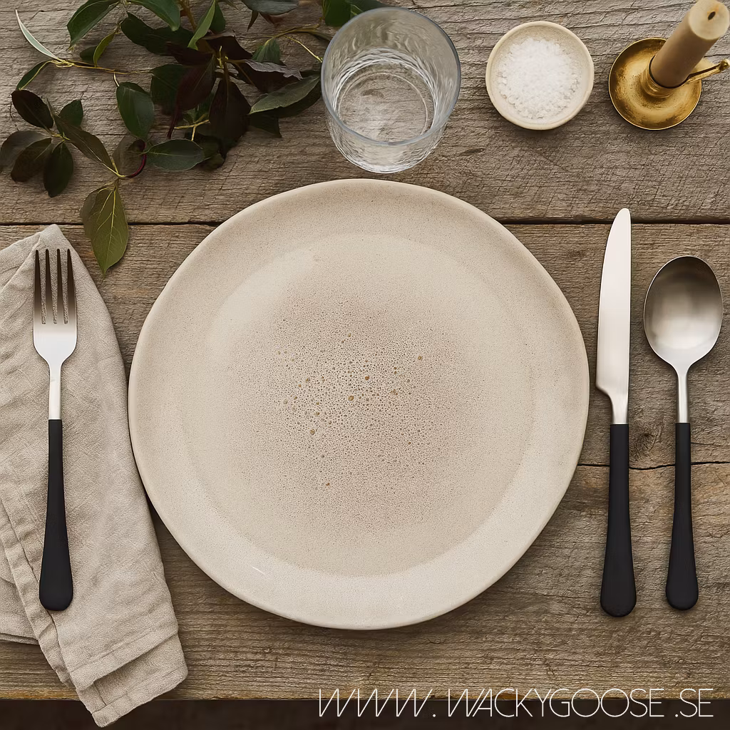 Den handgjorda stengodsytan gör varje tallrik unik, samtidigt som den smälter vackert in.