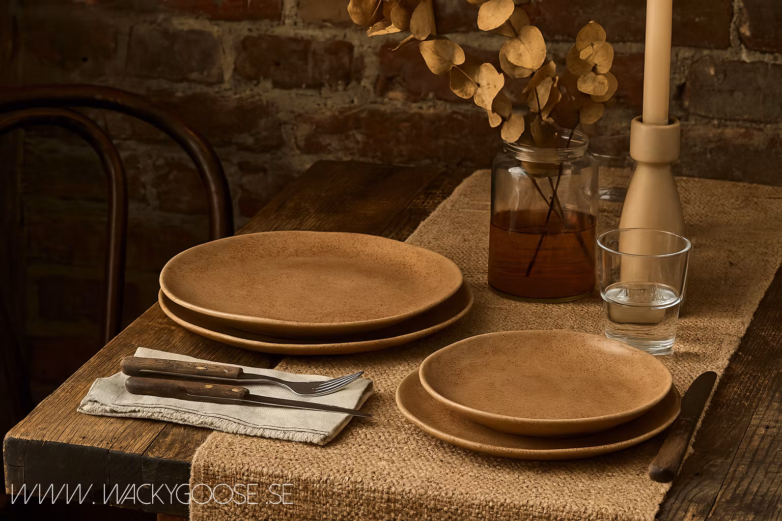 HILMA i brun glasyr har en varm och naturlig färgton som ger dukningen en inbjudande känsla. Den handgjorda stengodsytan gör varje tallrik unik, samtidigt som den smälter vackert in.