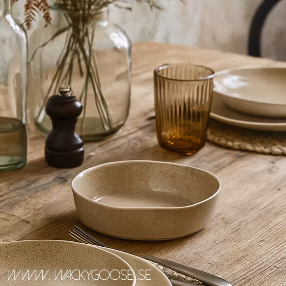 Den handgjorda stengodsytan gör varje tallrik unik, samtidigt som den smälter vackert in.