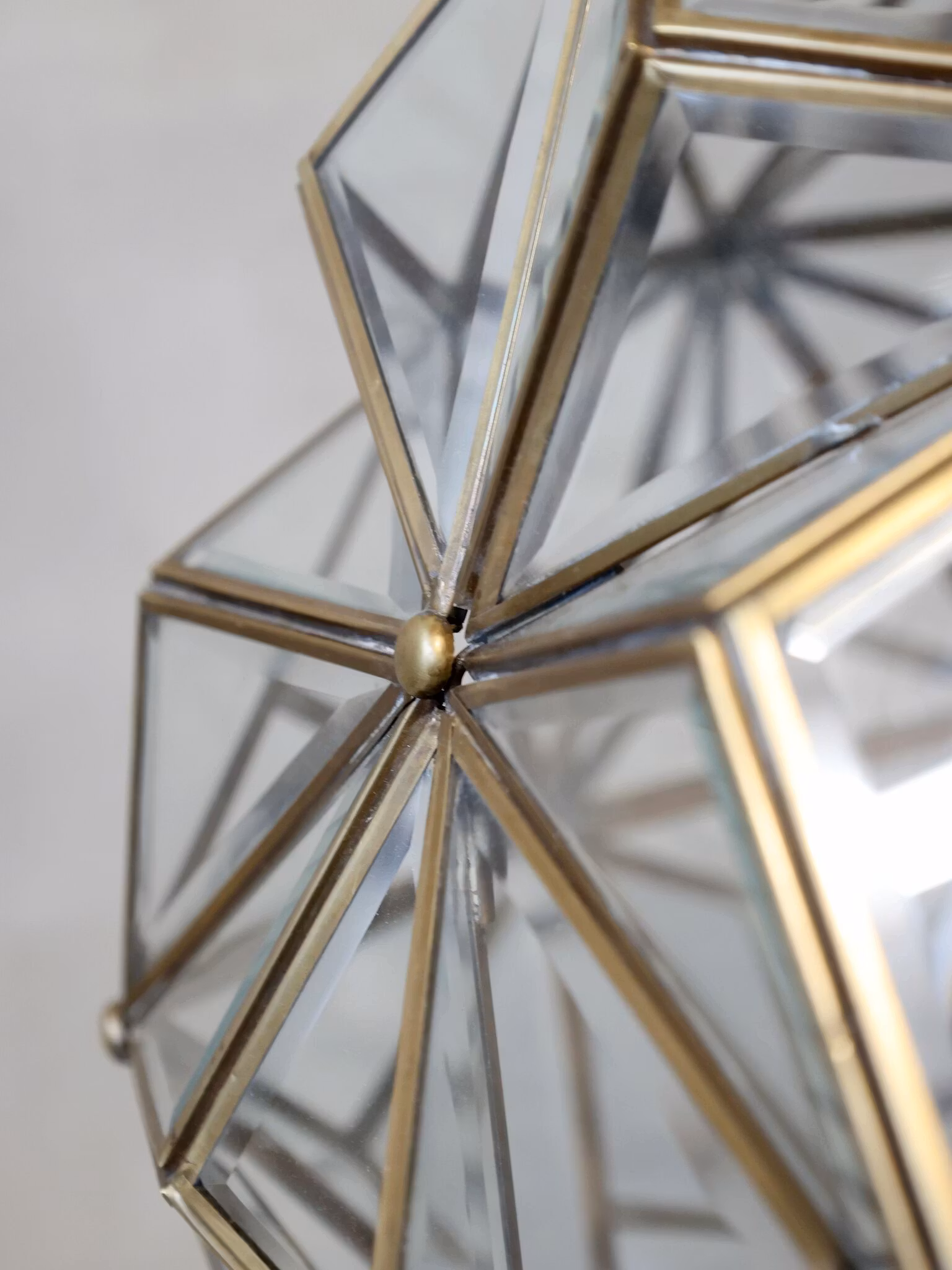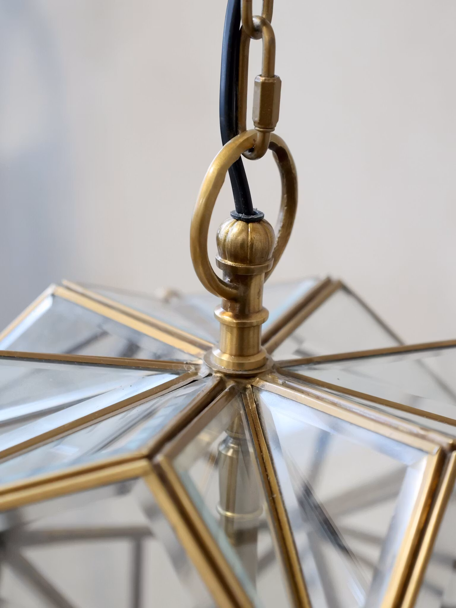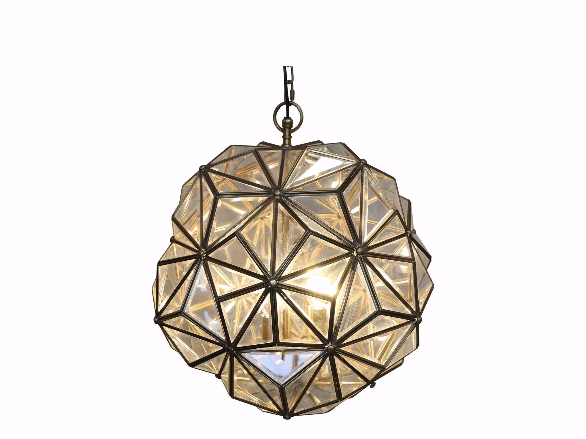 En elegant takkrona i glas och järn som kombinerar klassisk charm med modern enkelhet. Den geometriska designen med glaspartier ger ett luftigt och sofistikerat uttryck, medan järndetaljerna skapar en vacker kontrast. Ljuset sprider sig mjukt genom glaset och ger rummet en varm och inbjudande atmosfär.