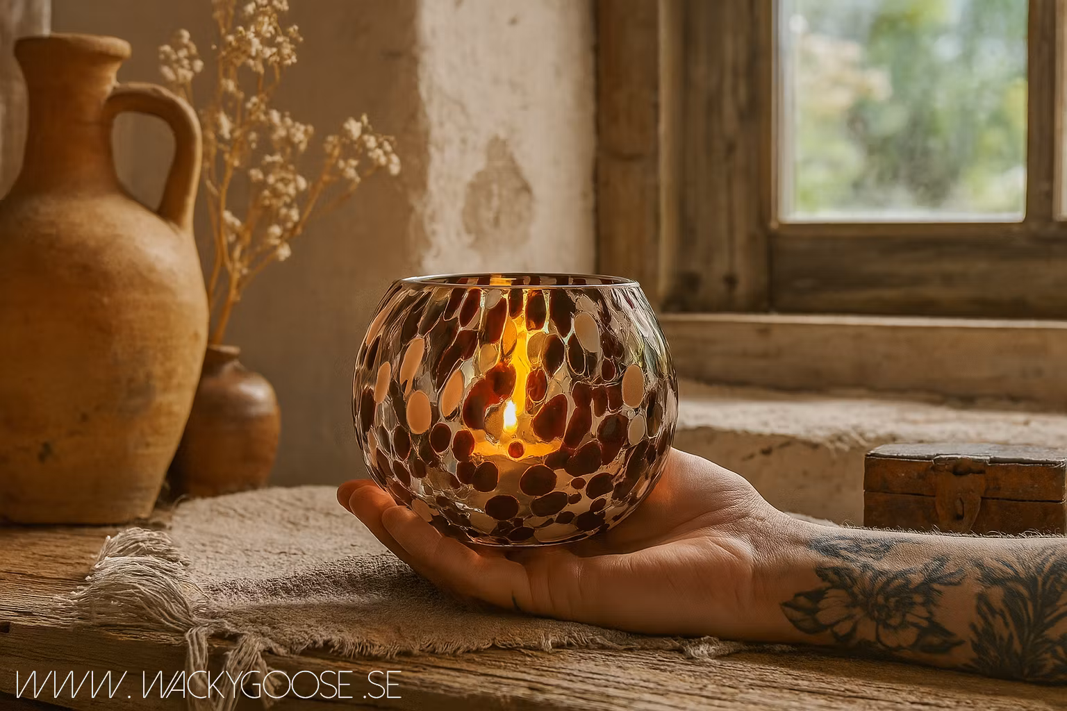 Munblåst. Bubblor och ojämnheter kan förekomma. Färgstyrkan kan variera.