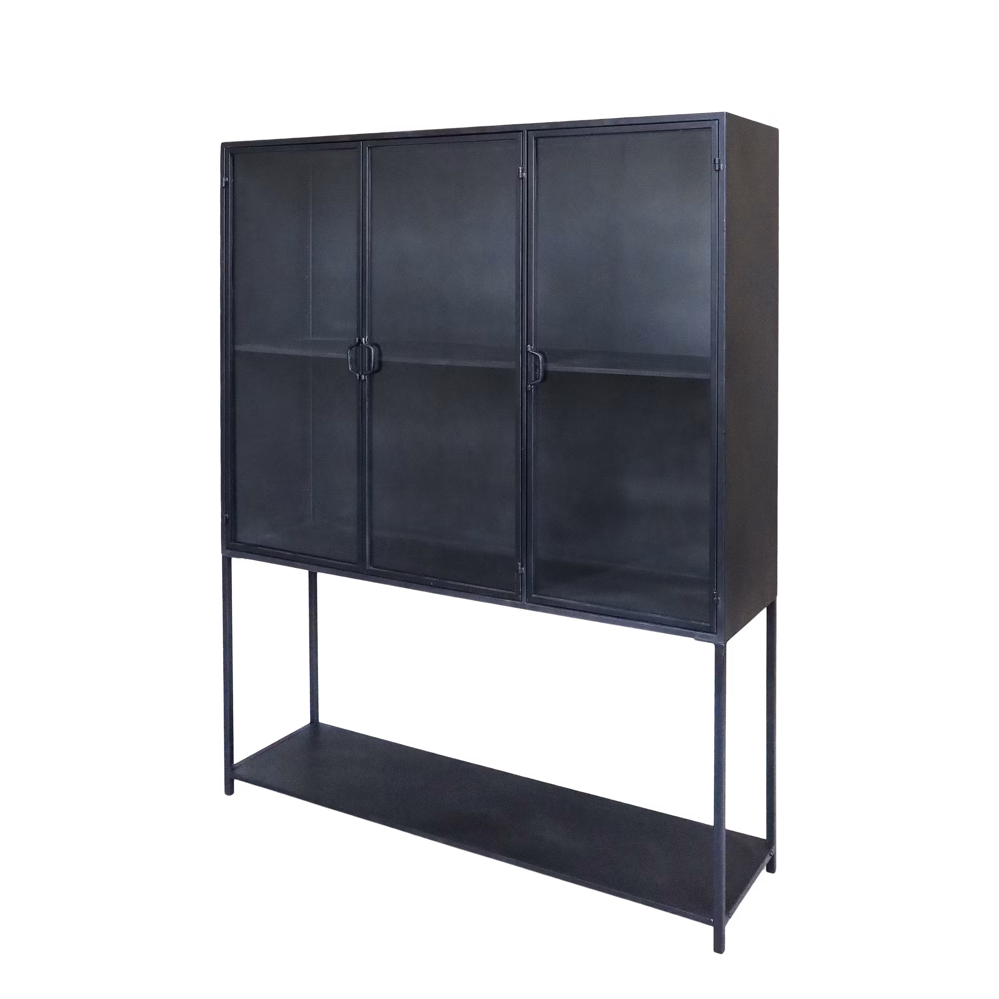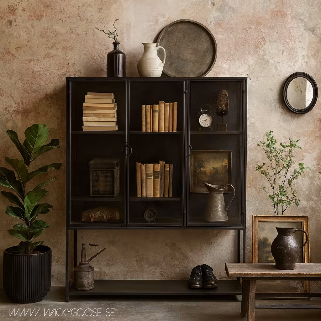 Ett gediget och elegant vitrinskåp som kombinerar industriell känsla med klassisk design. Den antiksvarta finishen ger möbeln en rustik och tidlös karaktär, samtsidigt som glasdörrarna gör det möjligt att visa upp allt från porslin och glas till textil och dekorativa inredningsdetaljer.¨