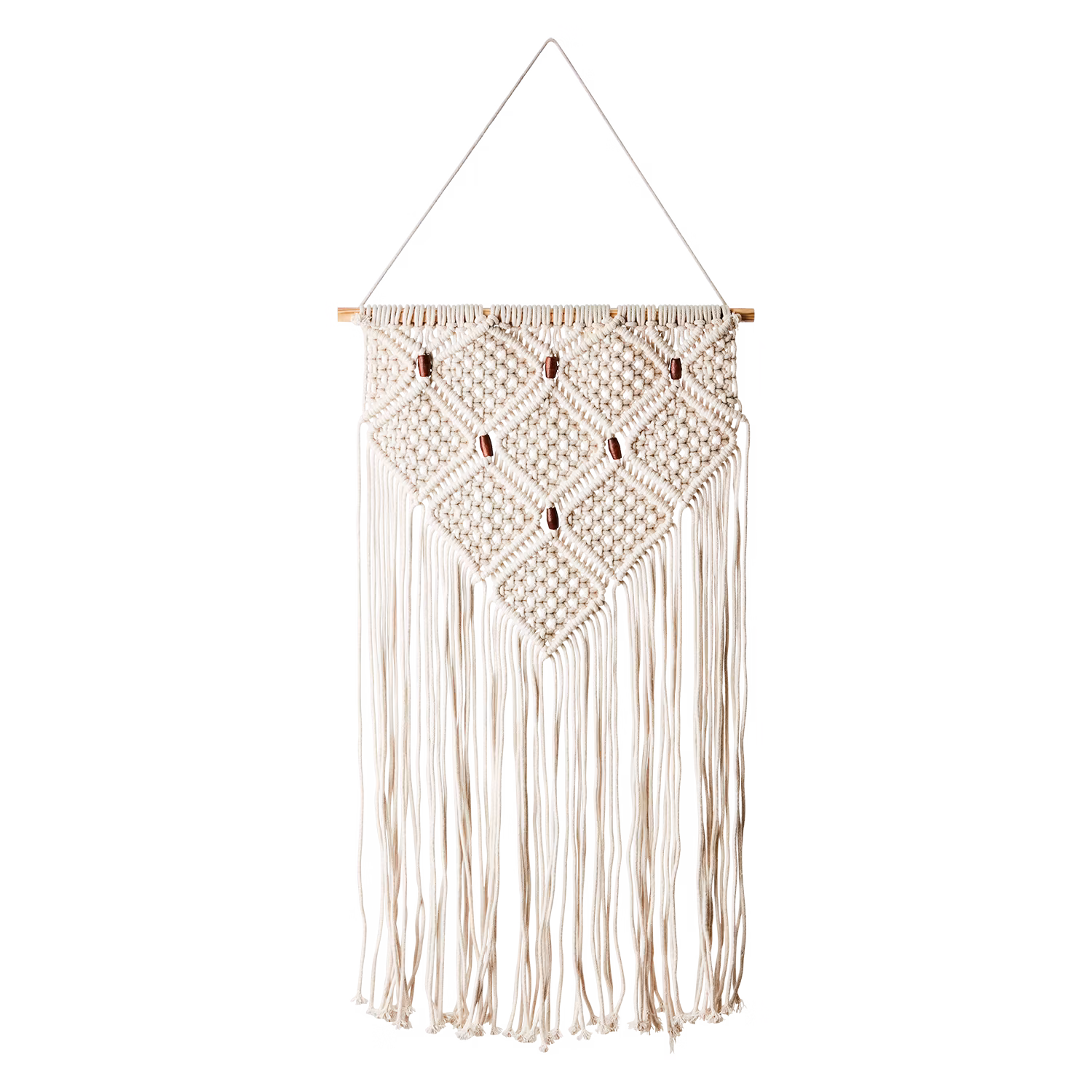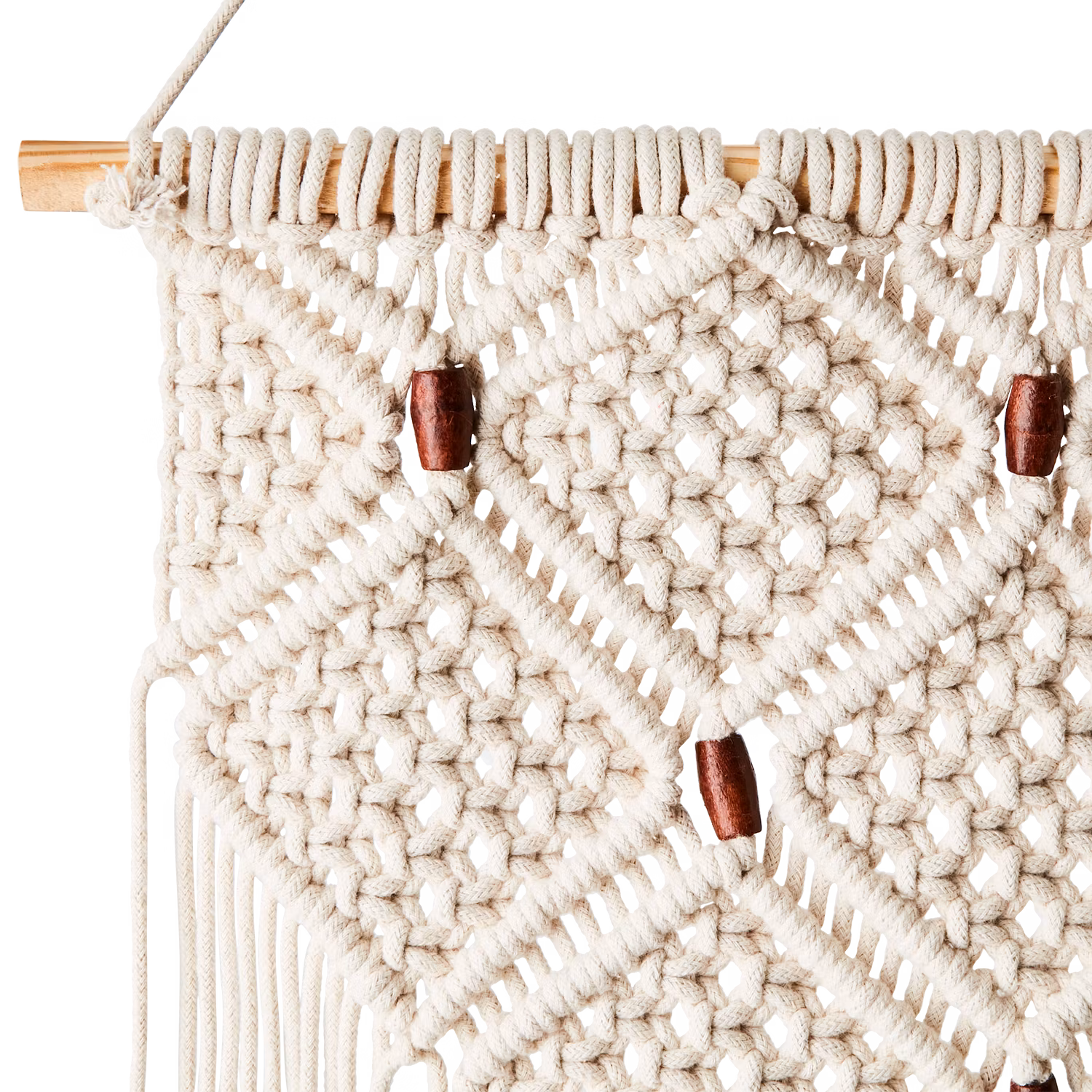 Ge hemmet en varm och naturlig känsla med denna vackra väggdekoration i trä och bomull. Den är handvävd i mjuka elfensbens- och bruna nyanser, vilket skapar ett harmoniskt uttryck som passar både modern och bohemisk inredning.