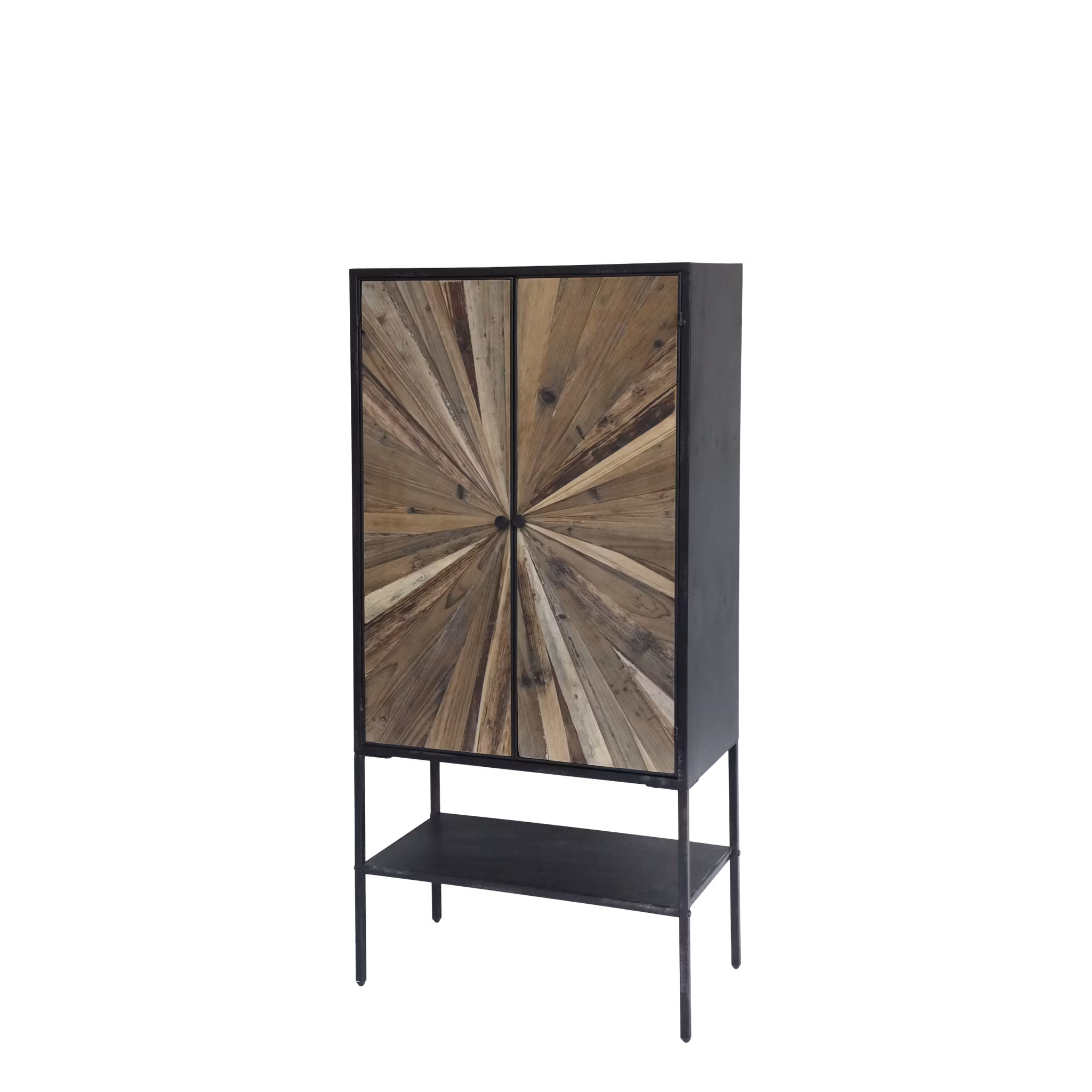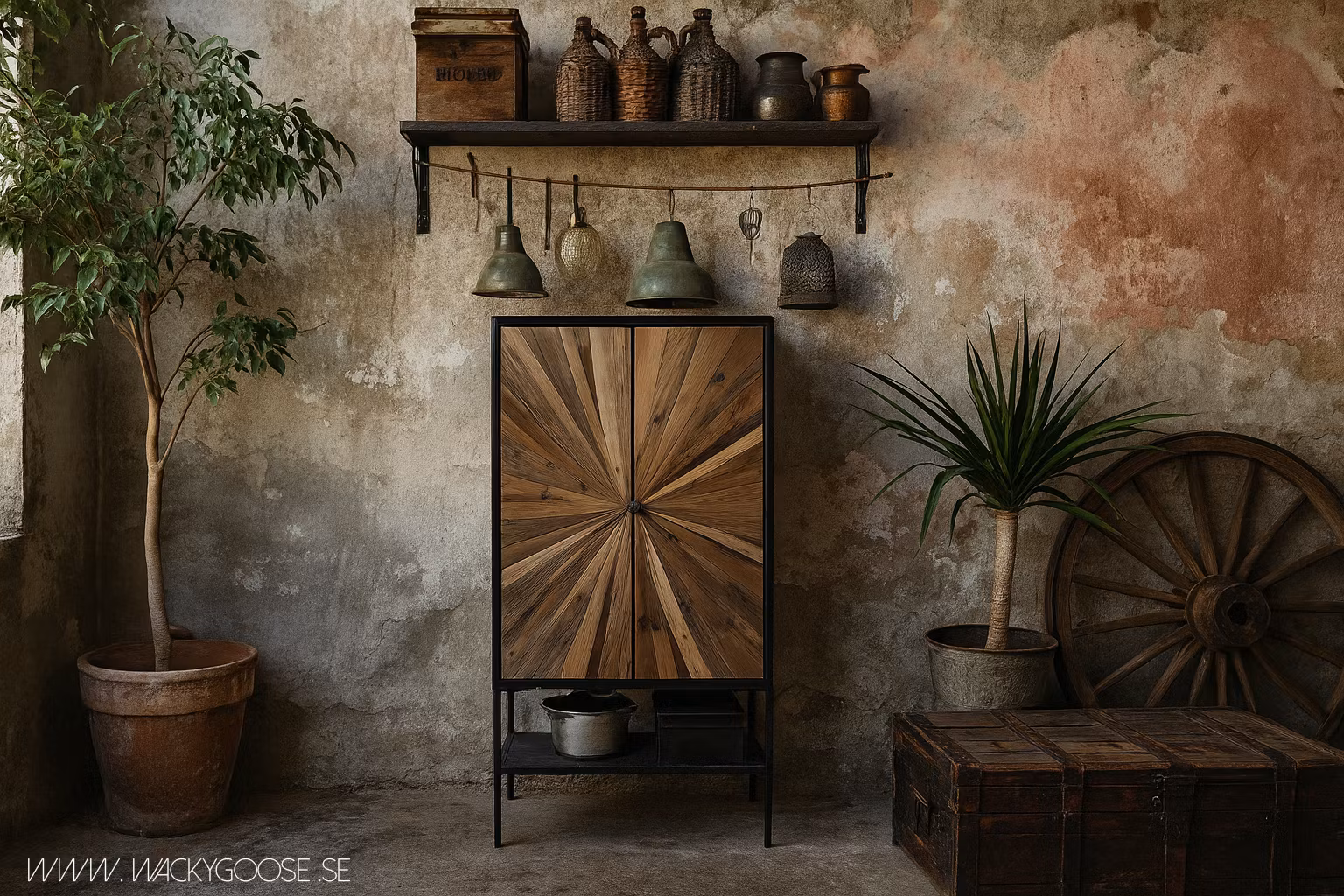 Ett karaktärsfullt skåp tillverkat av återbrukat granträ och robust järn, där varje detalj berättar en historia. Den rustika träytan kombineras med industriella metallinslag, vilket ger möbeln en tidlös charm och gör den till en blickfångare i rummet.