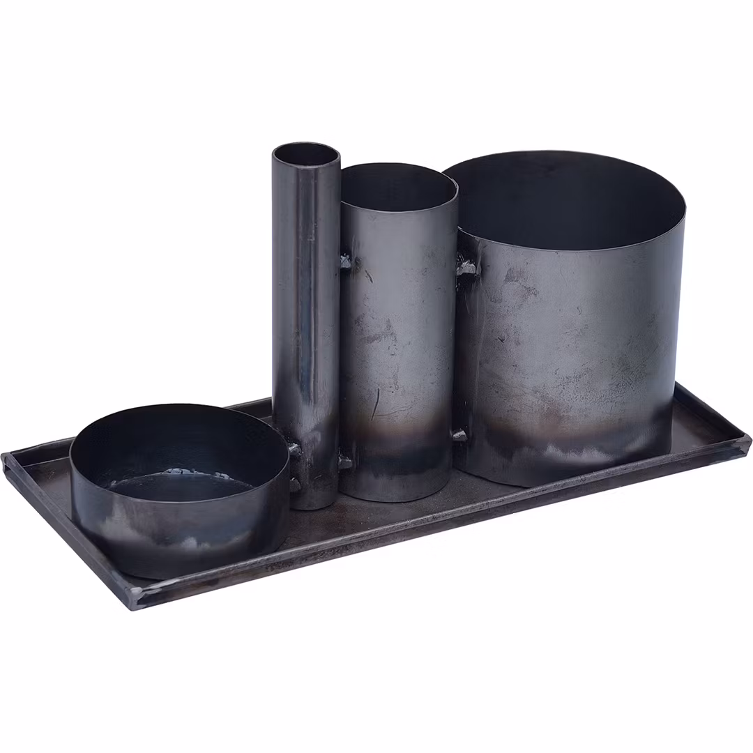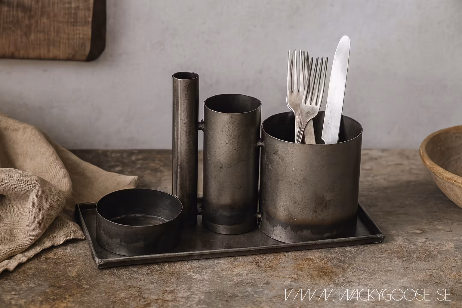 Här har du en multifunktionell design. En järnbricka med 4 sammansvetsade förvaringsgrytor. Du kan använda brickan och krukorna tillsammans eller separat, eftersom brickan inte är sammansvetsad med krukorna. Du kan använda skapandet på kontoret för att hålla reda på dina pennor och annan kontorsutrustning. I köket för örter, oljor och kryddor. Till årets högtider då man kan dekorera med grenar, påskpynt, julpynt eller något helt annat. Kan även användas i badrummet för att hålla ordning på hårborstar, tandborstar, hårband, smycken etc.