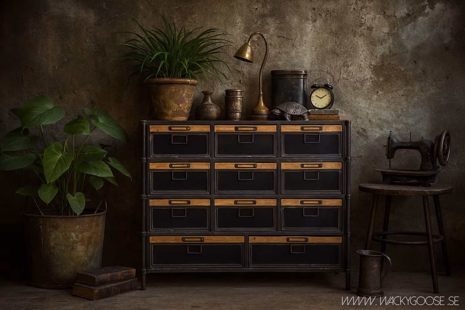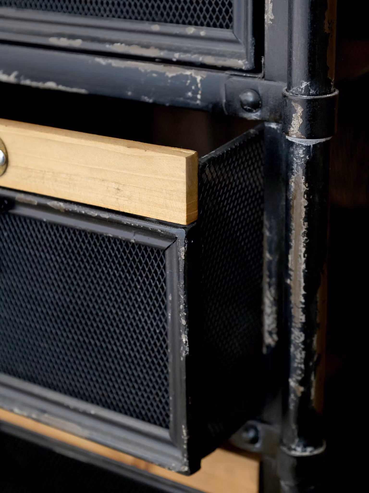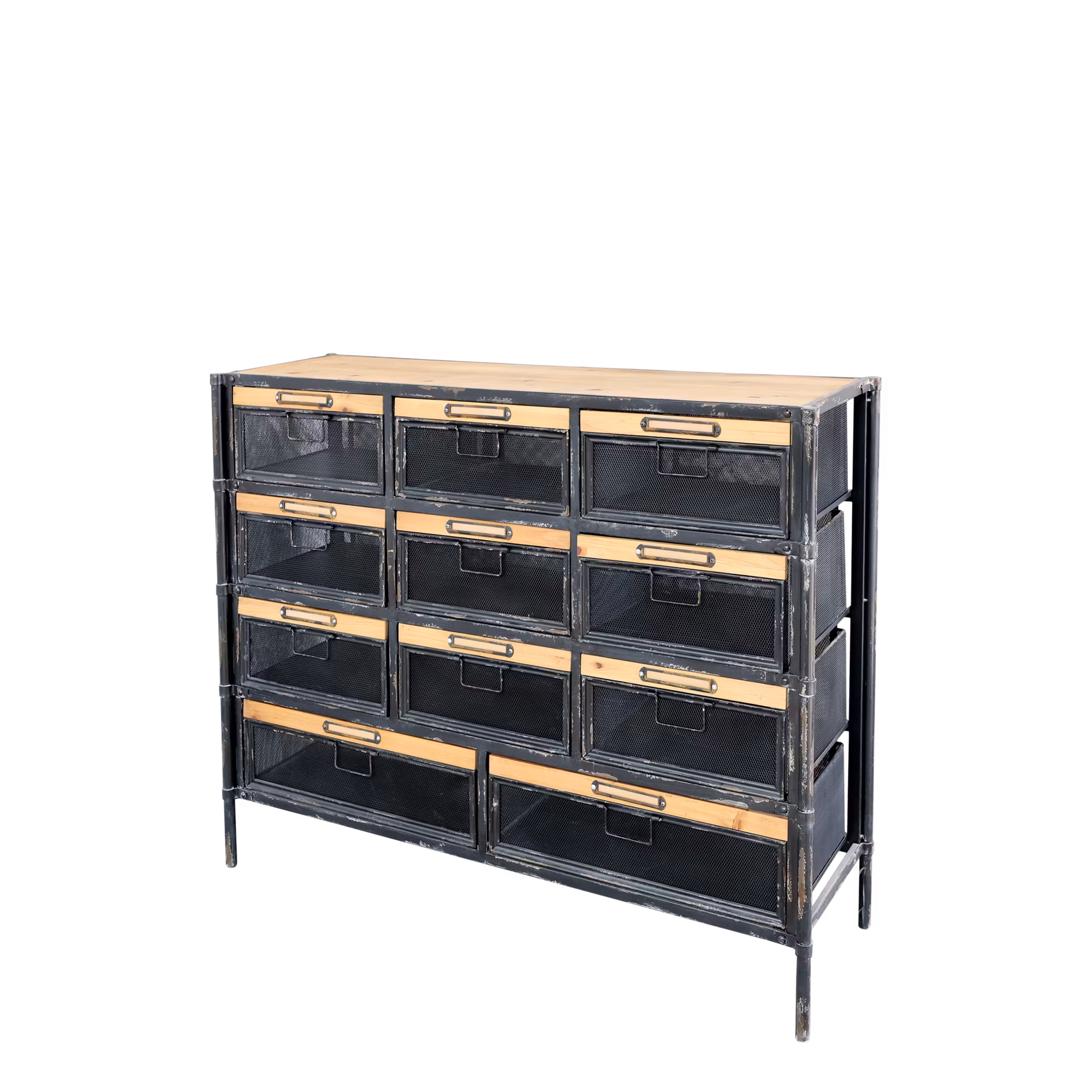 Denna skänk är en spektakulär möbel designad med autentiska och vackra detaljer. Byrån är handgjord i massivt granträ och järn med ett antikt utseende. Två material som kompletterar varandra vackert och skapar ett rustikt uttryck.