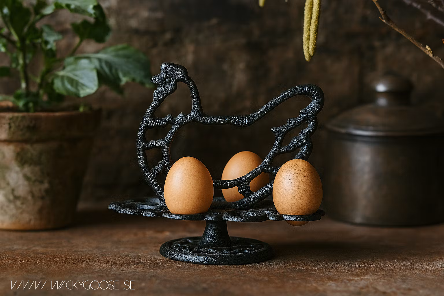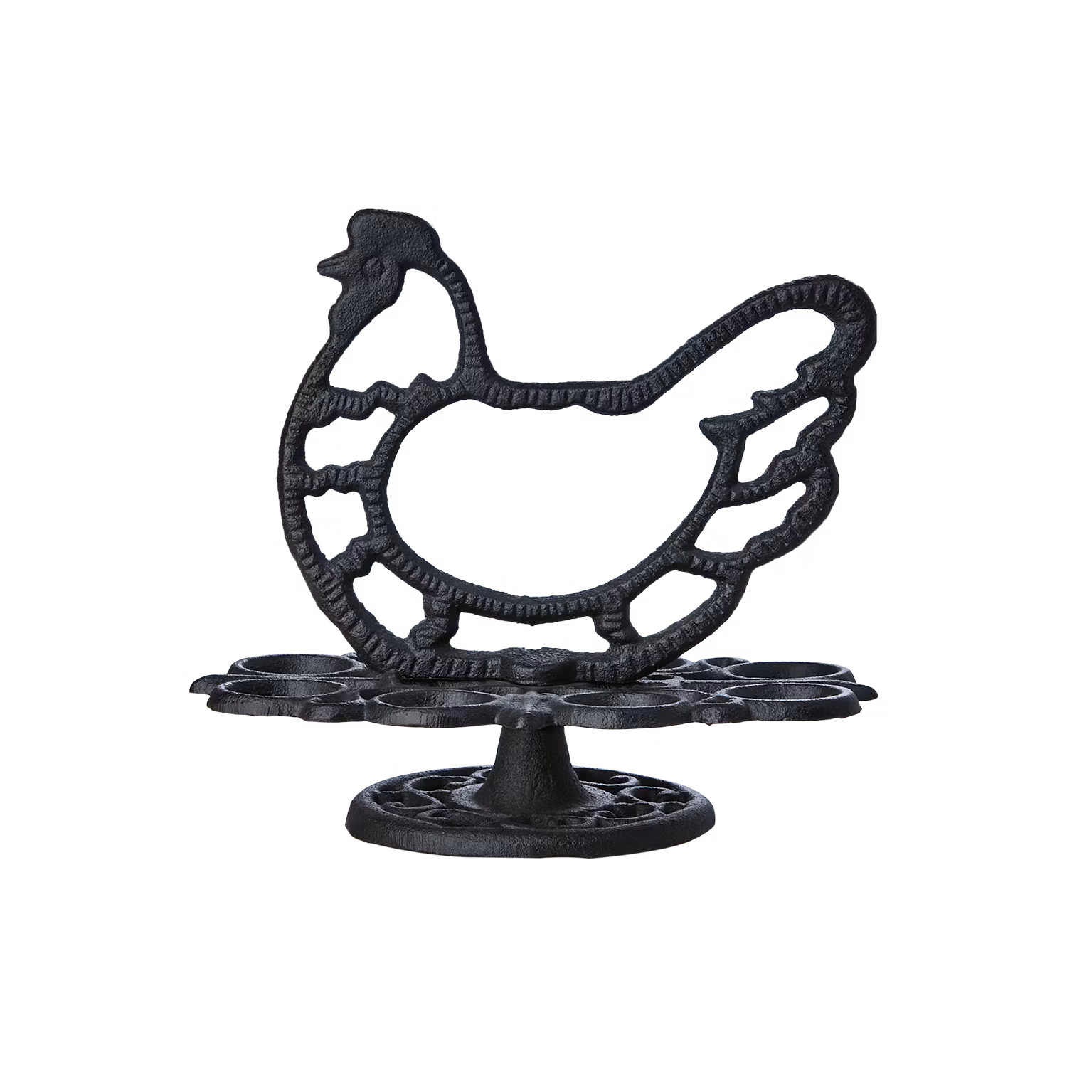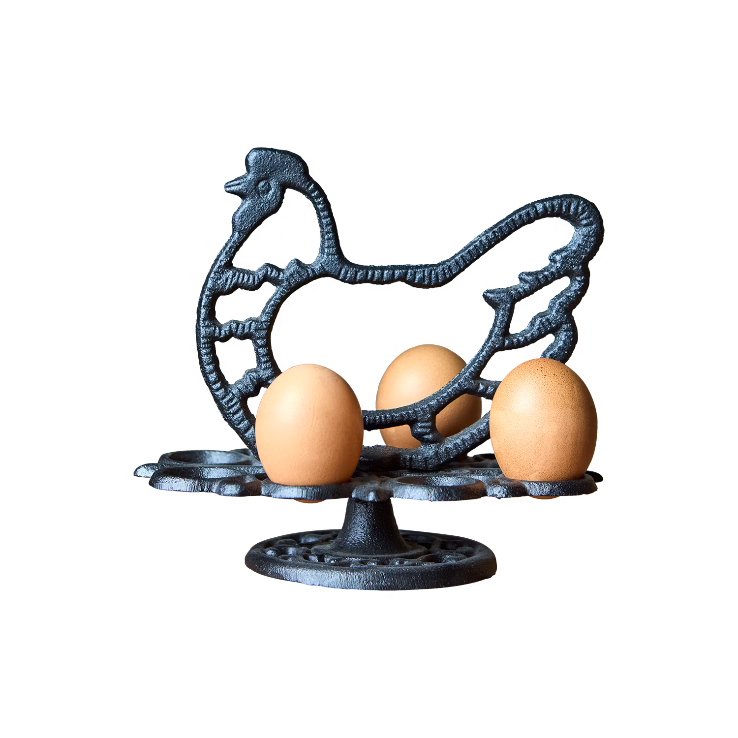 Ägghållare i svart gjutjärn förenar praktisk förvaring med dekorativ design. Formad som en höna blir den ett charmigt inslag i köket, perfekt för att hålla ägg på plats inför matlagning eller servering. Det robusta gjutjärnet ger hållbarhet och stabilitet, medan den svarta finishen ger ett stilrent uttryck. En tidlös köksdetalj som passar både moderna och lantliga miljöer.