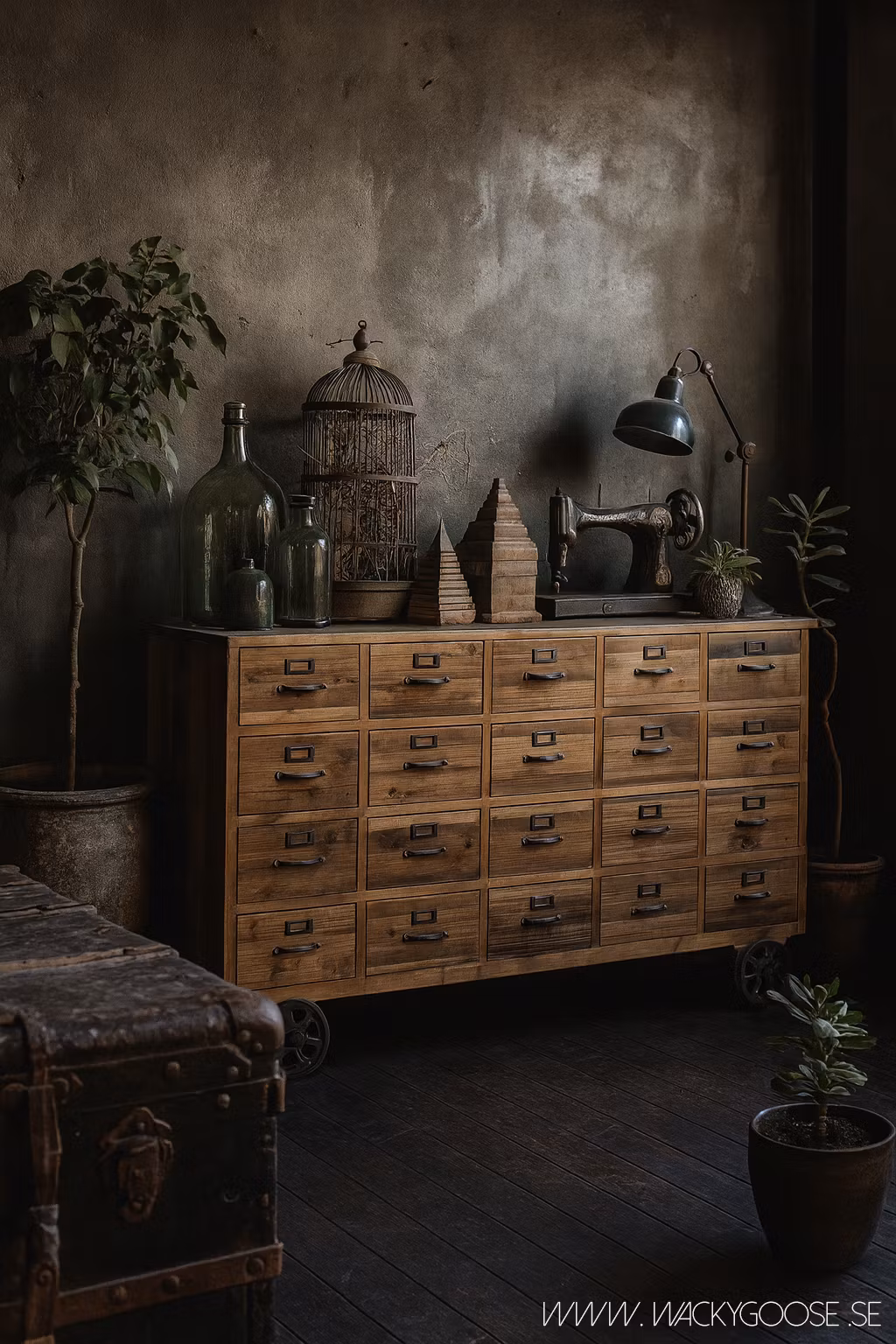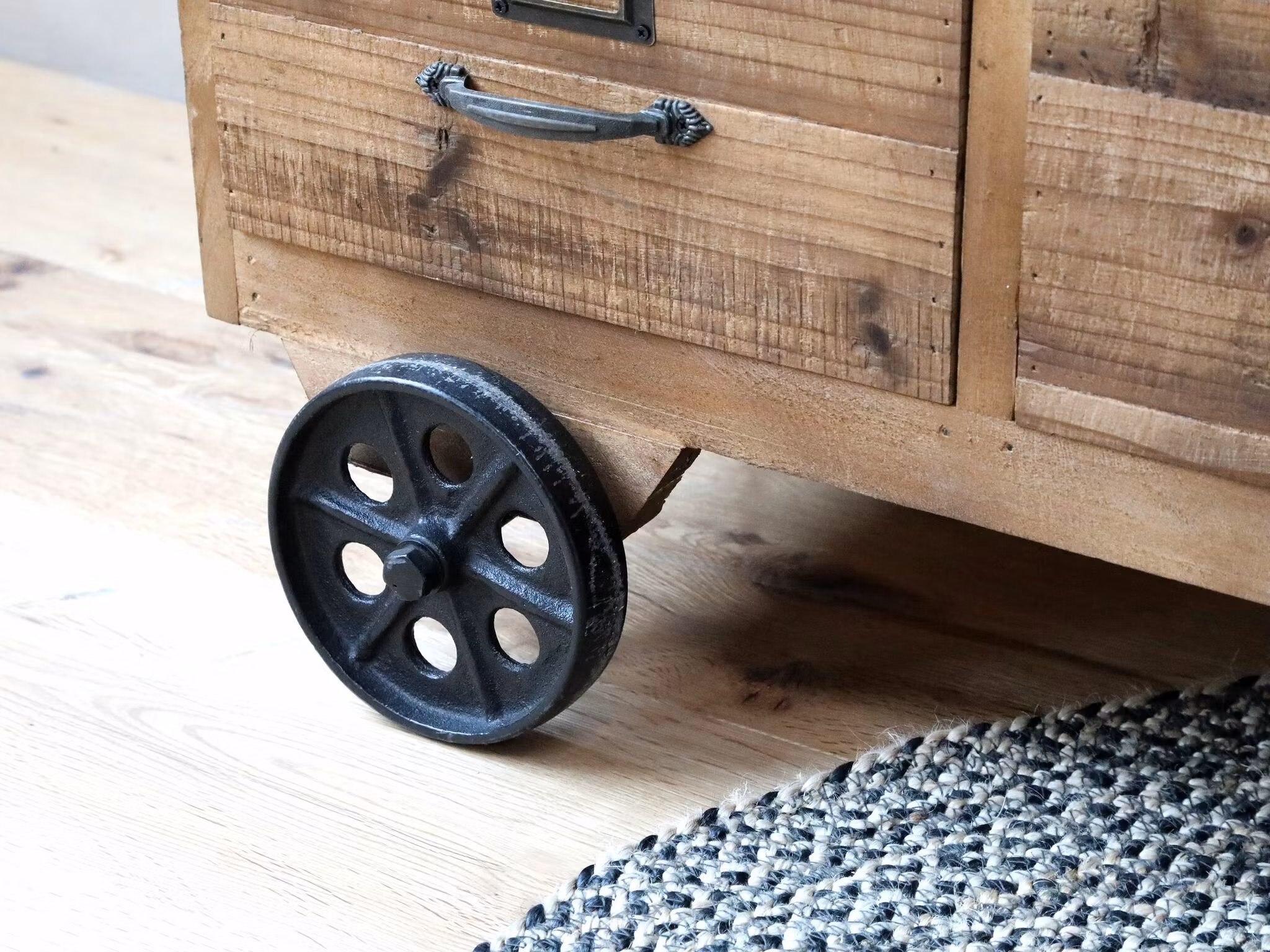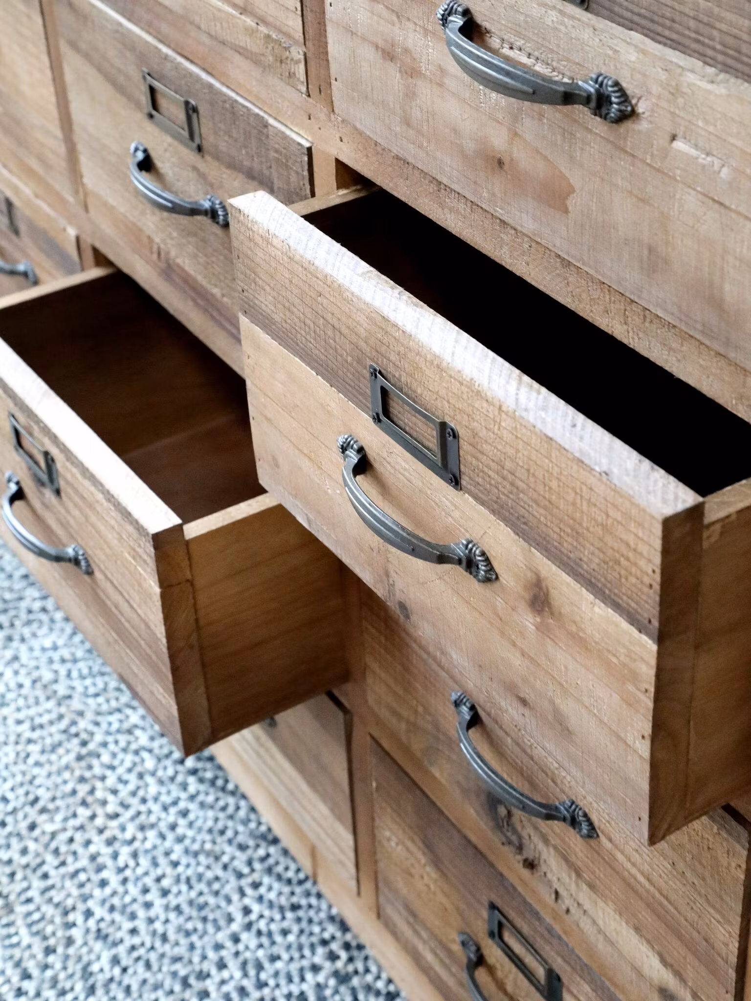 Denna möbel passar lika bra i köket för redskap och textilier som i vardagsrummet, hallen eller butiken för stilfull och organiserad förvaring. De många lådorna gör den perfekt för att hålla ordning på småsaker samtidigt som den blir en dekorativ inredningsdetalj.