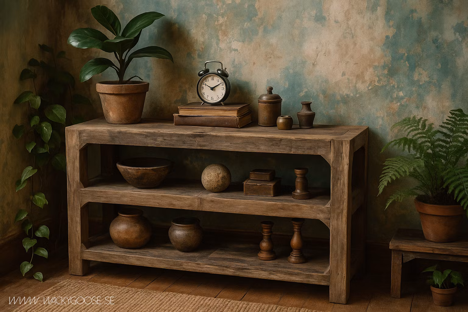 En helt unik hylla/bänk, tillverkad av återbrukat material - varje exemplar är unikt med sin egen patina och naturliga variationer i färg och struktur. Möbeln har en tidlös och rustik design som passar perfekt i såväl lantliga hem som i industriell inredning.