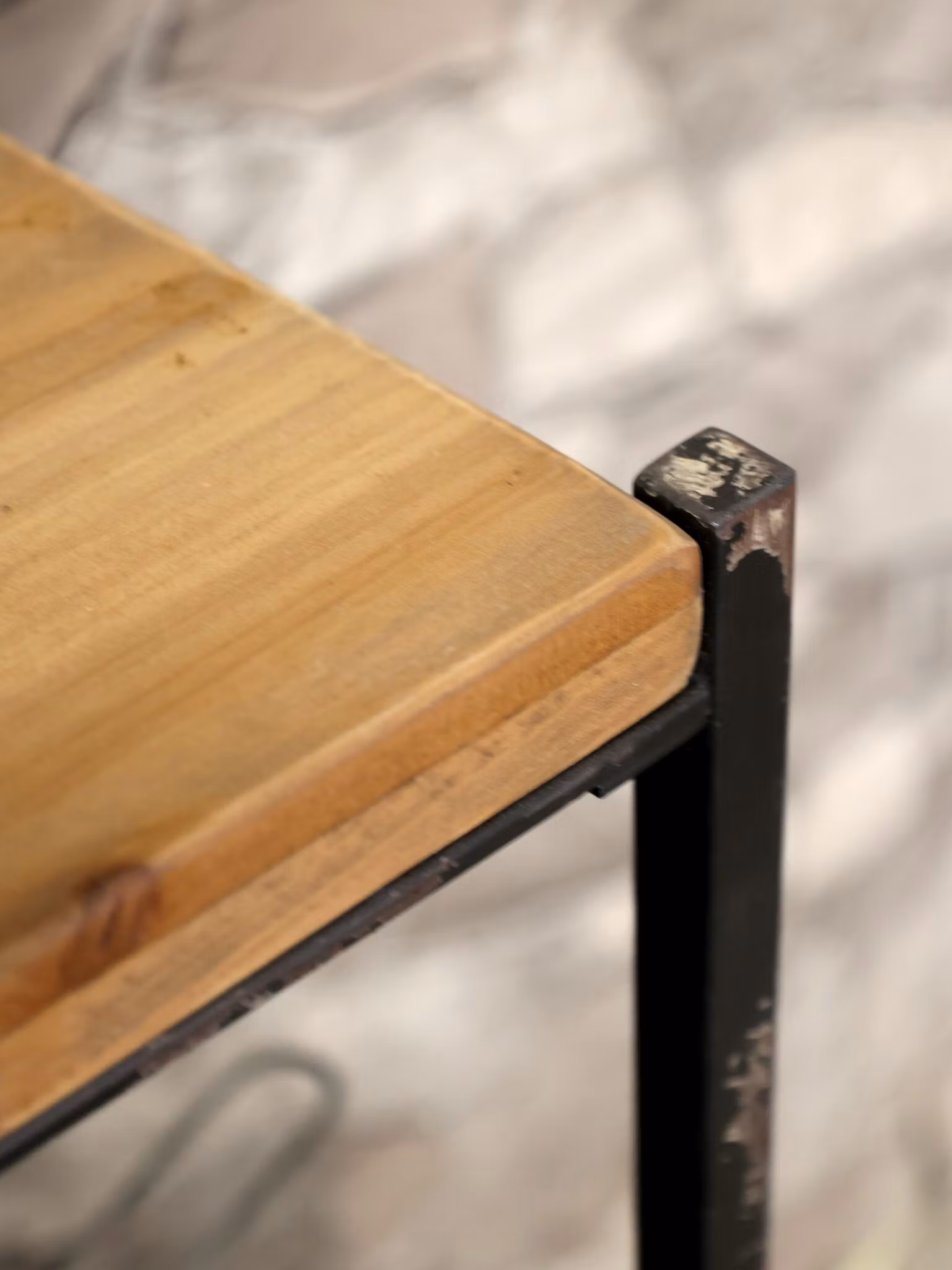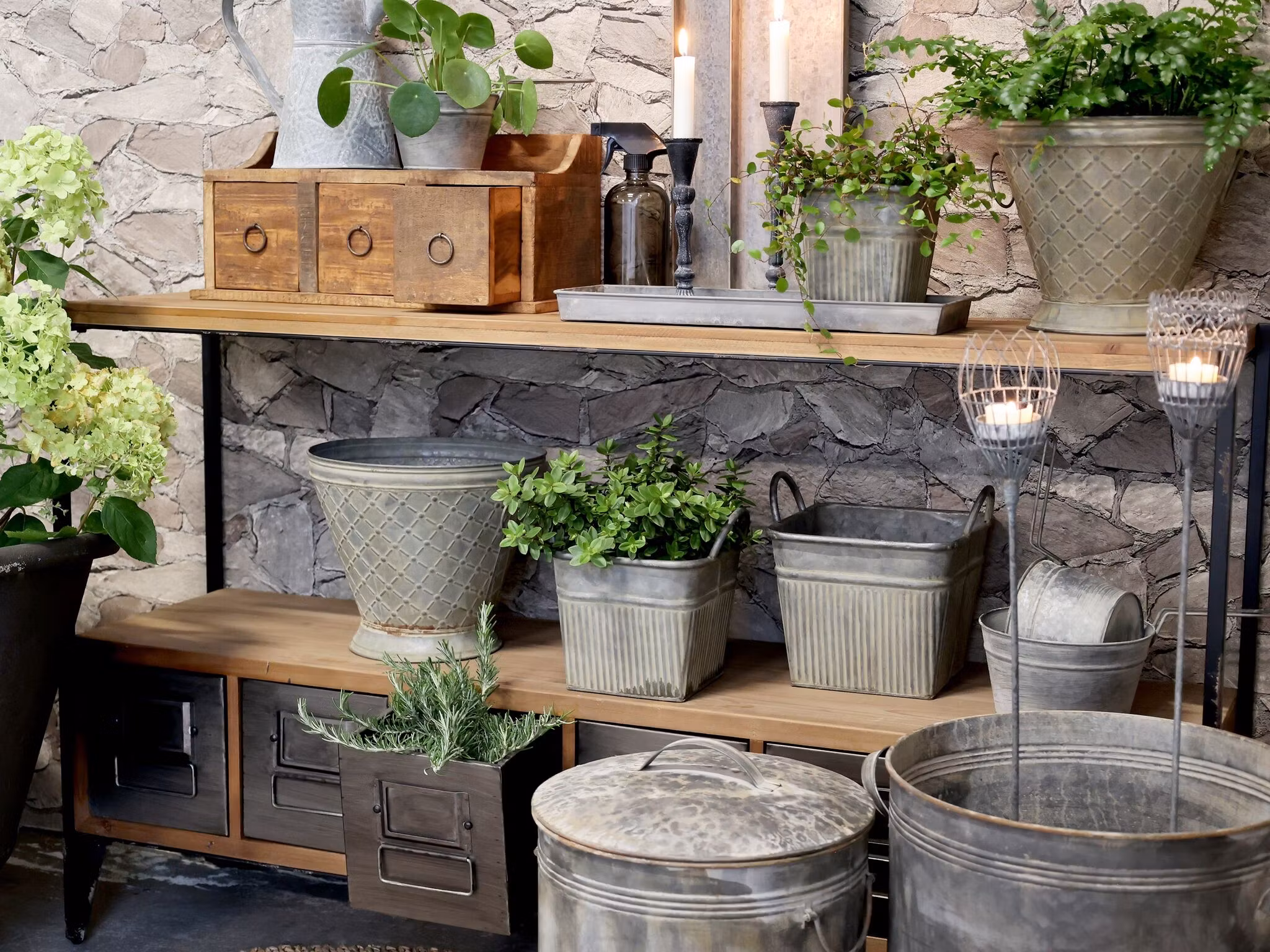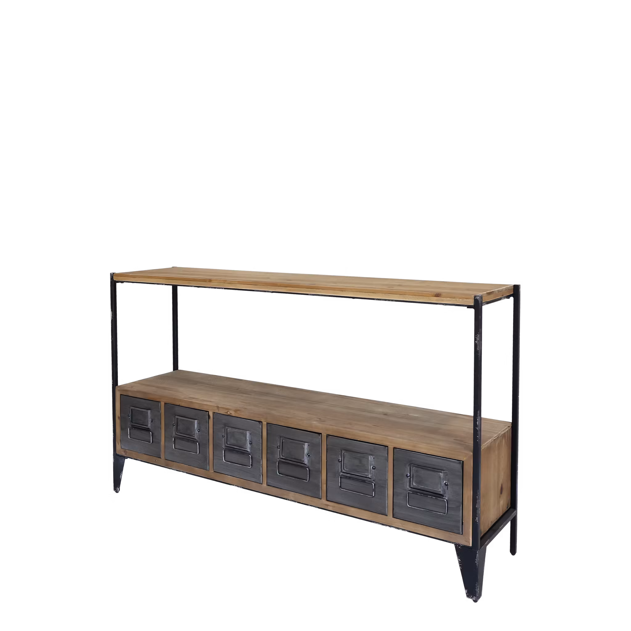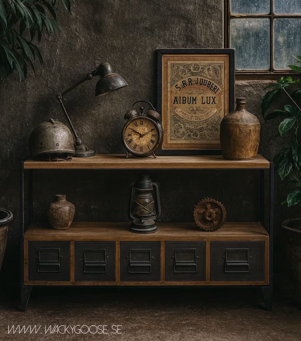En vacker och praktisk handgjord sidoskänk med lådor och hyllplan som ger gott om förvaringsmöjligheter. Tillverkad i robust trä och järn med en rustik finish som framhäver träets naturliga ådringar och unika karaktär.