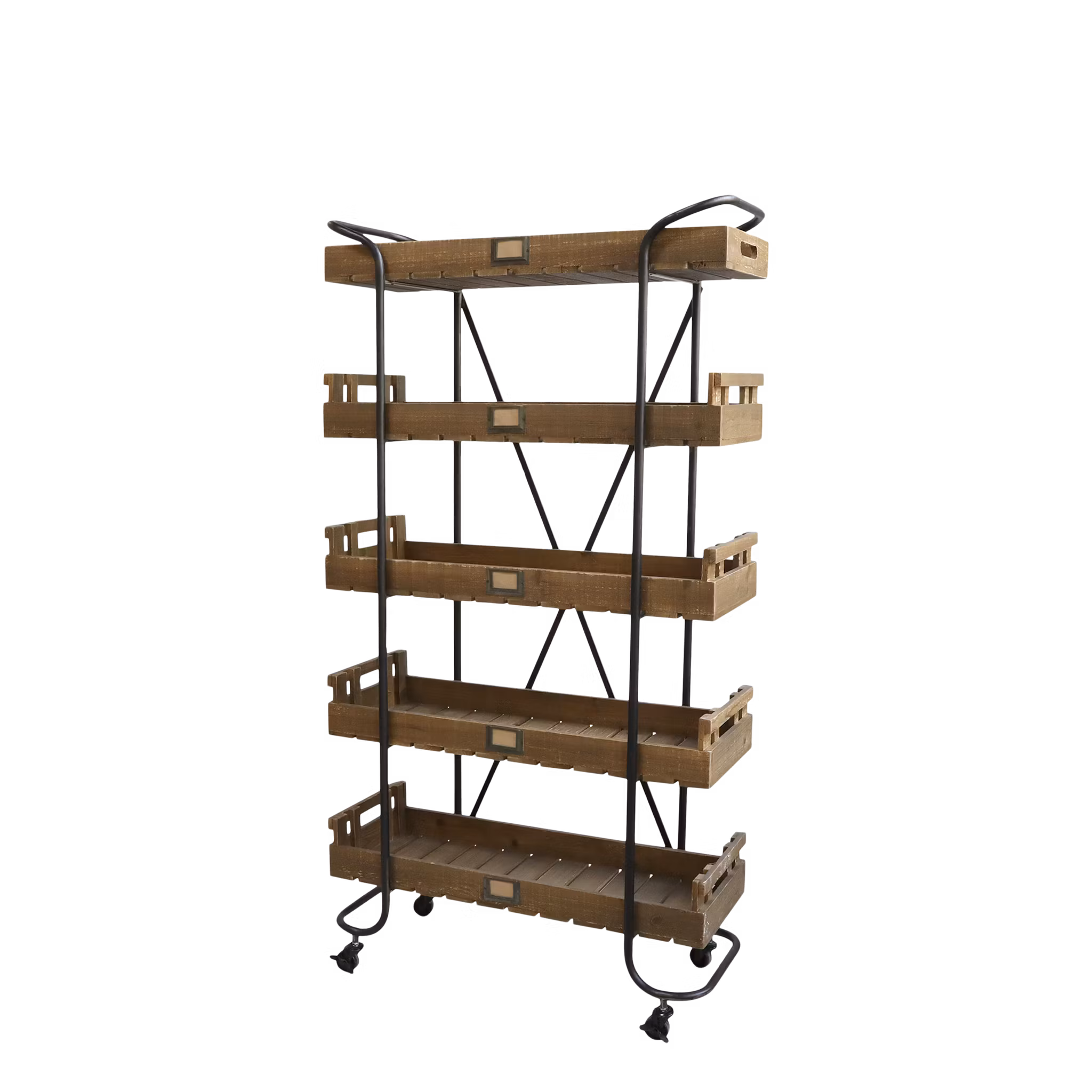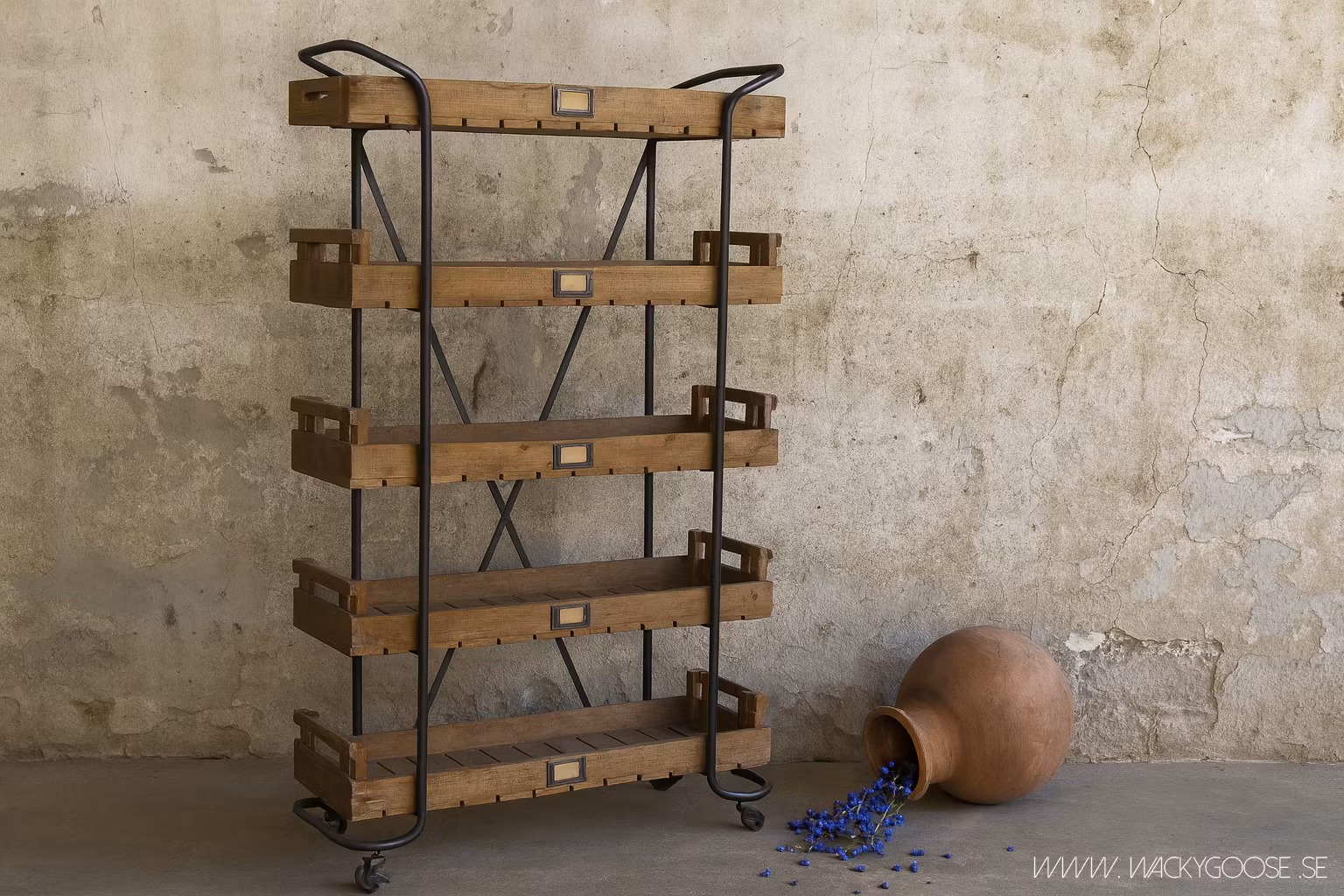 Få in både charm och funktionalitet i ditt hem med denna vackra vagn på hjul. Vagnen är tillverkad av massivt trä i kombination med en robust järnram, vilket ger den en rustik finish som utstrålar värme och karaktär. De naturliga träfacken i kombination med det råa järnet skapar en tidlös möbel som passar perfekt in i många olika interiörer - från industriella loft till mysiga lantliga hem.