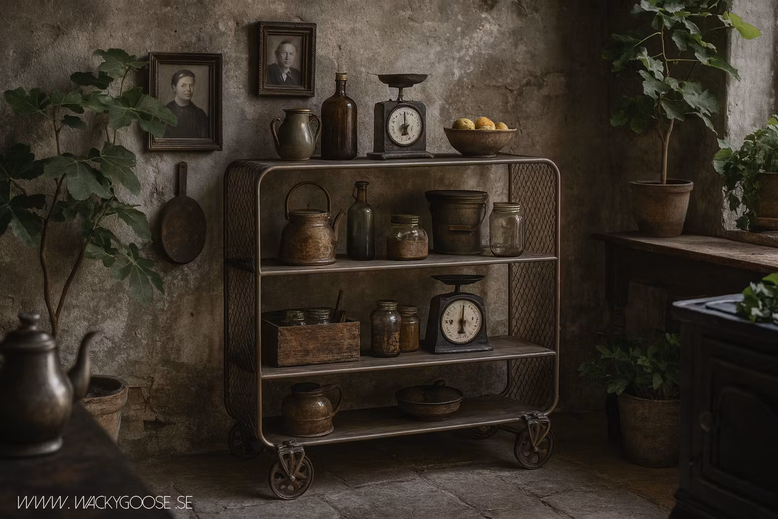 En stilren och robust industriell hylla på hjul med hyllplan som kombinerar funktion och design. Tillverkad i hållbart järn för lång livslängd och med en elegant, rustik finish som ger karaktär åt rummet.