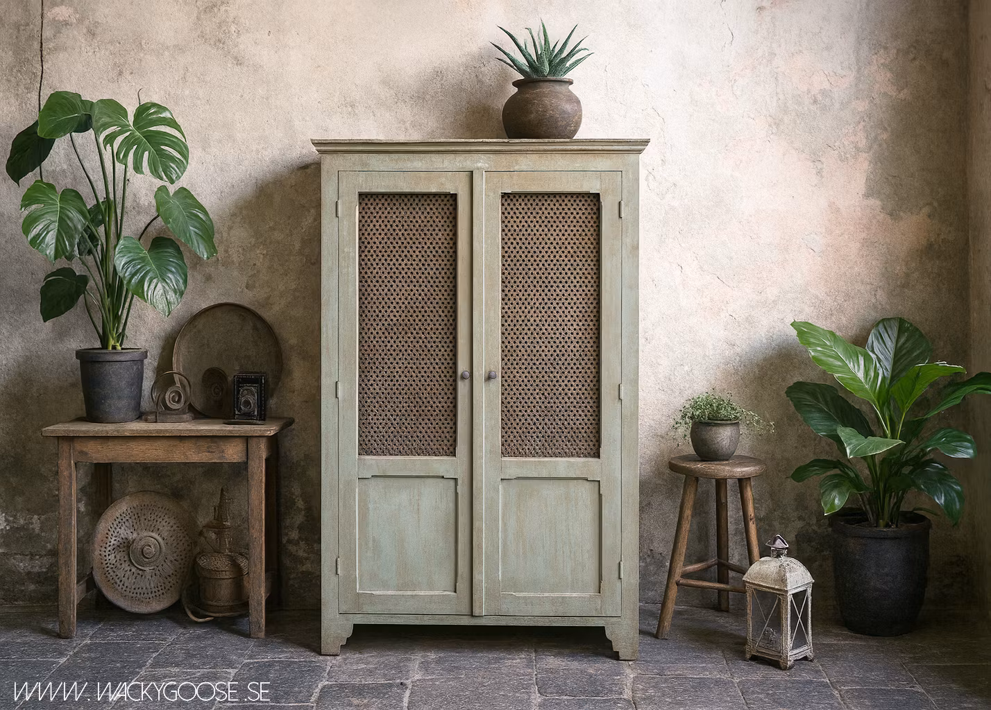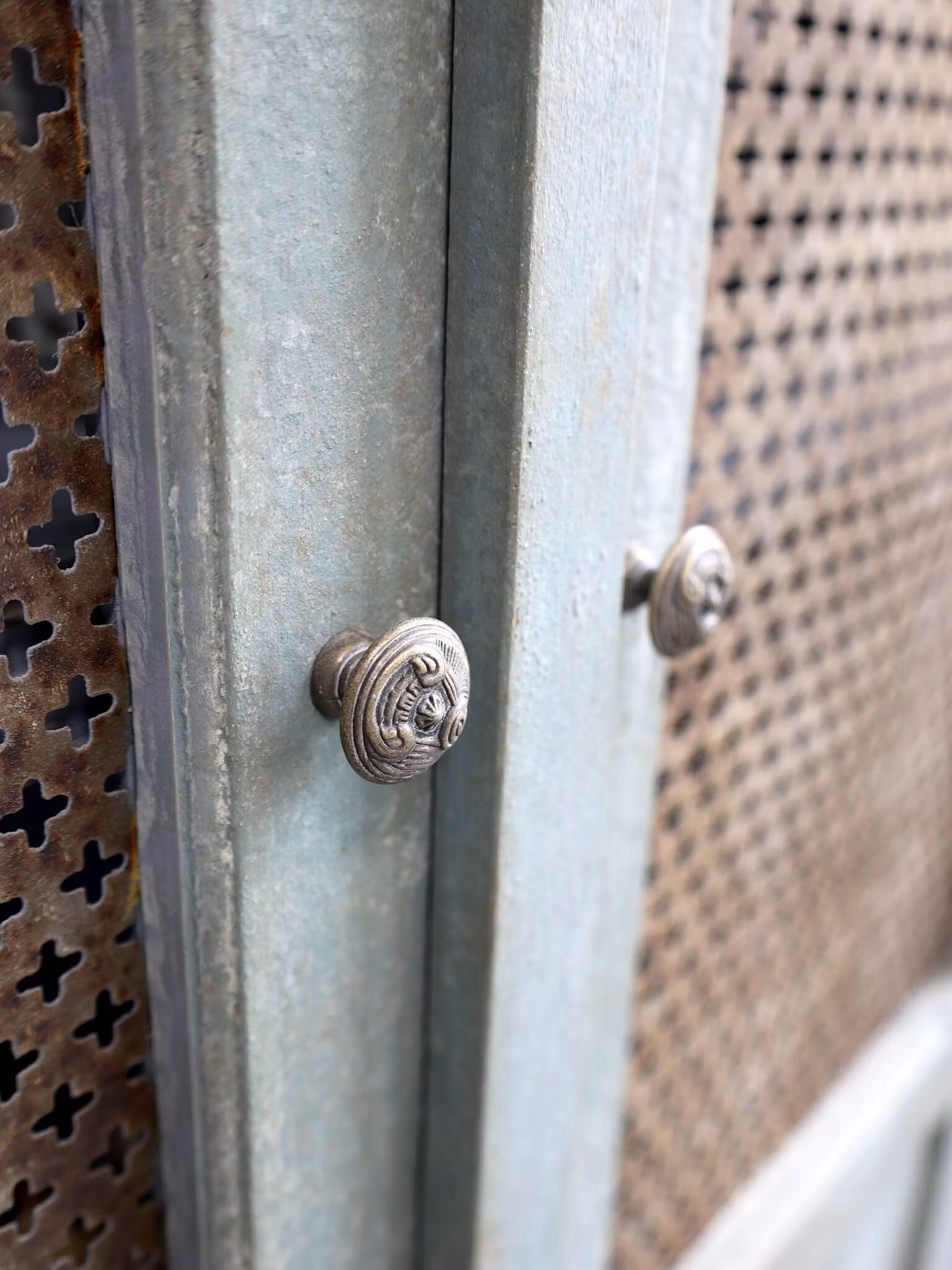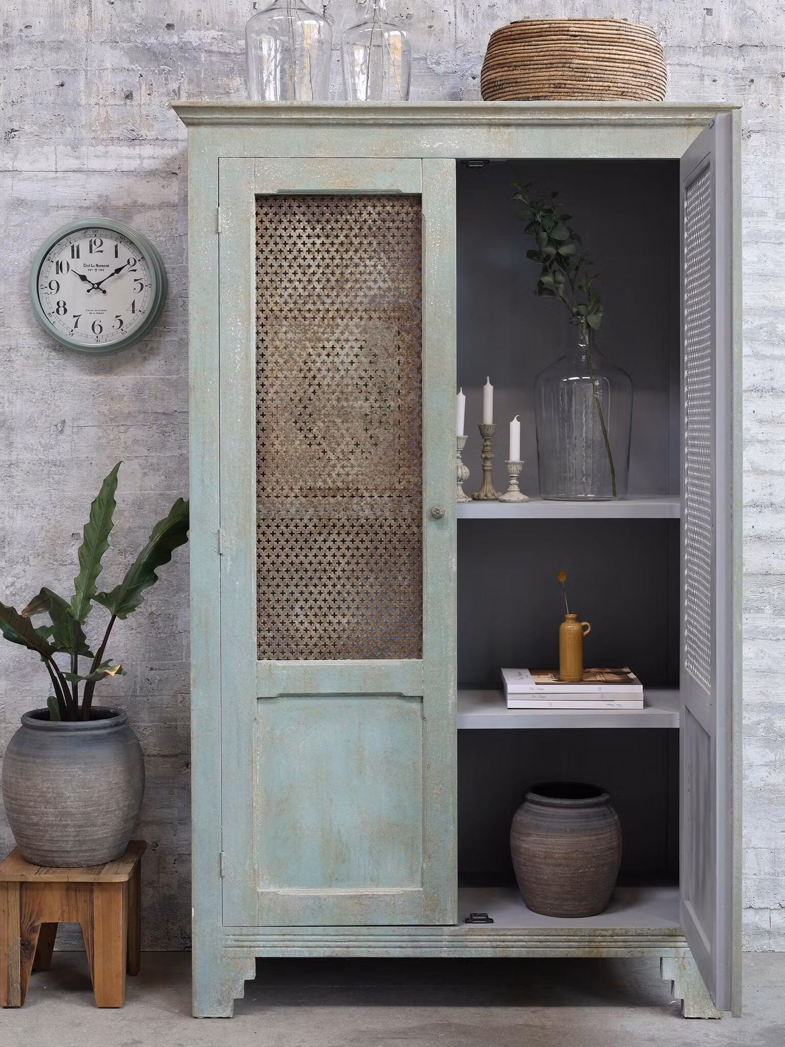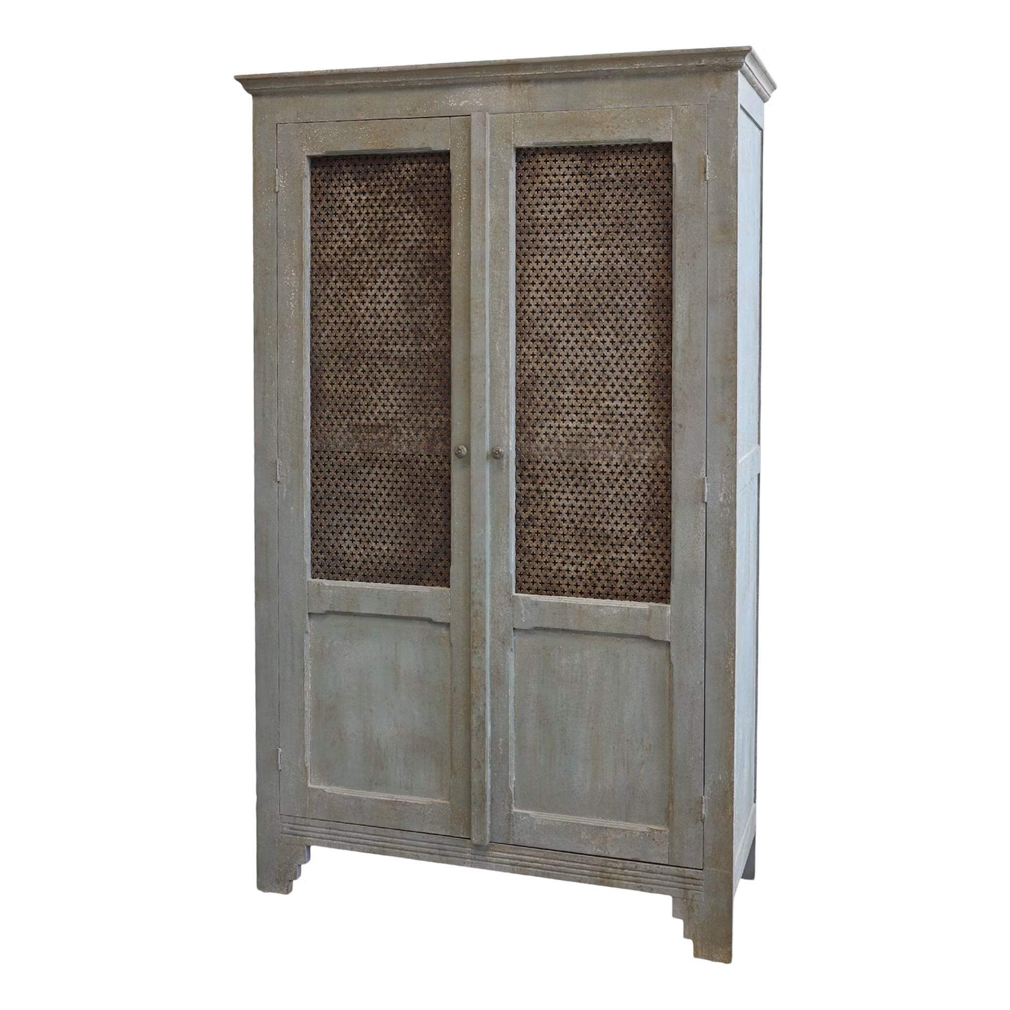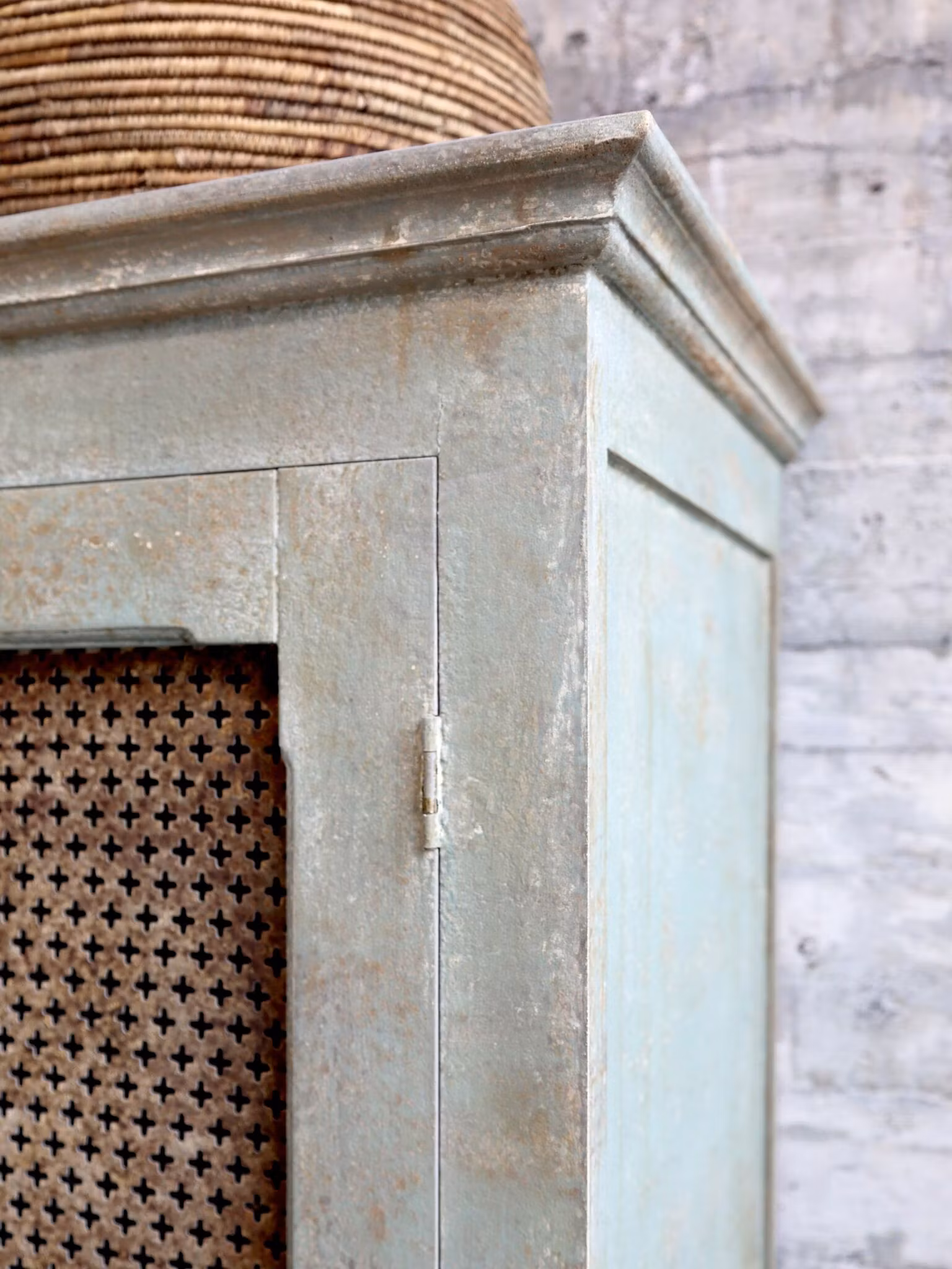 Ett elegant linneskåp i fransk lantstil som kobinerar lantlig charm med subtila industriella inslag. Skåpet är tillverkat i en harmonisk blandning av trä och dekorativa metallinslag i dörrarna som ger en unik och karaktärsfull touch.