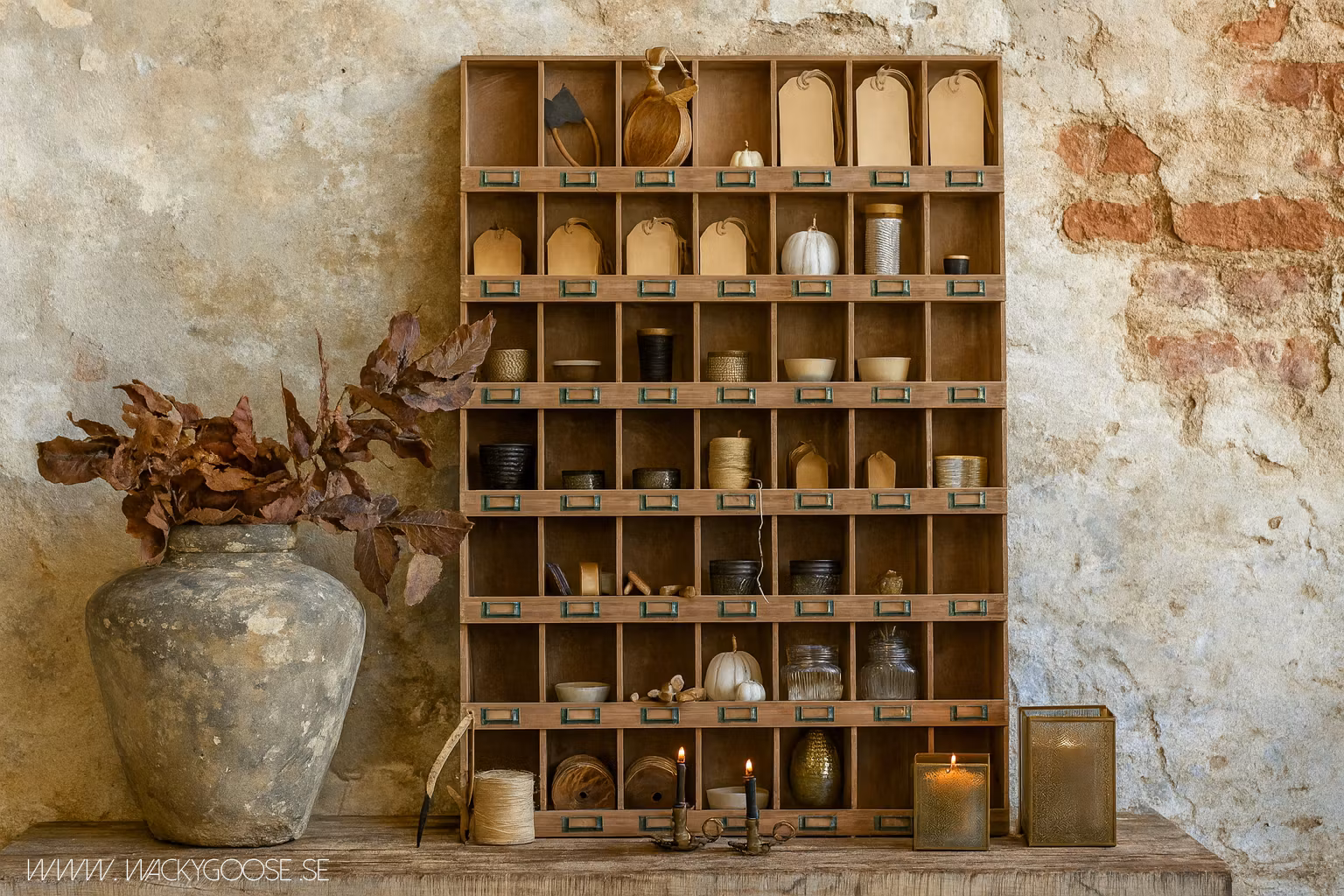 En charmig och funktionell prylhylla i rustik träfinish med många praktiska fack för både dekoration och förvaring. Perfekt för att visa upp samlarföremål, kryddor, verktyg, pysselmaterial eller andra småsaker som förtjänar en egen plats.