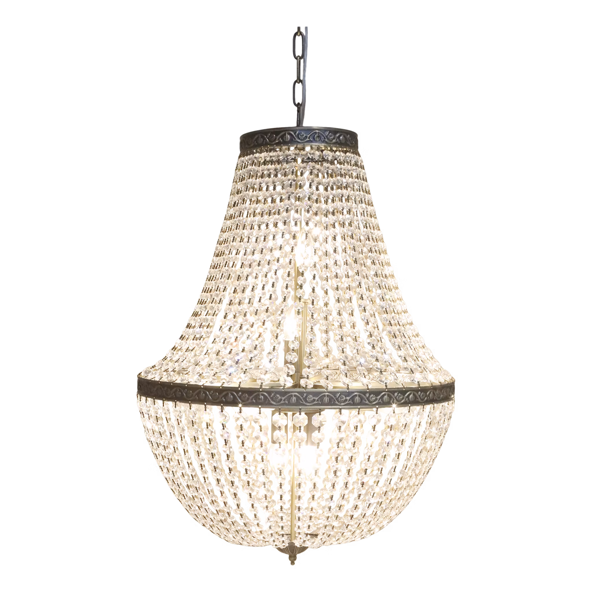 En imponerande takkrona i klassisk form. Den generösa höjden på 75 cm och diameter på 55cm gör den till en riktig statement-lampa, perfekt för att hänga över matbordet, i vardagsrummet eller i en rymlig hall.