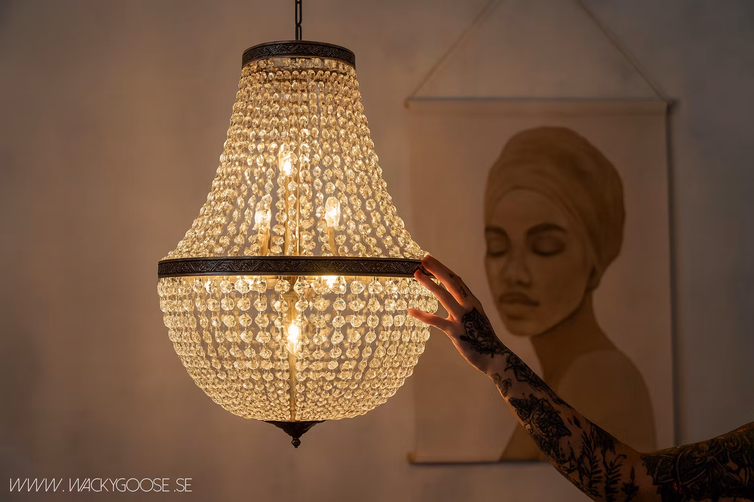 De vackra glasprismorna skapar ett levande ljusspel när lampan är tänd. Designen kombinerar rustik charm med en modern bohemisk känsla, vilket gör att den smälter in i många inredningsstilar.