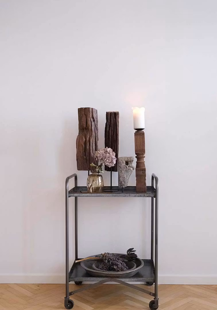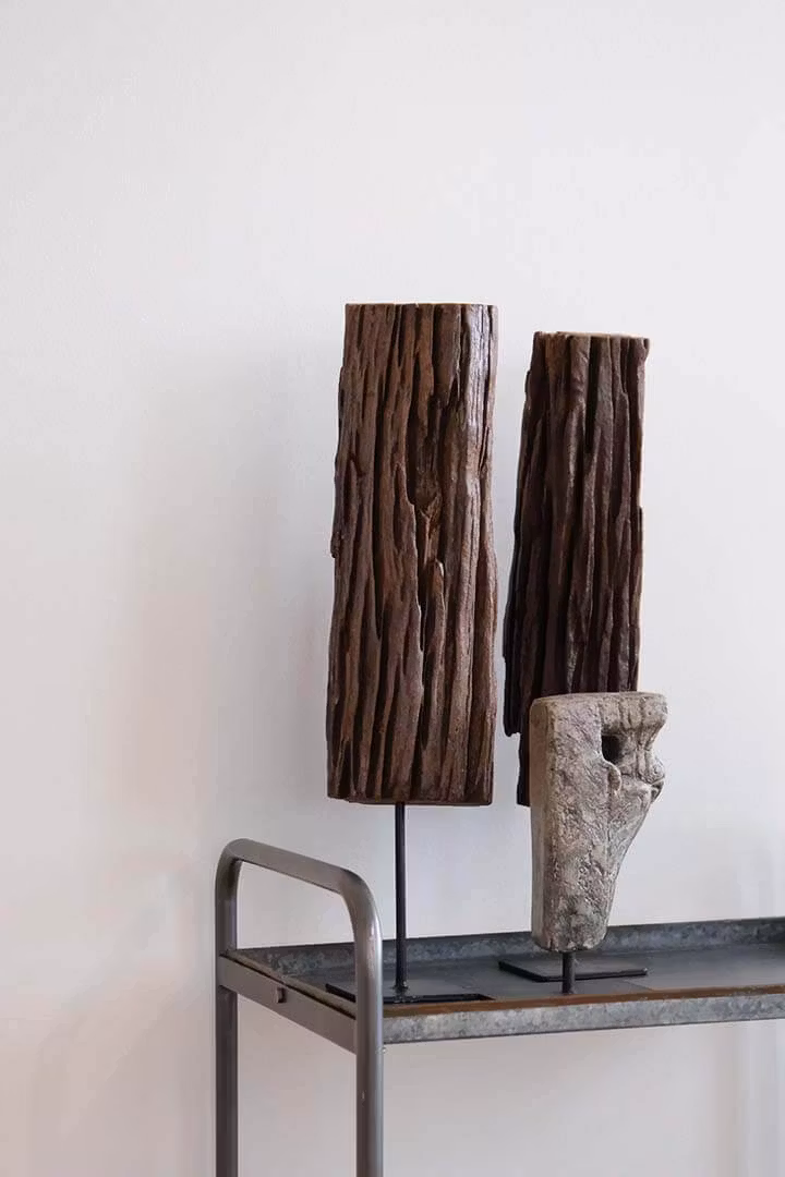 Dekorativ träskulptur på järnfot. Skulpturen är ett stort unikt stycke gammalt trä med finaste struktur och patina.