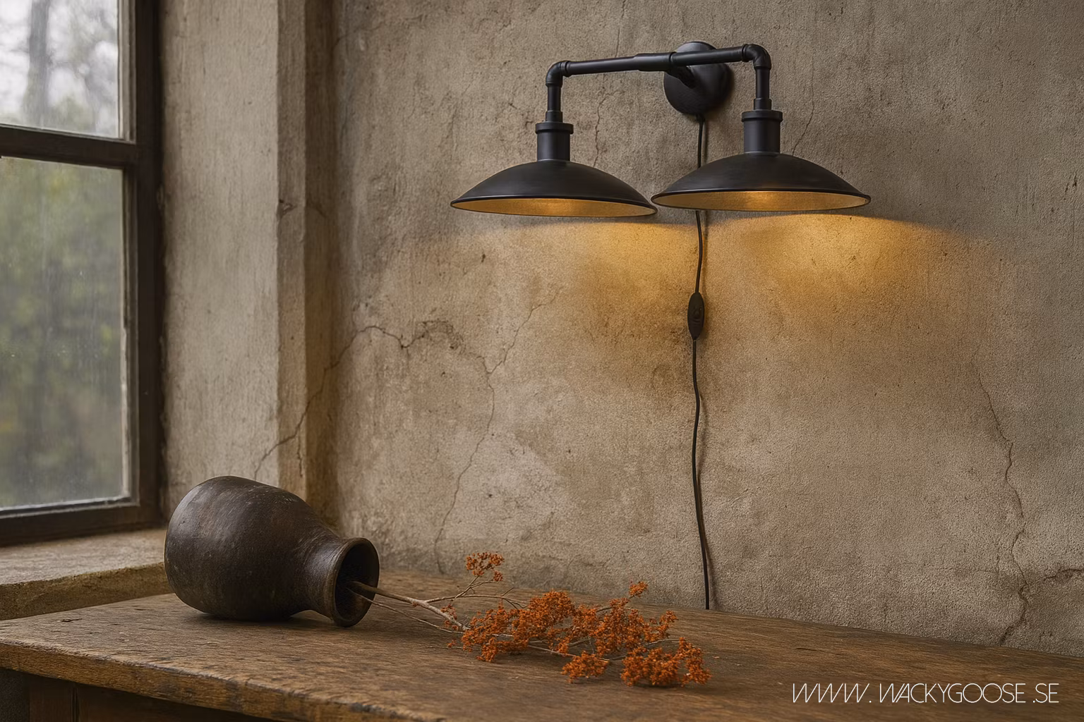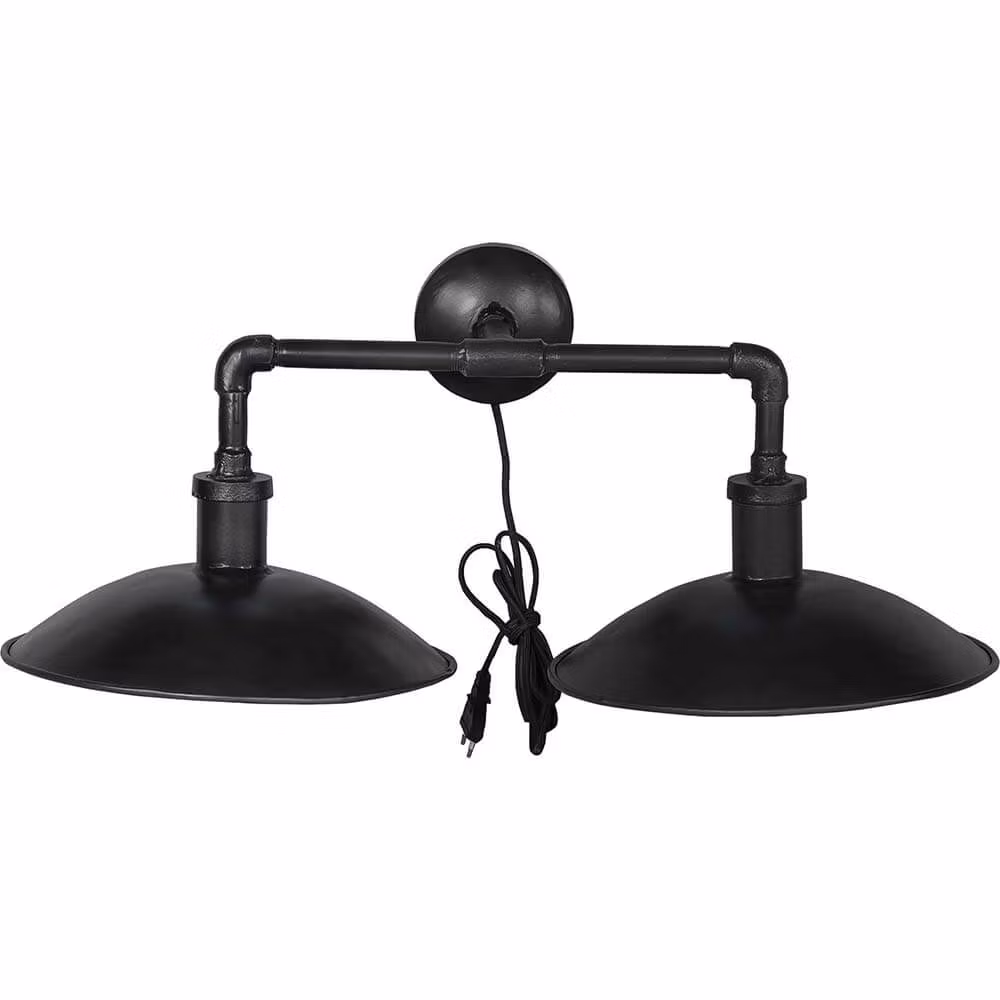 Denna dubbelvägglampa i mörk järnfärg är ett perfekt exempel på industriell charm och funktionalitet. Lampans två metallskärmar är monterade på en rörinspirerad ram, vilket ger den ett rått och autentiskt utseende.