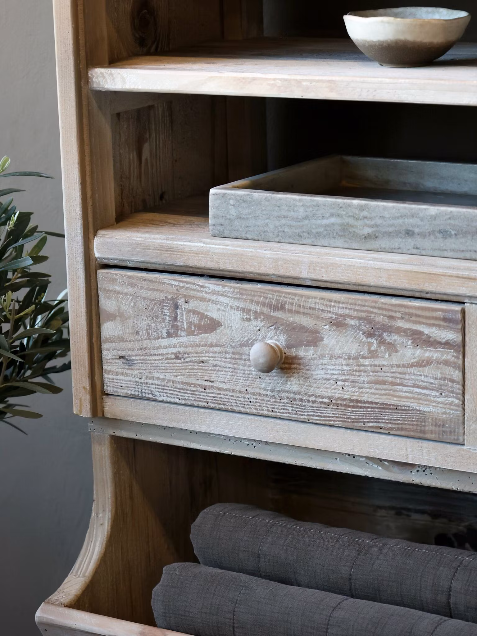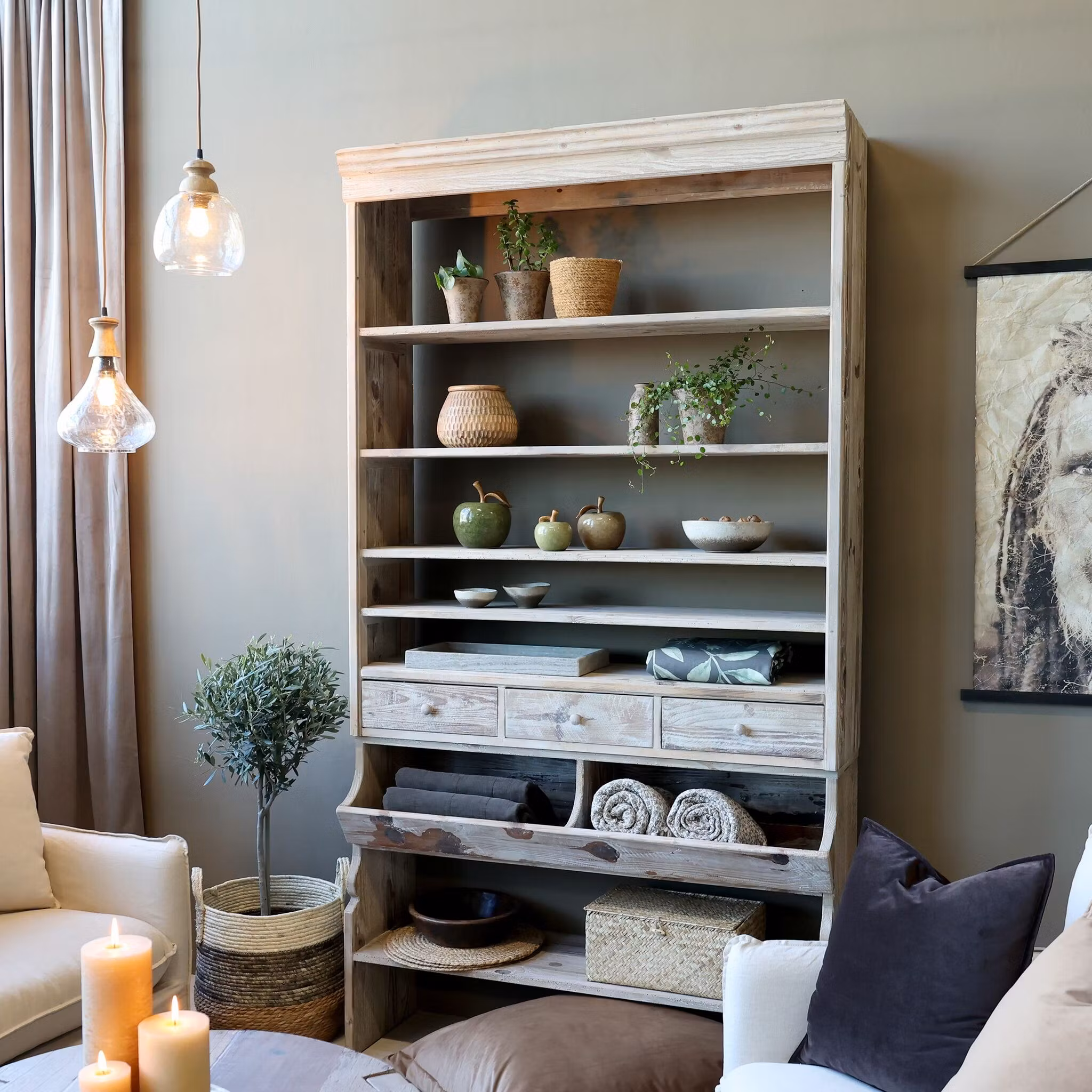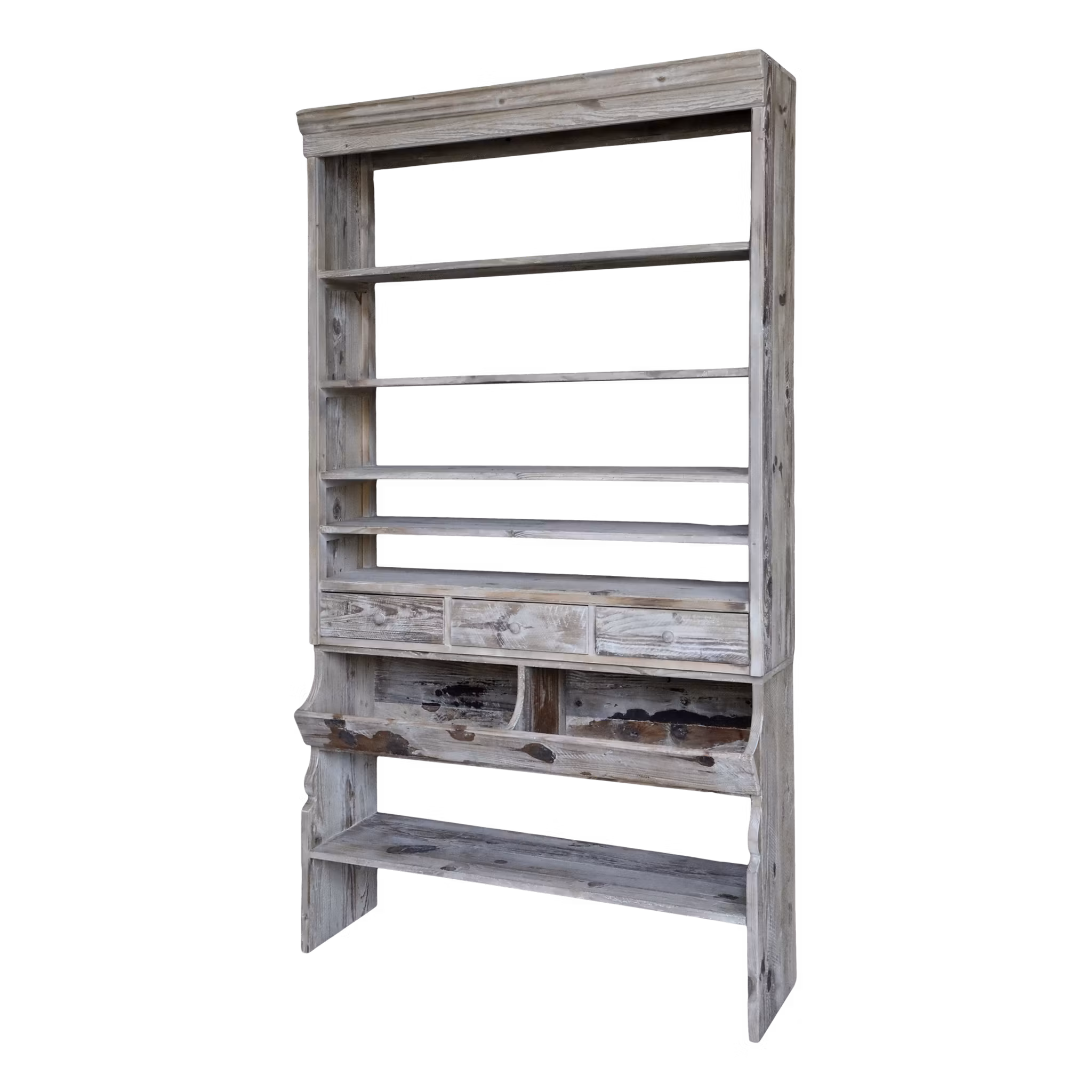 En imponerande och rejäl hylla i antik design som kombinerar klassiskt hantverk med tidlös funktionalitet. Med hela 222cm på höjden ger den gott om plats för både förvaring och dekoration, samtidigt som den blir en elegant inredningsdetalj.