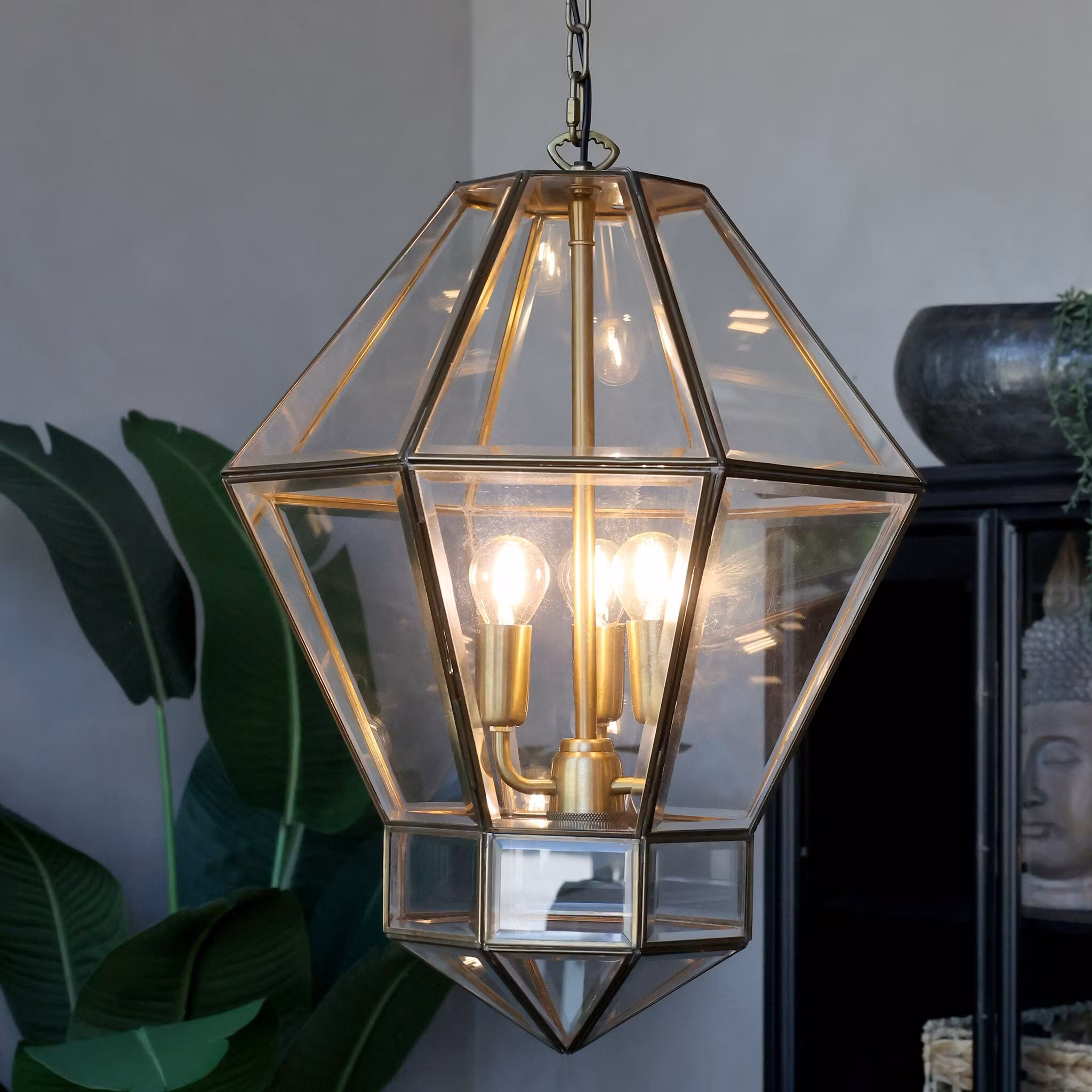 En elegant takkrona i glas och järn som kombinerar klassisk charm med modern enkelhet. Den geometriska designen med glaspartier ger ett luftigt och sofistikerat uttryck, medan järndetaljerna skapar en vacker kontrast. Ljuset sprider sig mjukt genom glaset och ger rummet en varm och inbjudande atmosfär.